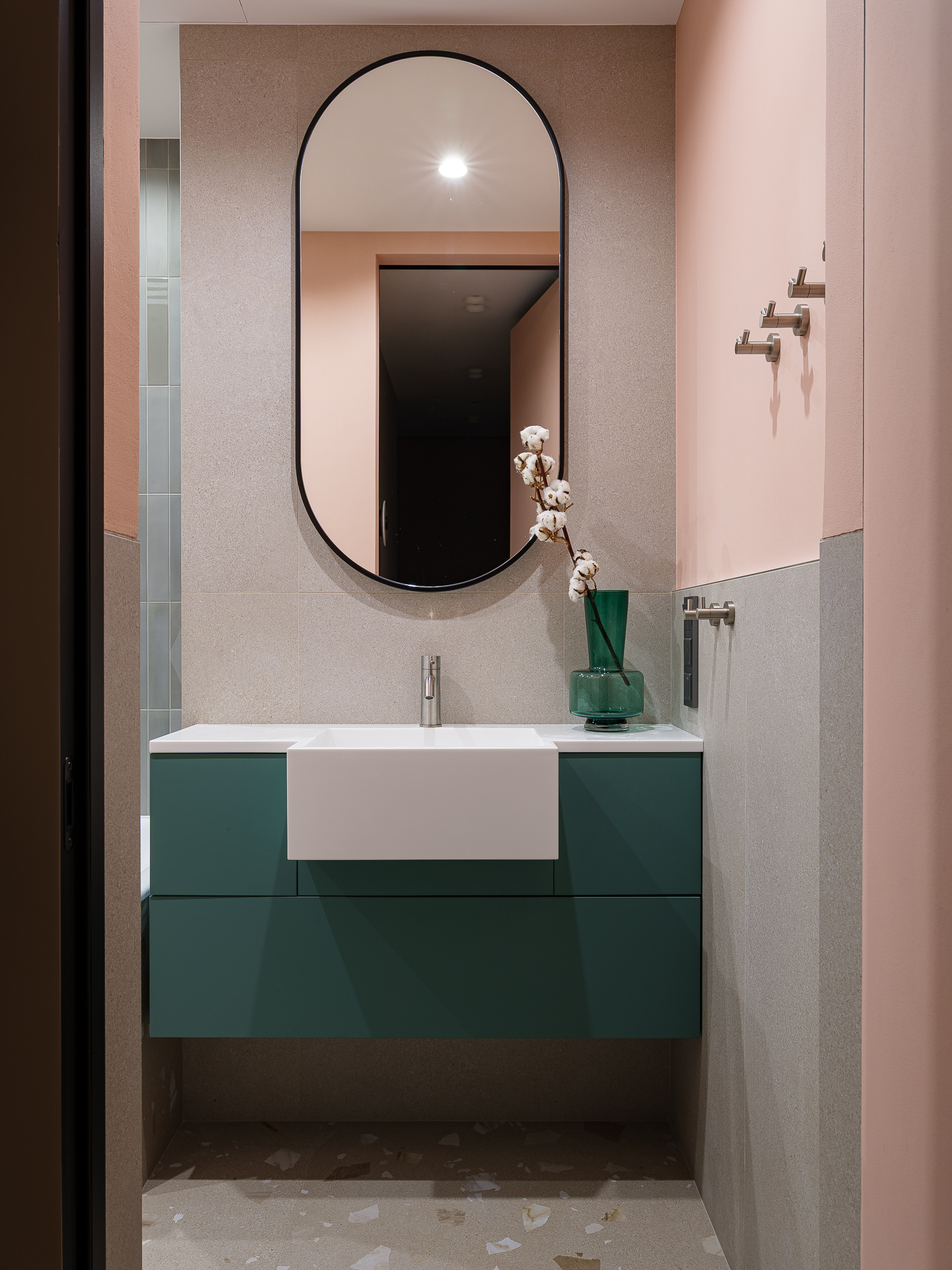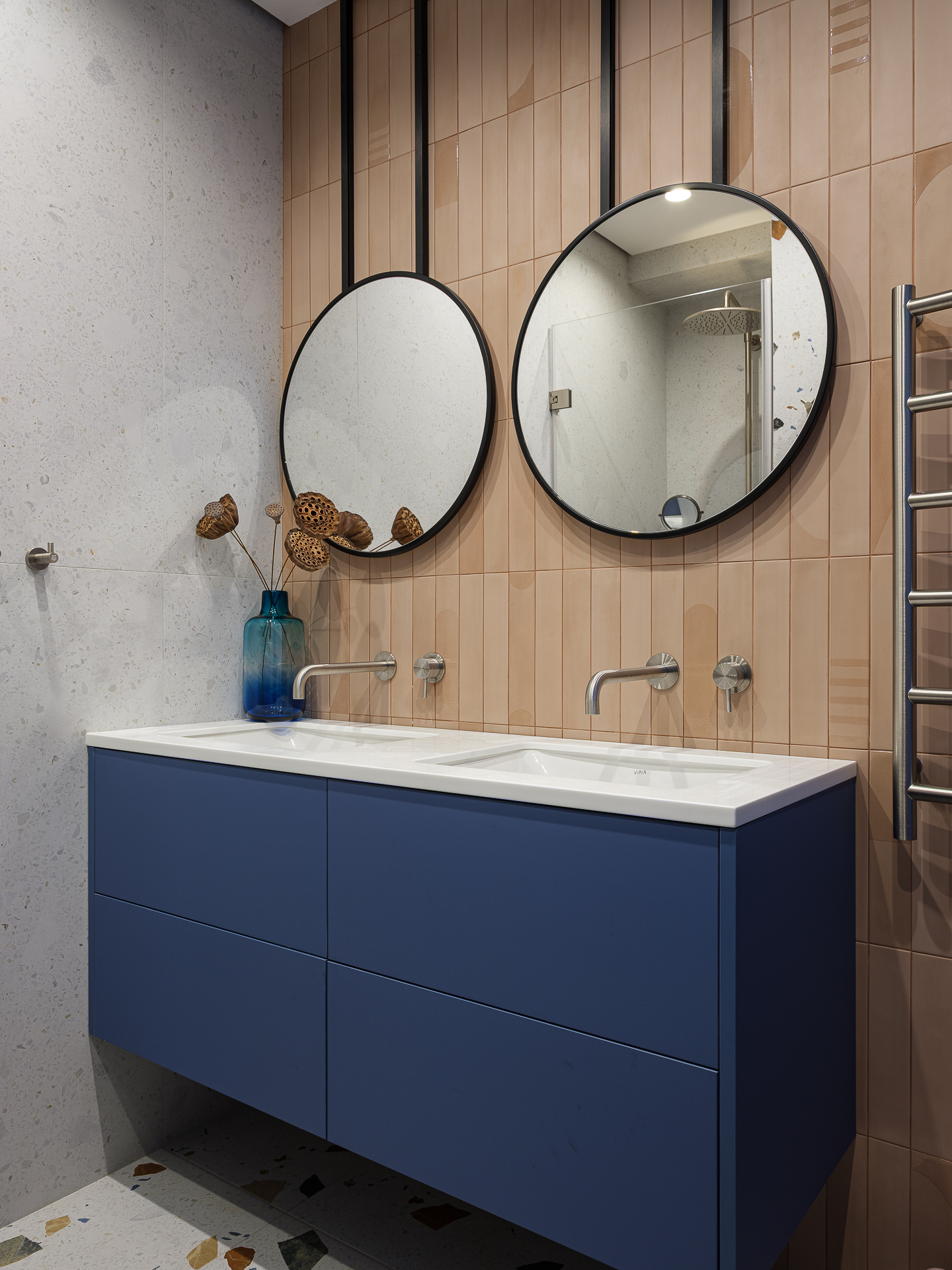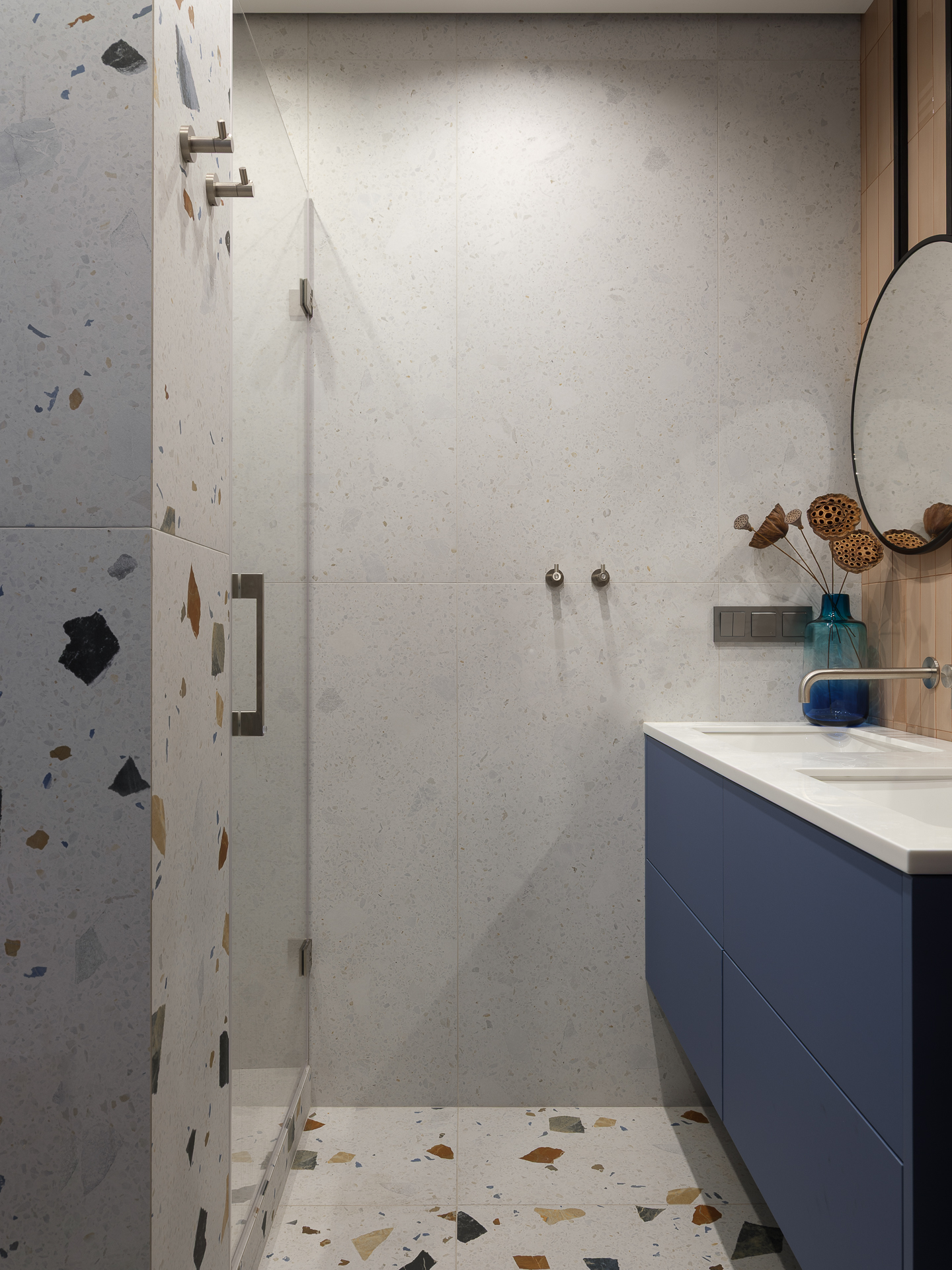 Детский санузел выполнен в фисташковом цвете с применением плитки под Terrazzo. Мы разместили две раковины и, соответственно, два свисающих круглых зеркала над ними, чтобы подчеркнуть концепцию современного стиля.