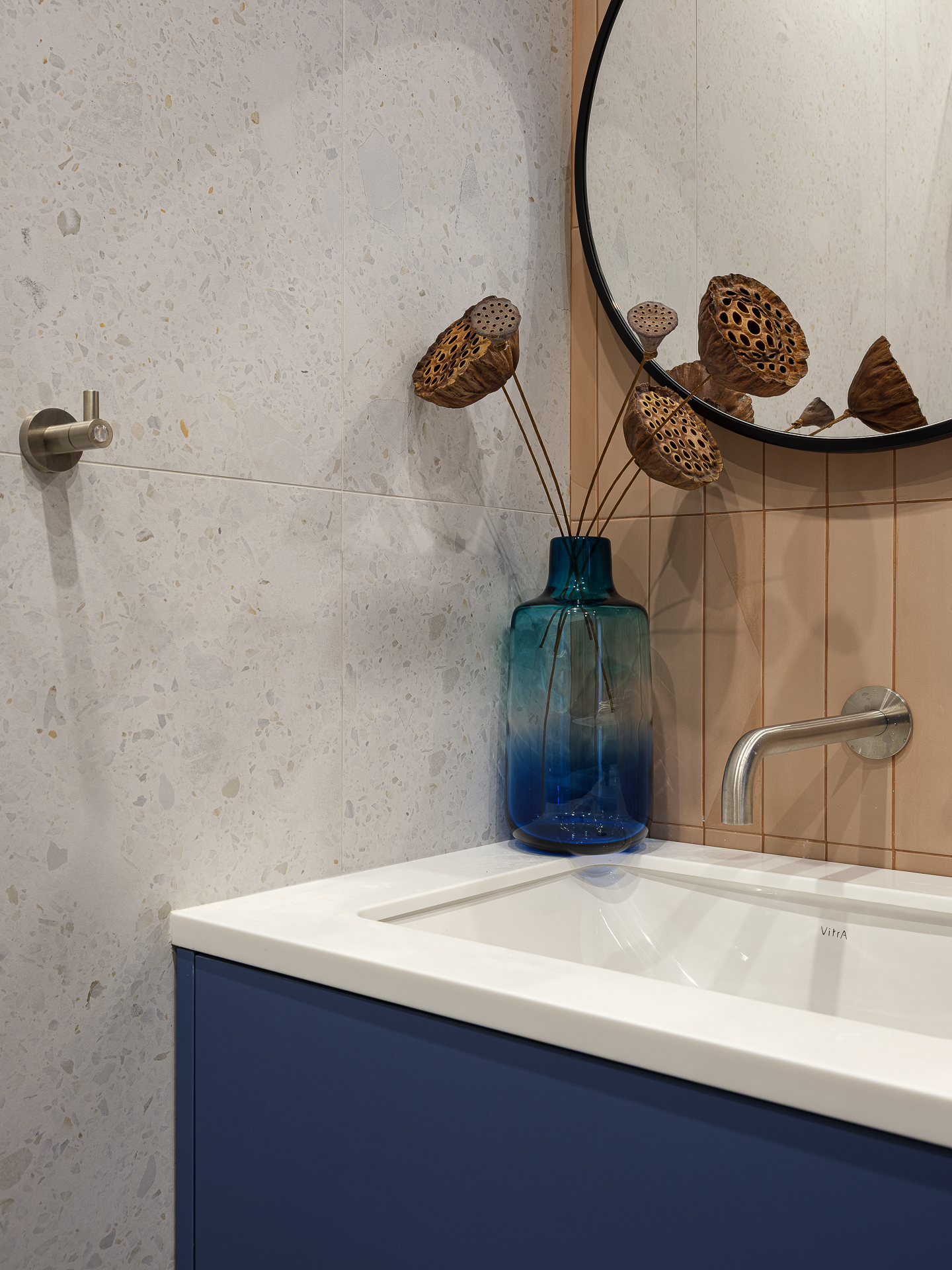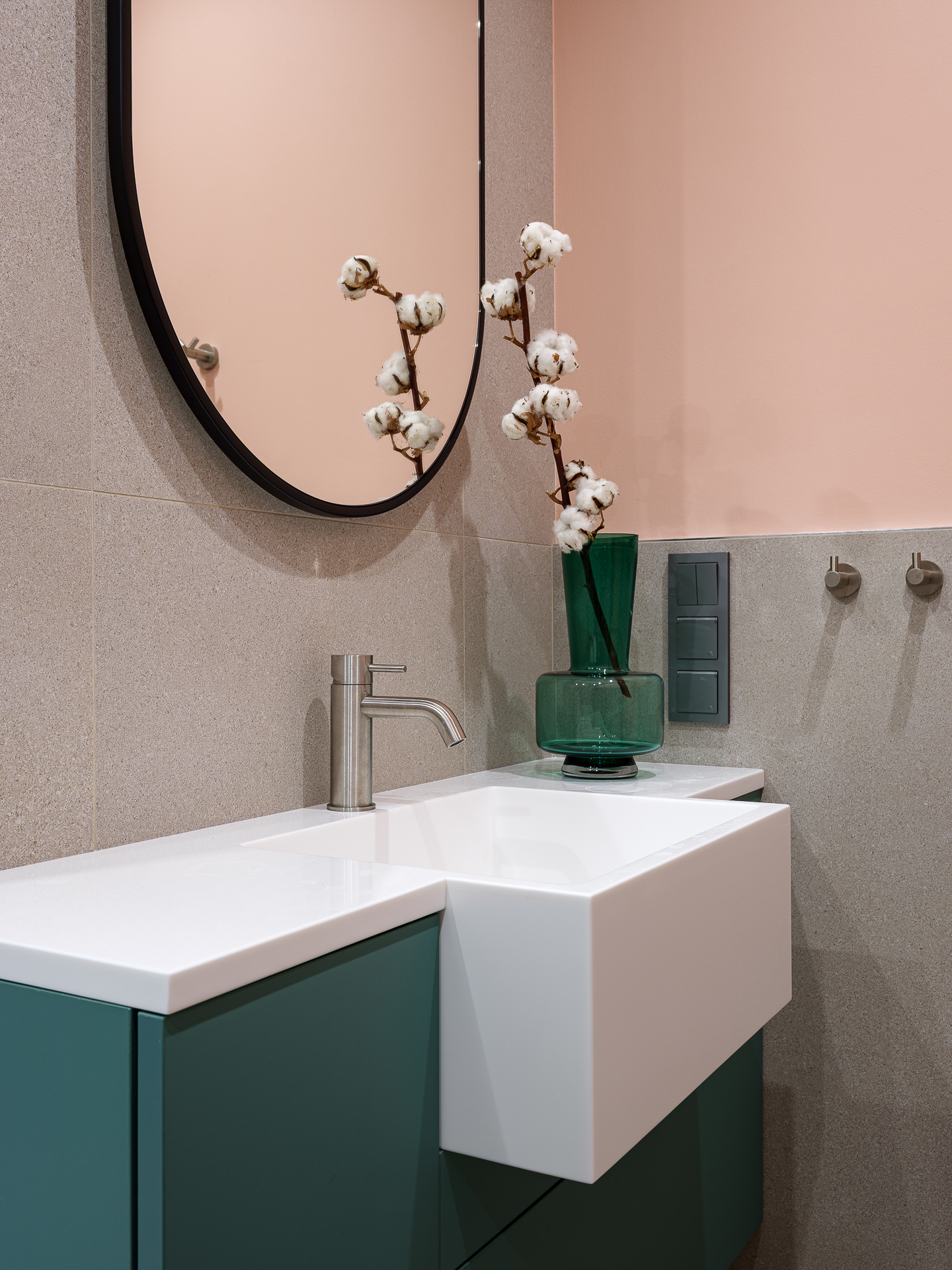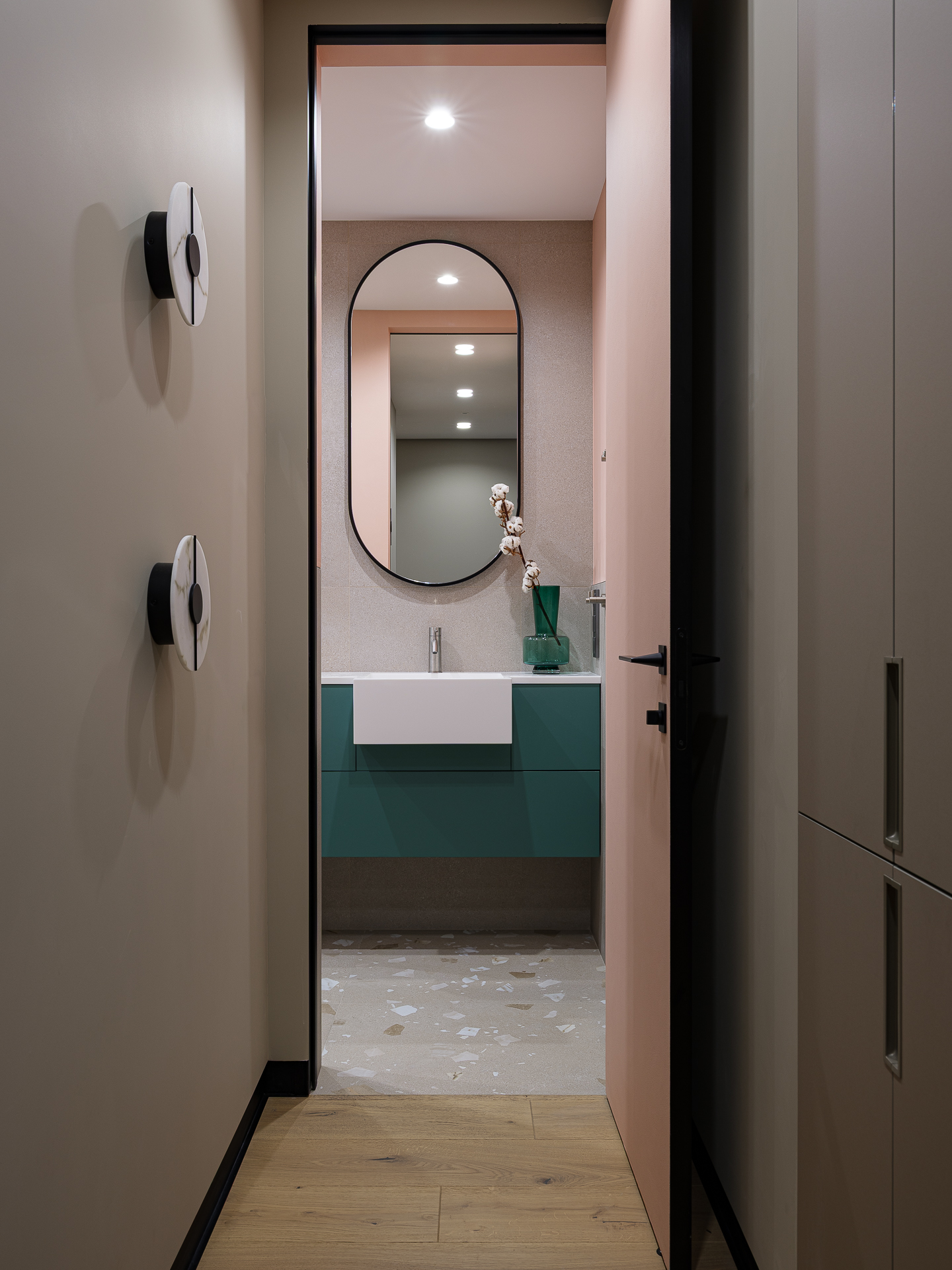 Детский санузел выполнен в фисташковом цвете с применением плитки под Terrazzo. Мы разместили две раковины и, соответственно, два свисающих круглых зеркала над ними, чтобы подчеркнуть концепцию современного стиля.
