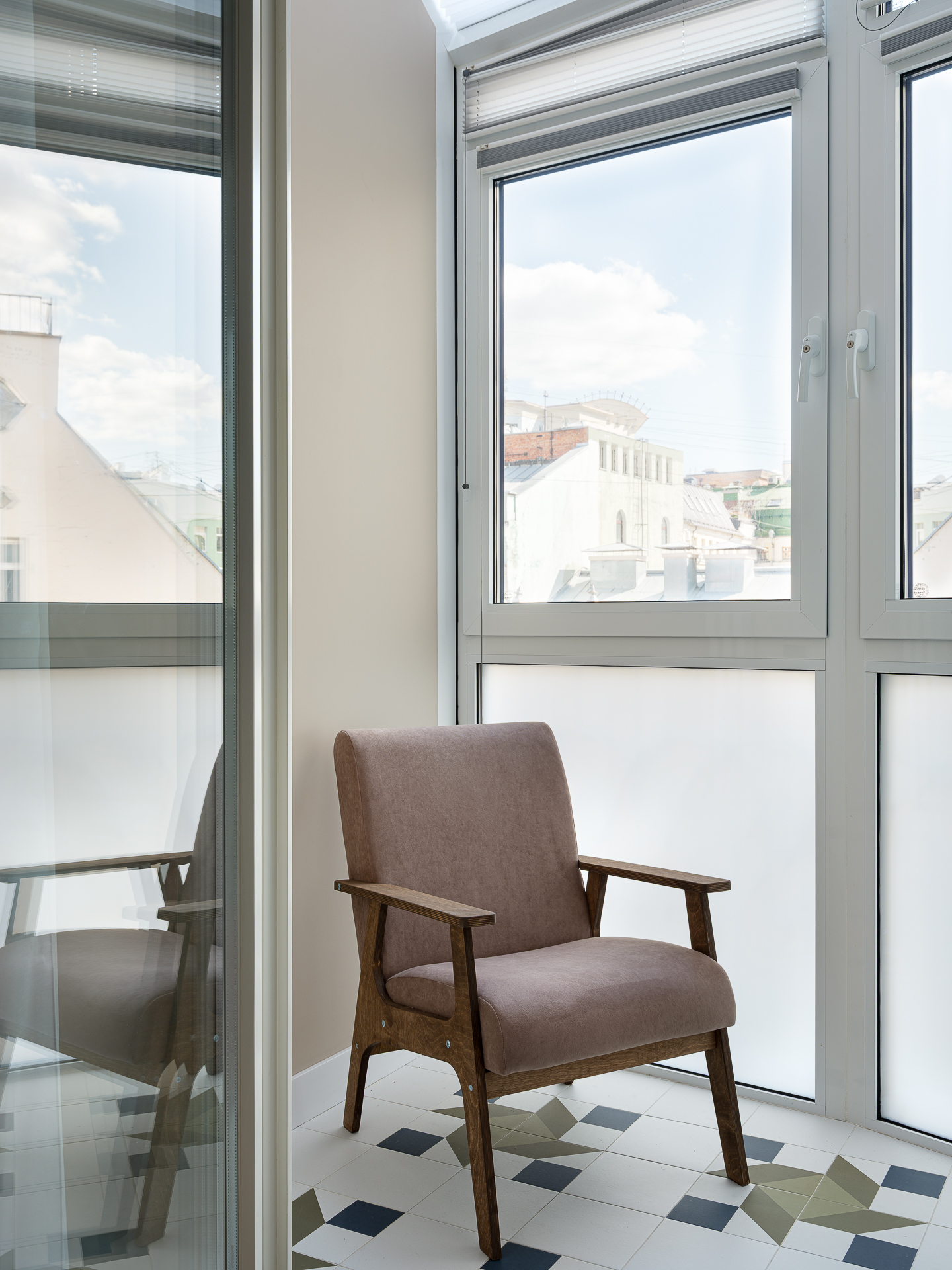 Кабинет получился сдержанным лаконичным пространством, выполненным в свело-коричневых тонах. Акцентом служит кожаное массажное кресло, где можно отдохнуть после рабочего дня.