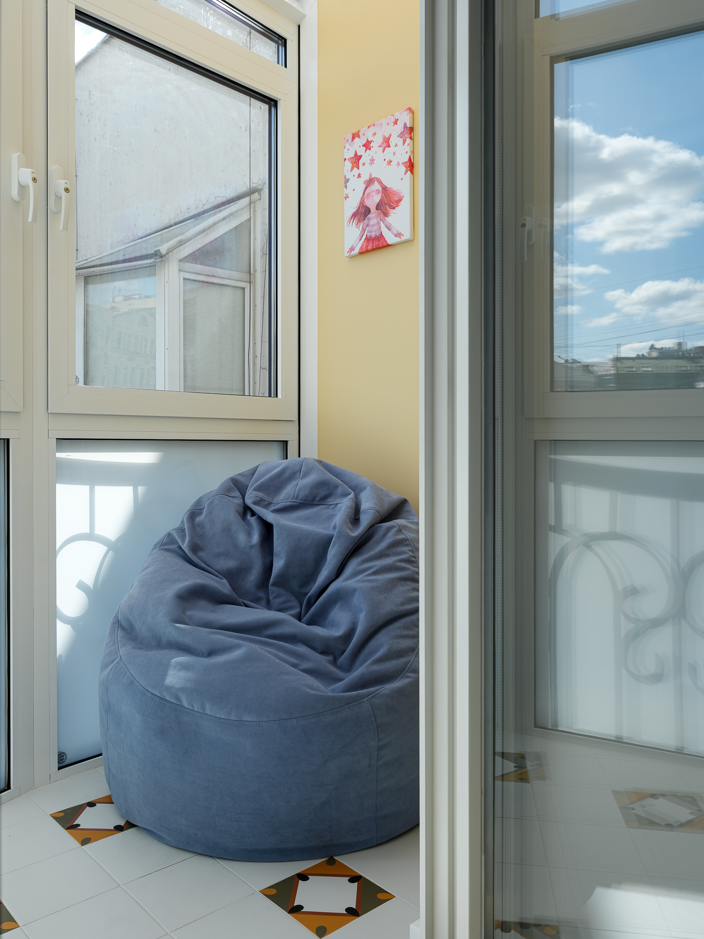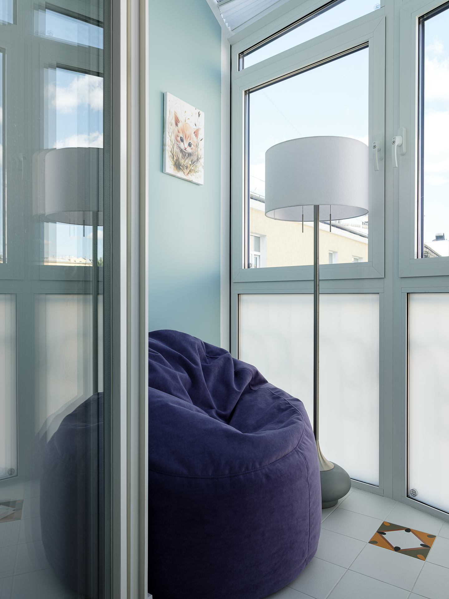 Лоджии, также как и детские выполнены в едином дизайне. единственное различие - это цветовое решение лоджий. Здесь мы применили голубой, розовый и светло-бежевый.