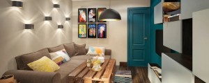 Гостиная так же компактна, как и остальные помещения. Тут главенствует насыщенный аквамариновый цвет, поддержанный голубым и шоколадным. Мебель выбиралась бюджетная, из ассортимента ИКЕА, на которую не жалко пролить вино или отдать на растерзание коту, зато декору уделено большое внимание. Кресло должно быть оригинальным, как и столик и табурет - все эти предметы будут искаться на гаражных распродажах. Свет также немаловажен - бра за спинкой дивана не просто задают настроение всему помещению.