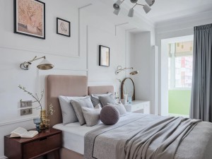Главный декоративный элемент в спальне – молдинги из полиуретана, образующие на стенах прихотливый геометричный узор. В них вписаны картины, телевизор, и даже изголовье повторяет форму лепнины. Кровать будет изготовлена под заказ в нужном габарите в серой алькантре на производстве фабрики Vitset. На полу марокканский ковер из шерсти с геометричным узором. Прикроватная тумбочки и комод винтажные. Туалетный столик, по совместительству выполняющий роль второй тумбочки, ИКЕА с замененной фурнитурой; пуф с бахромой To4rooms. Встроенный шкаф в торце комнаты будет сделан под заказ по точным габаритам ниши.