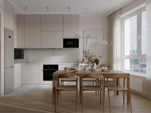Пространство кухни – это светлое свежее пространство, за счет наличия большого окна. Светлые оттенки кухонных фасадов, потолка и пола разбавляется обеденной группой, выполненной из дерева, что добавляет кухне уют.