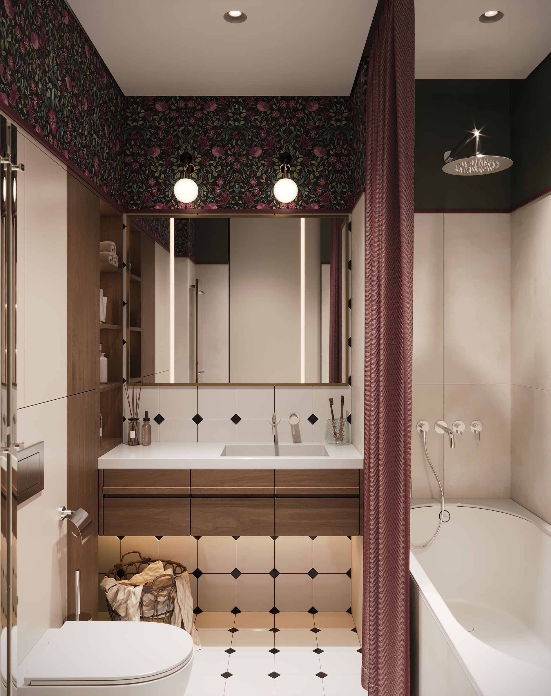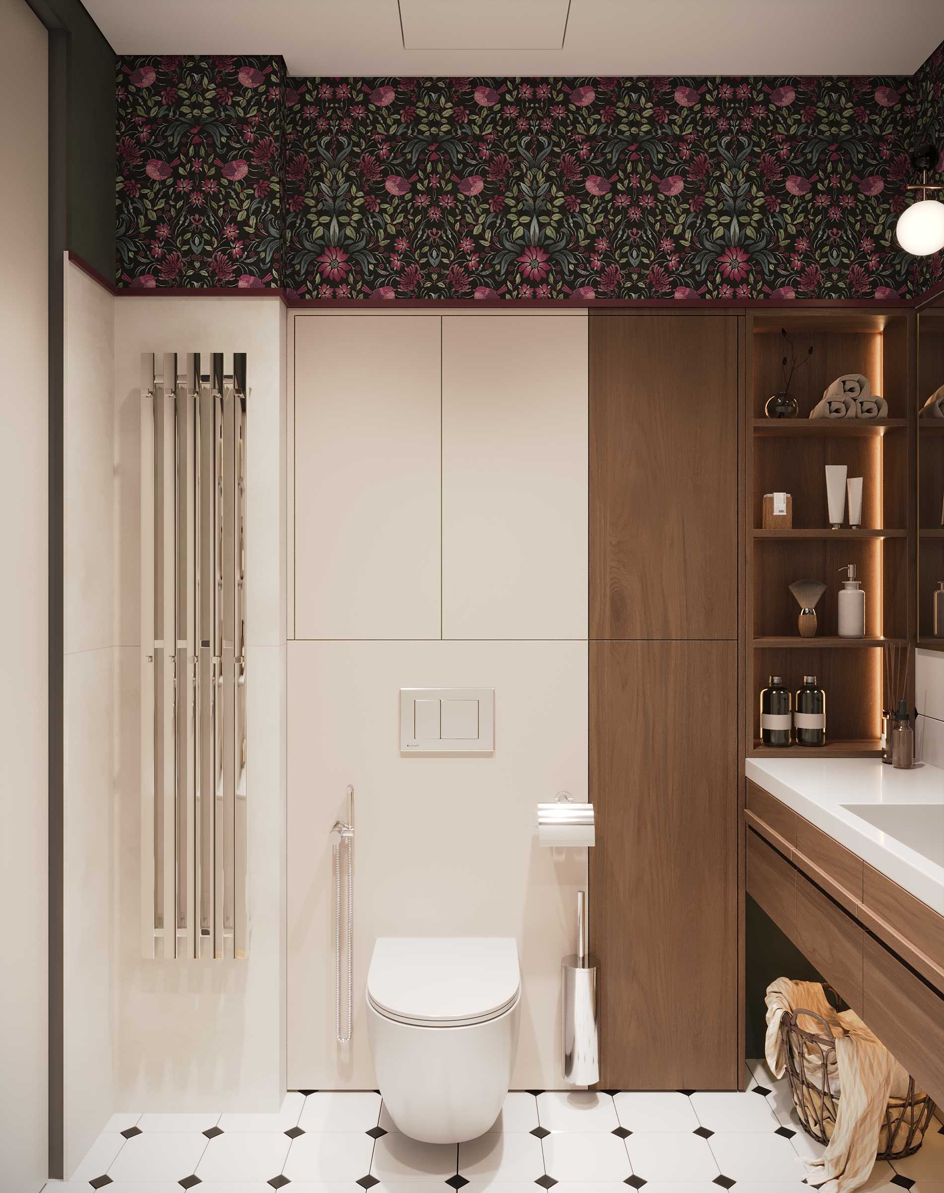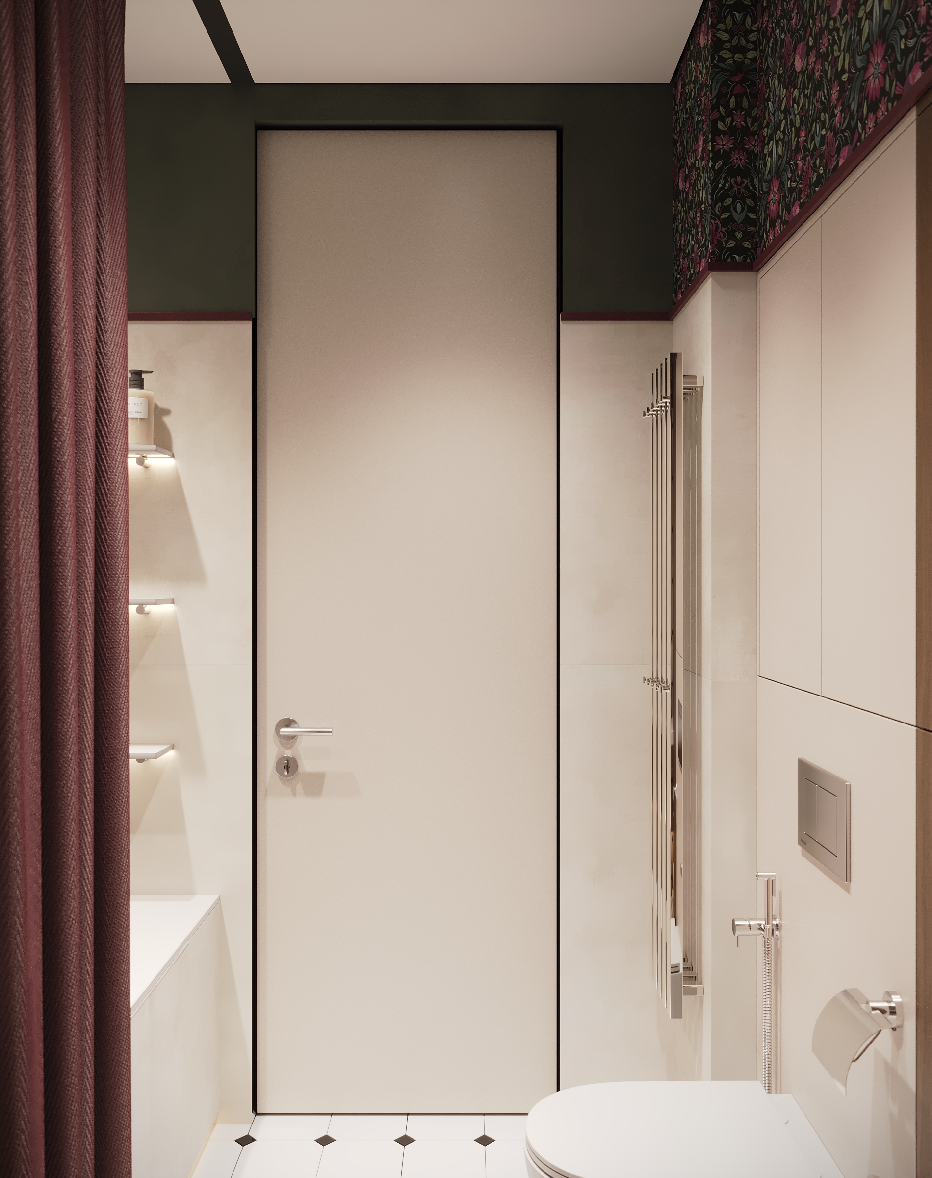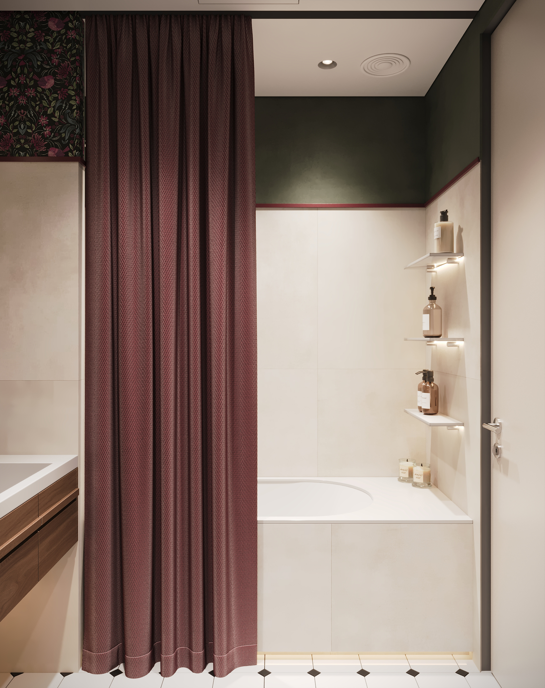 Ванная комната выполнена в современном стиле. Глубокий зелёный оттенок стен гармонично сочетается с белой плиткой и бордовыми деталями, создавая элегантный и выразительный интерьер. Обои с флористическим мотивом и текстиль в винном цвете придают пространству индивидуальность и уют.