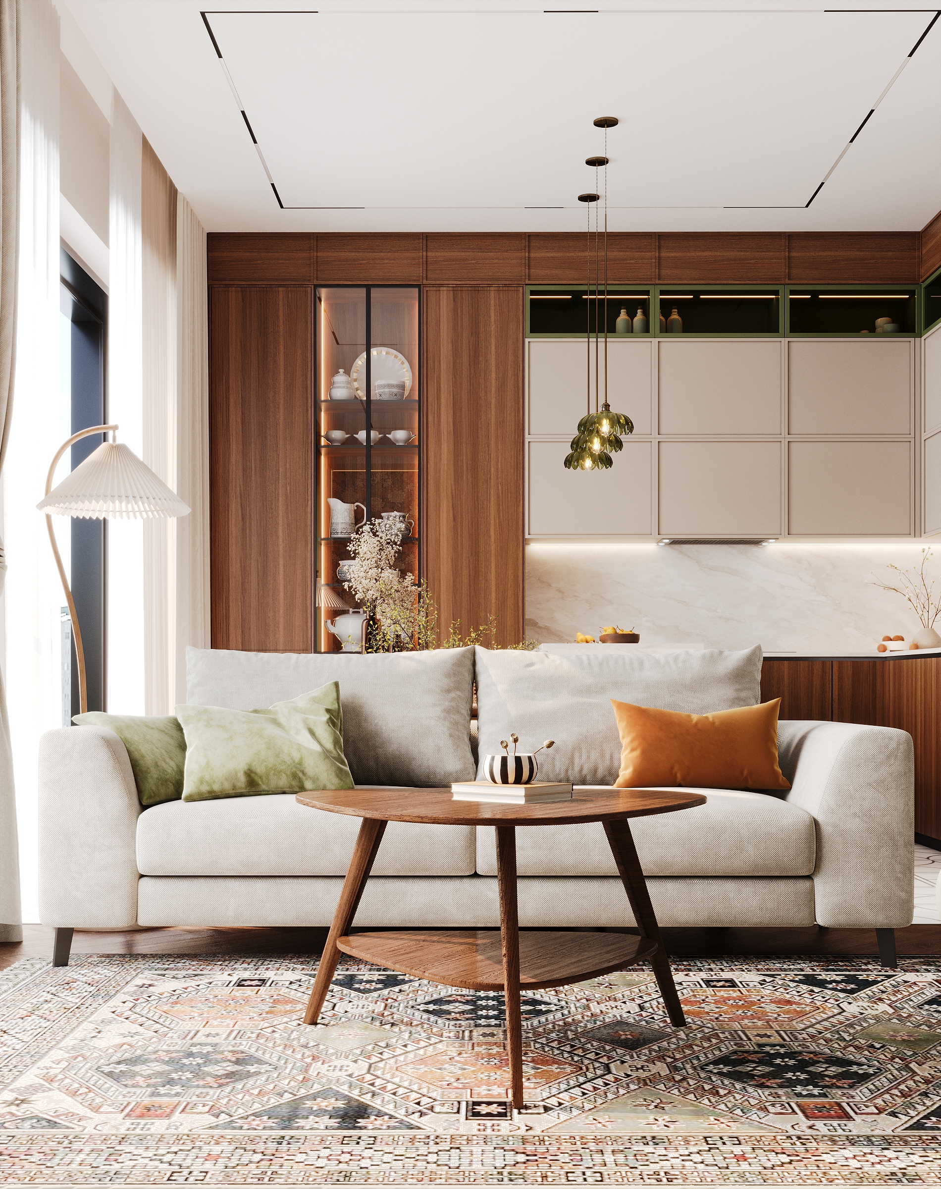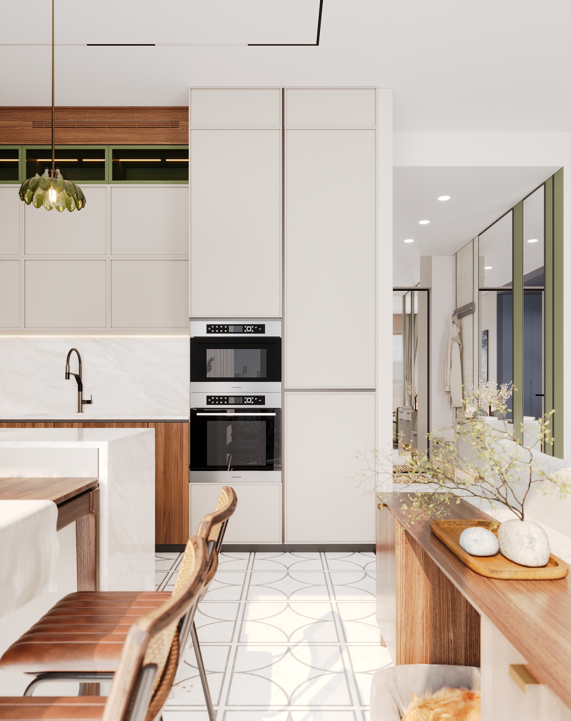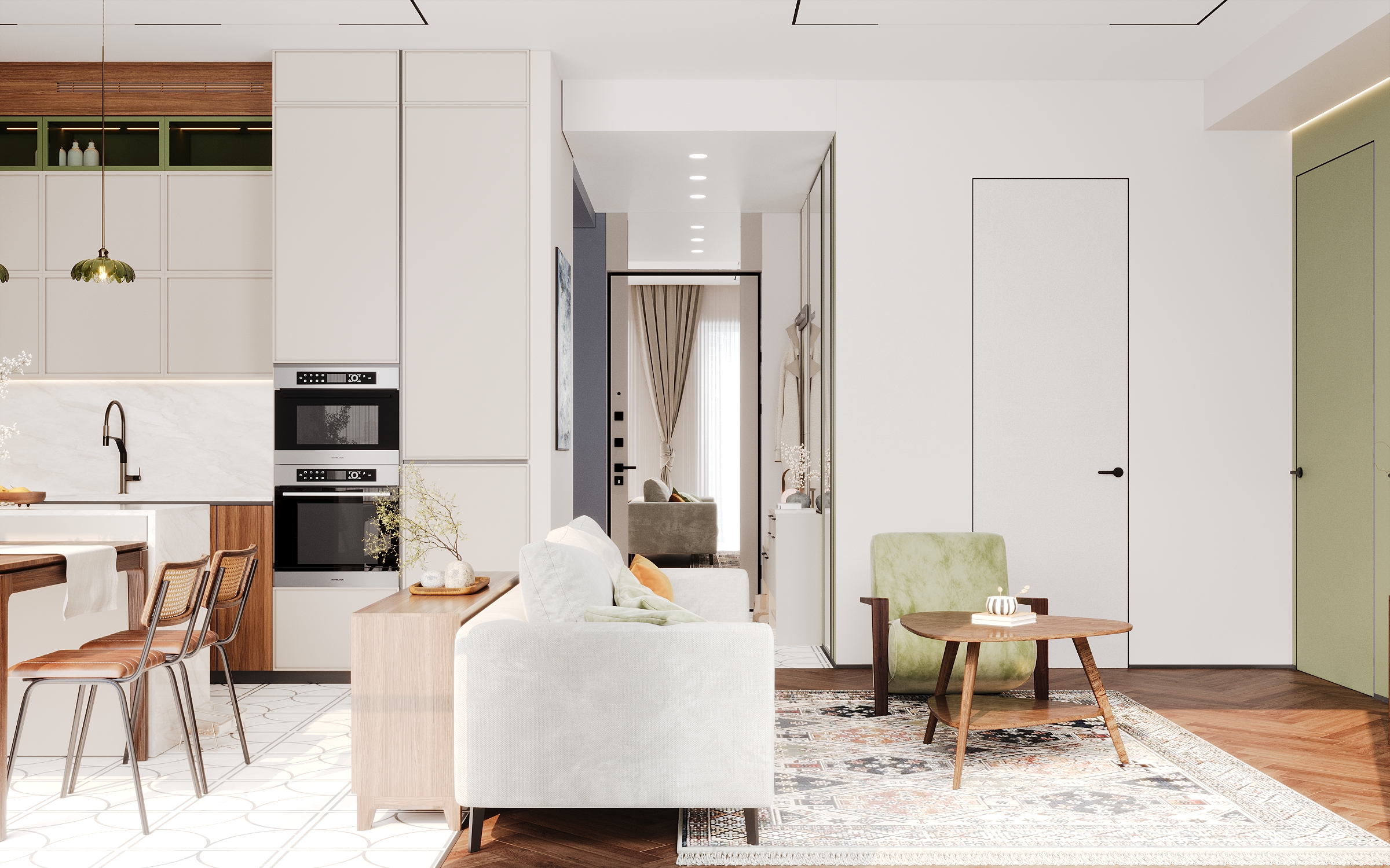 Кухня-гостиная выполнена в современном стиле с цветовыми акцентами. Светлые стены и фасады прекрасно сочетаются с теплым, темным деревом и оливковыми оттенками, создавая гармоничное и свежее пространство. В кухонной зоне внимание привлекает фартук и остров с текстурой мрамора, дополненный изящными подвесными светильниками с плафонами в виде цветов. Продуманная система хранения объединяет закрытые шкафы и витрину для декора и посуды. Гостиная включает в себя мягкий диван в светлой обивке, кресло в оливковом оттенке и ковер с этническим орнаментом. ТВ-зона выделена декоративной панелью с цветочным рисунком, которая добавляет интерьеру характер и индивидуальность.