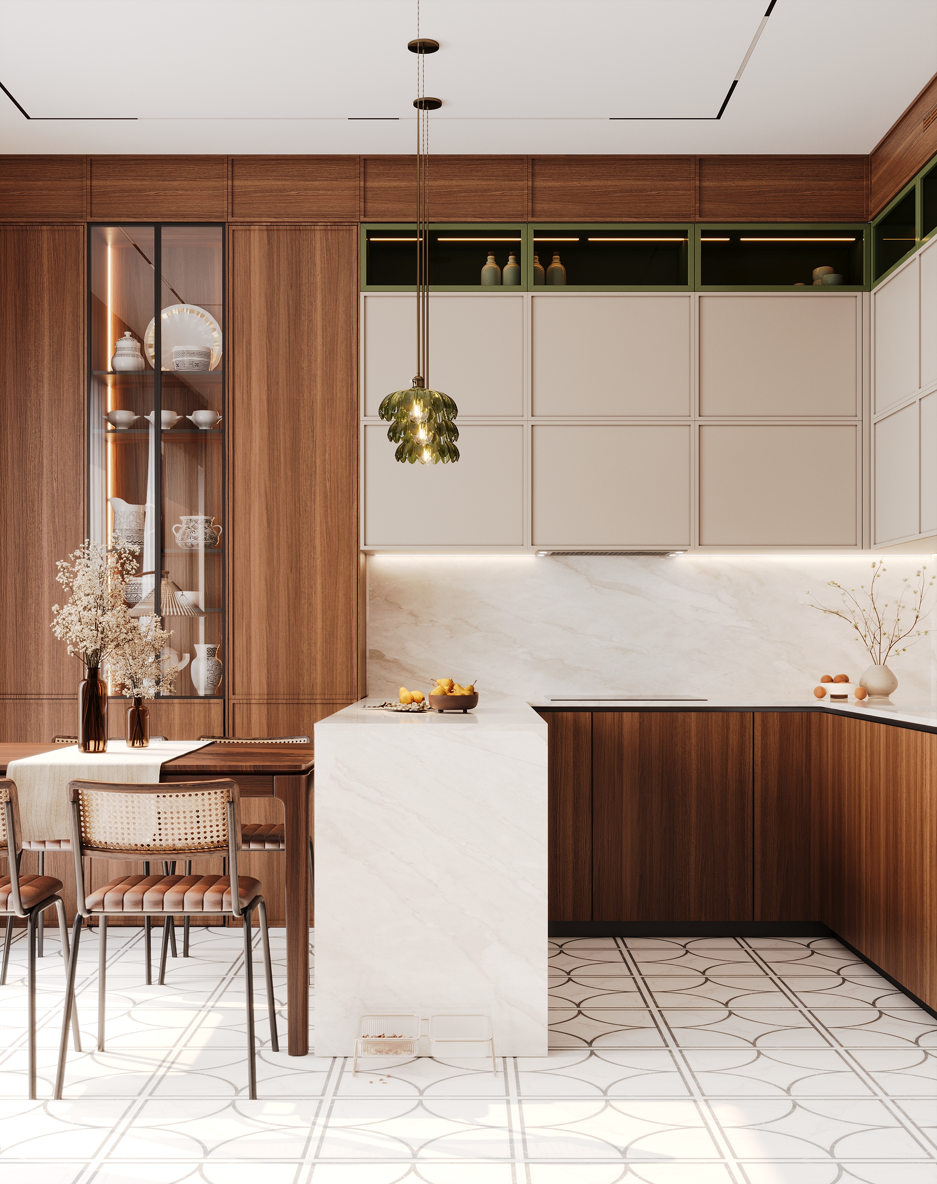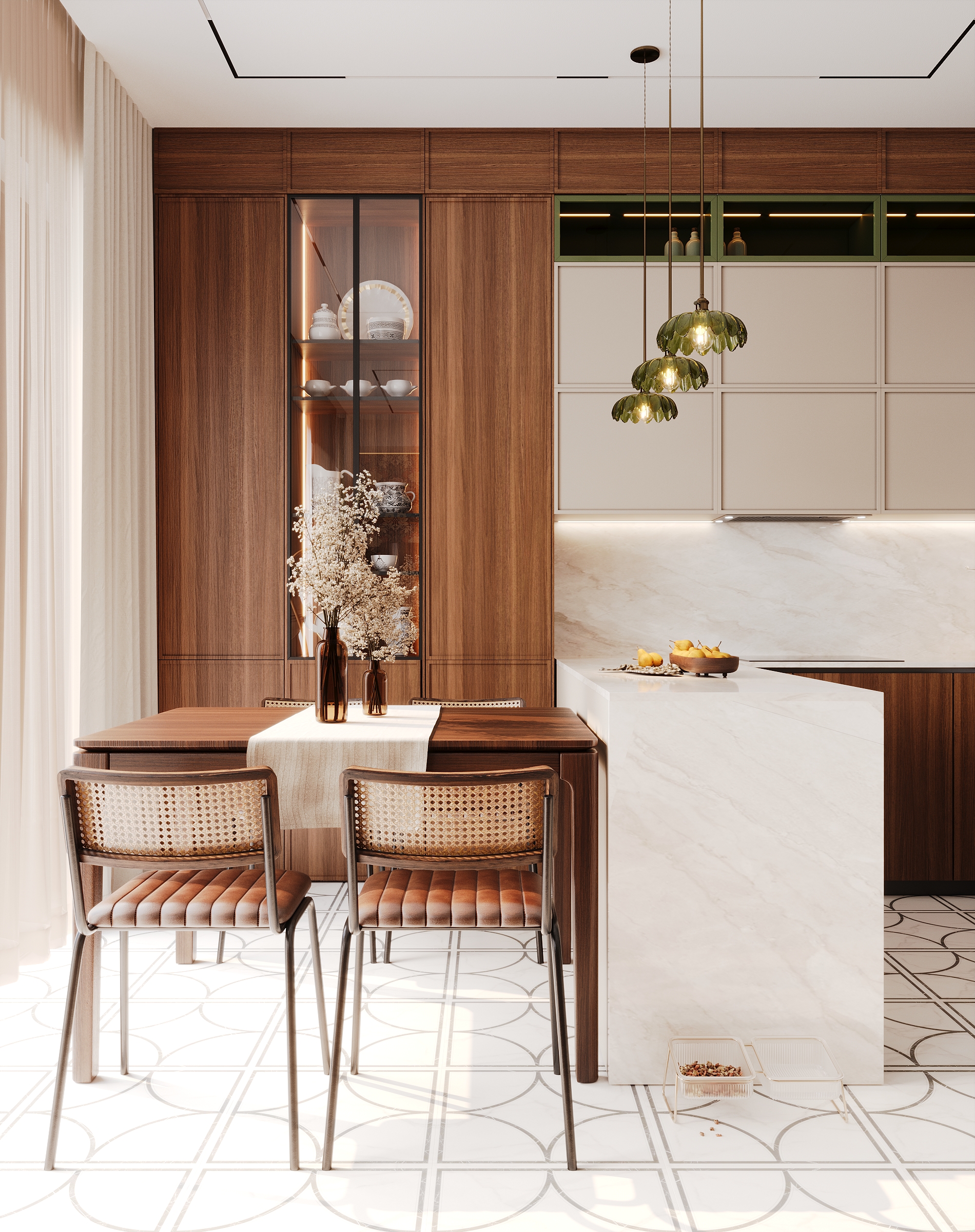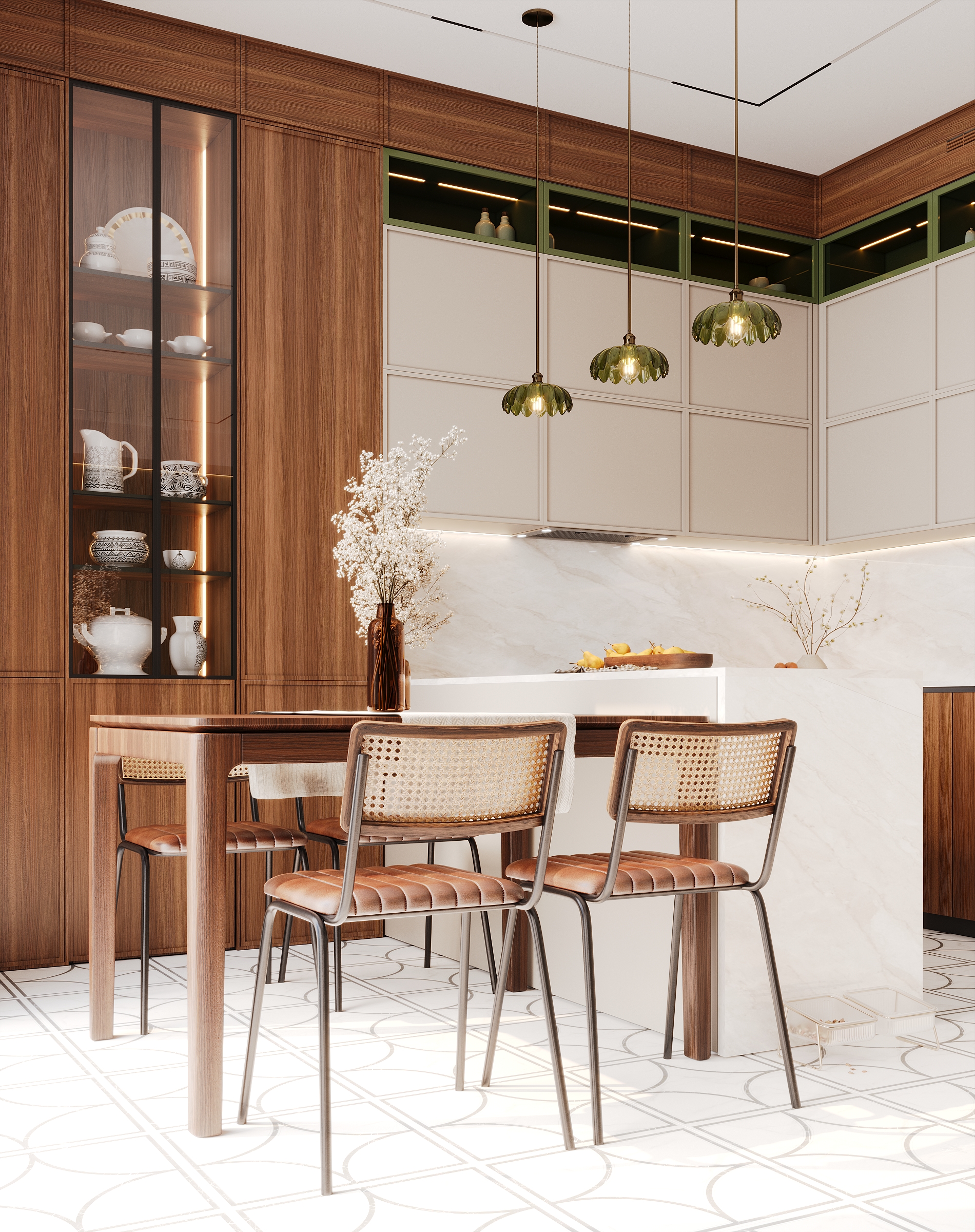 Кухня-гостиная выполнена в современном стиле с цветовыми акцентами. Светлые стены и фасады прекрасно сочетаются с теплым, темным деревом и оливковыми оттенками, создавая гармоничное и свежее пространство. В кухонной зоне внимание привлекает фартук и остров с текстурой мрамора, дополненный изящными подвесными светильниками с плафонами в виде цветов. Продуманная система хранения объединяет закрытые шкафы и витрину для декора и посуды. Гостиная включает в себя мягкий диван в светлой обивке, кресло в оливковом оттенке и ковер с этническим орнаментом. ТВ-зона выделена декоративной панелью с цветочным рисунком, которая добавляет интерьеру характер и индивидуальность.
