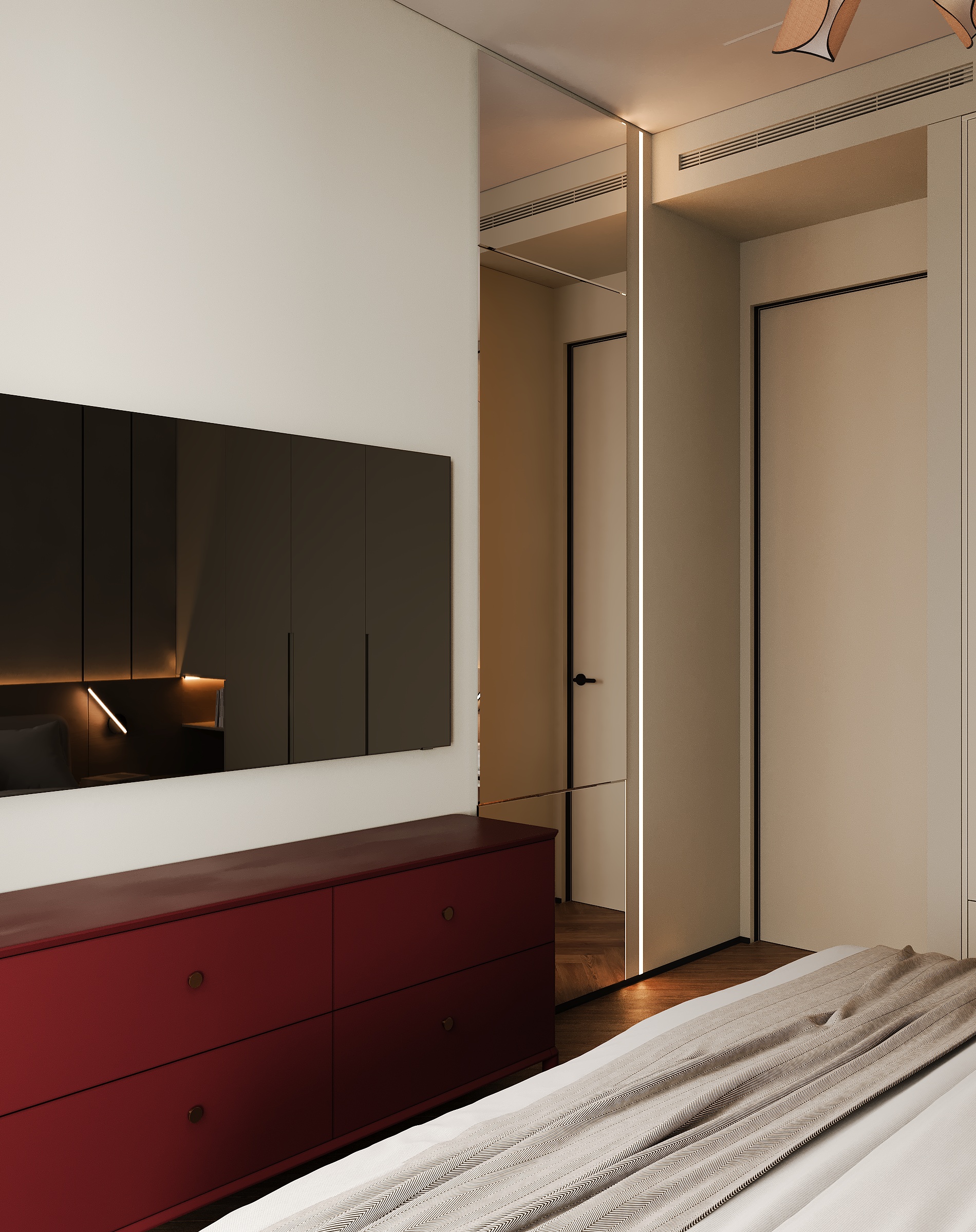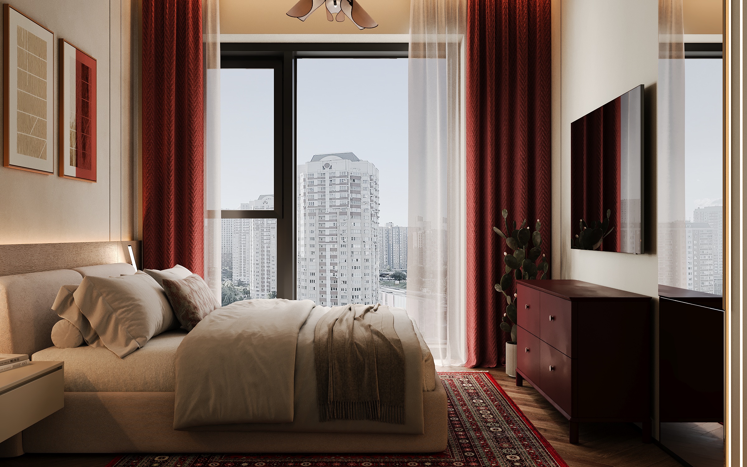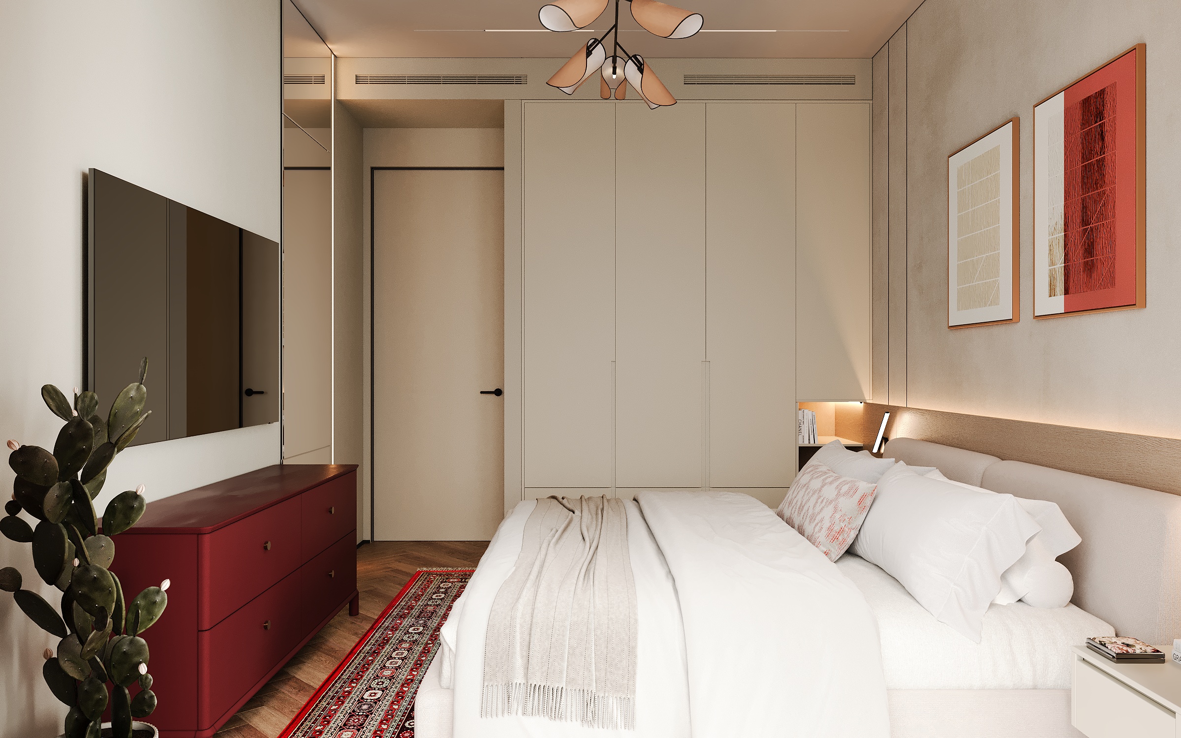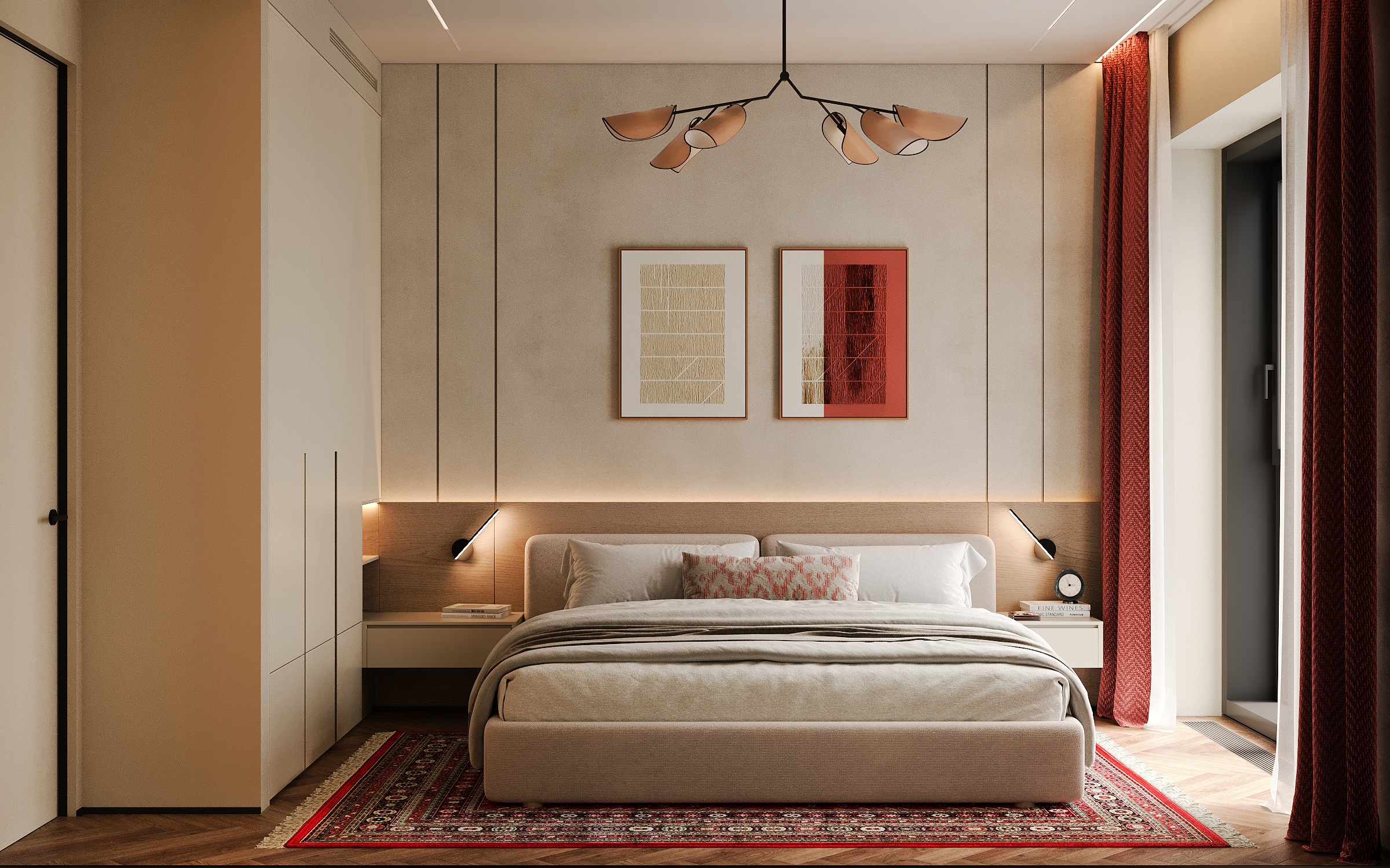 Спальня оформлена в спокойной и элегантной гамме с акцентным глубоким винным оттенком. Нейтральные светлые стены и мягкая текстильная обивка кровати создают атмосферу уюта, а ковёр с восточным орнаментом и плотные бордовые шторы добавляют интерьеру выразительности. Функциональная часть решена минималистично: встроенные шкафы с лаконичными фасадами, прикроватные тумбы и комод в насыщенном винном оттенке. Настенные светильники и мягкая подсветка подчеркивают графику интерьера.