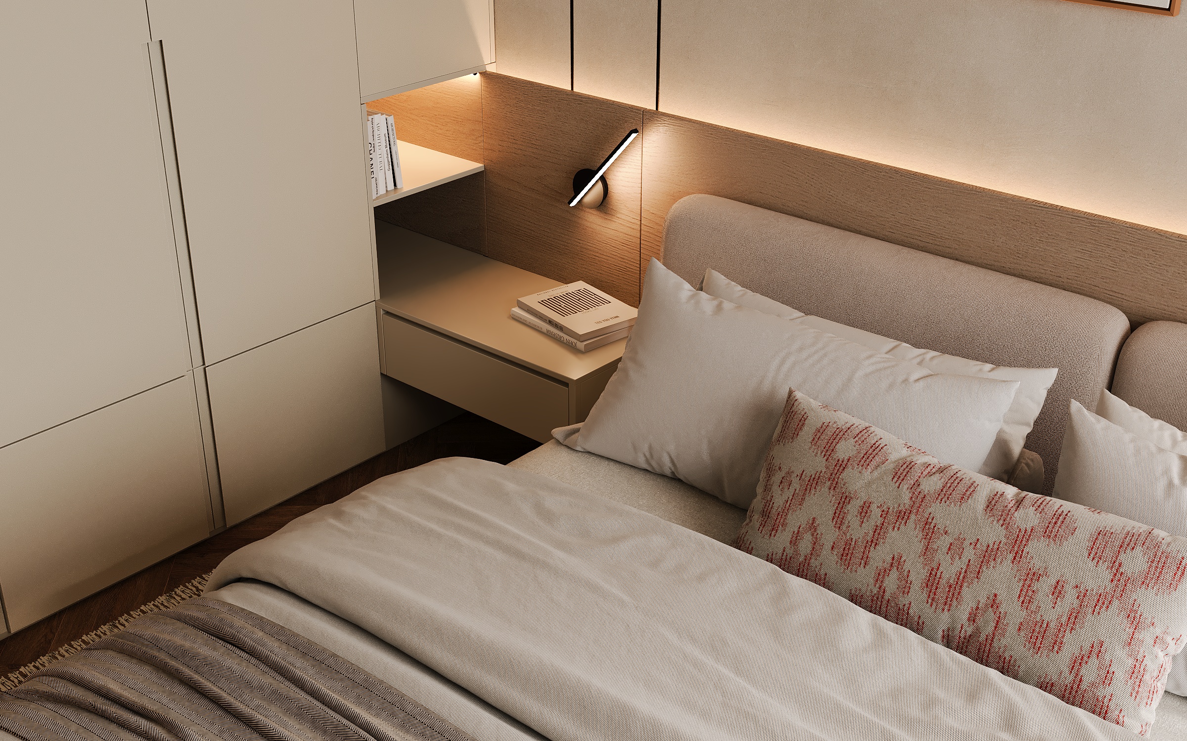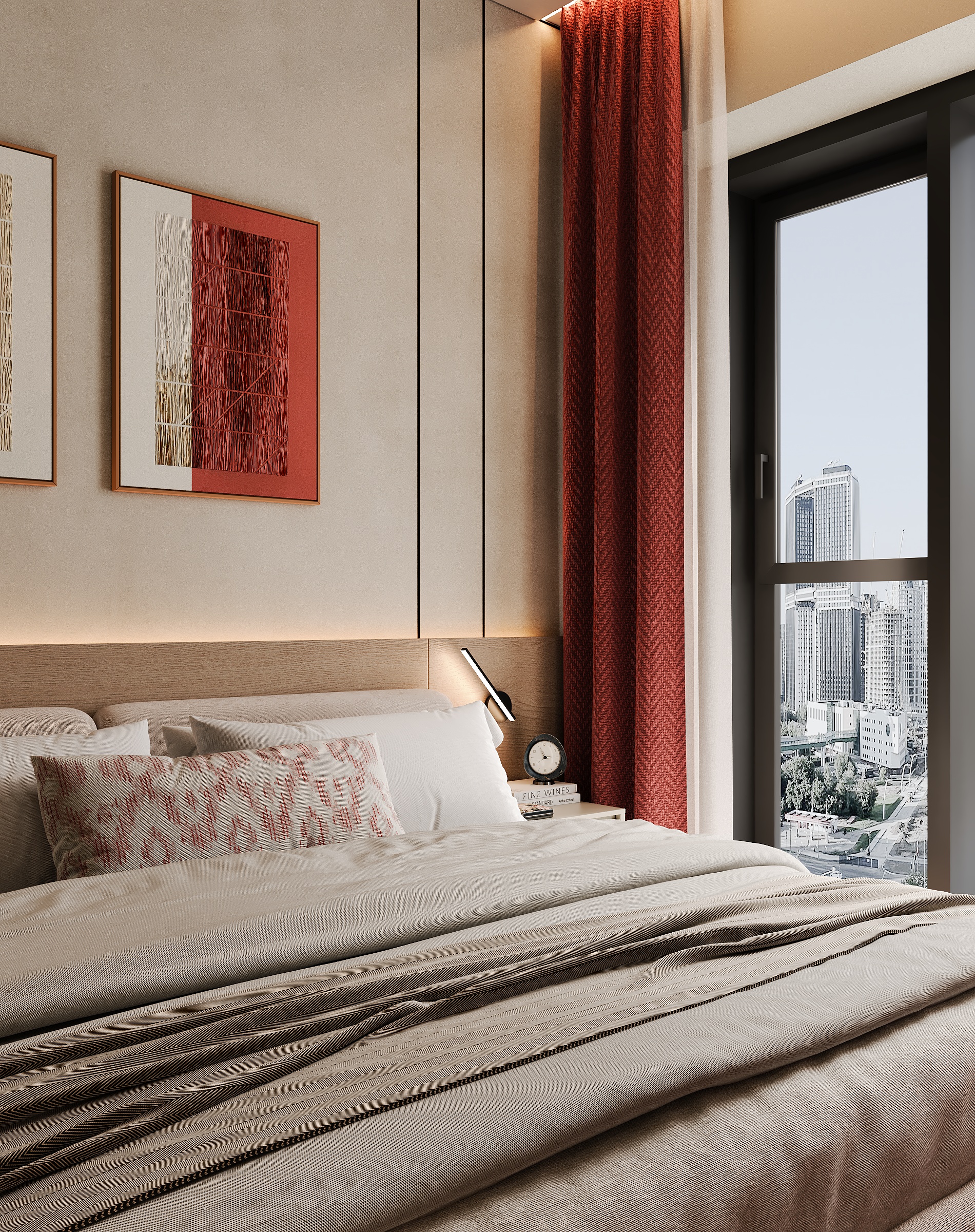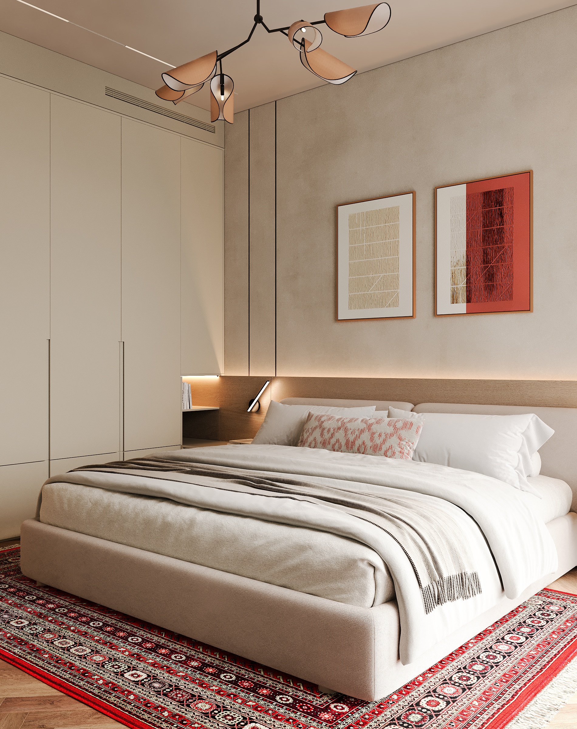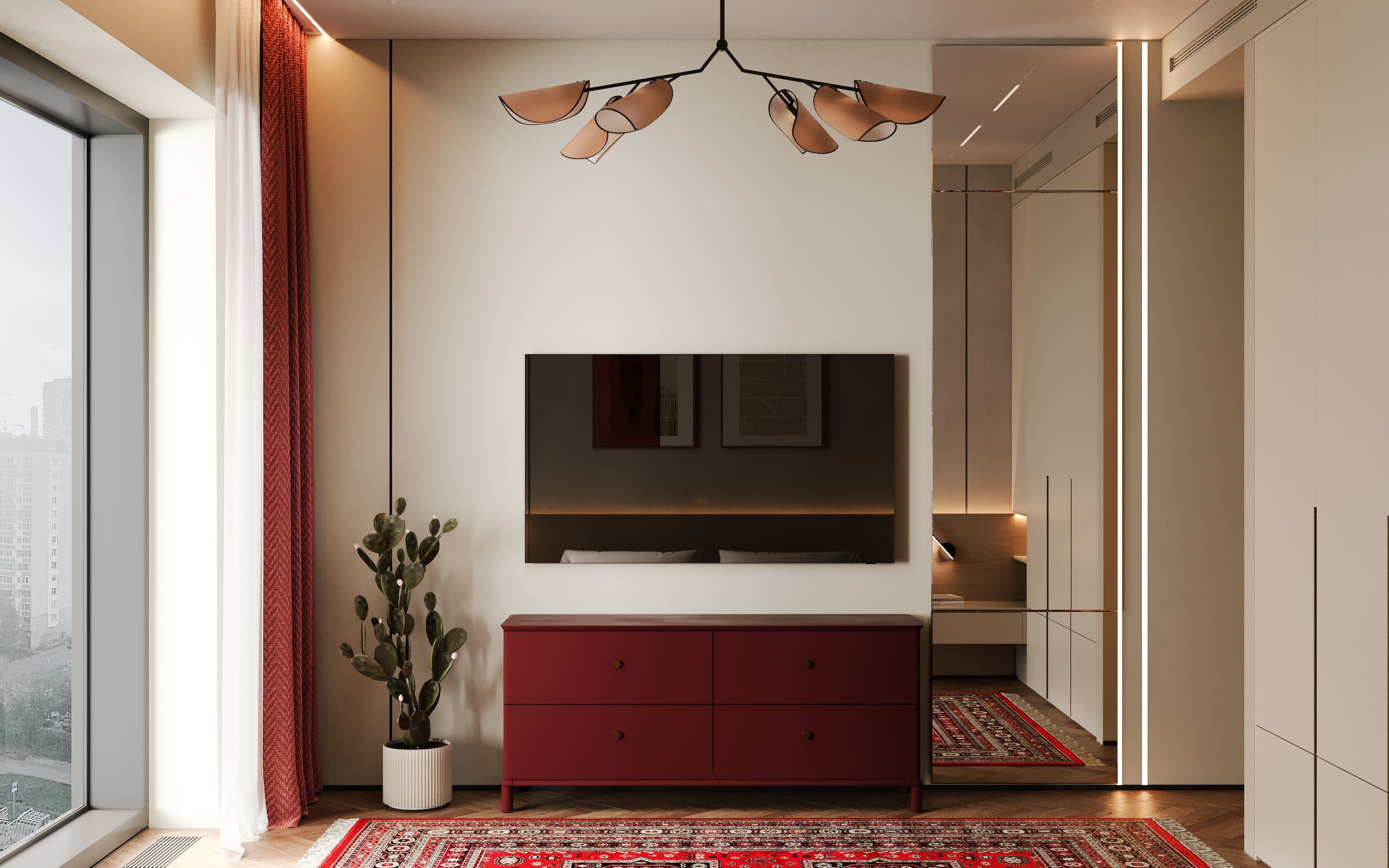 Спальня оформлена в спокойной и элегантной гамме с акцентным глубоким винным оттенком. Нейтральные светлые стены и мягкая текстильная обивка кровати создают атмосферу уюта, а ковёр с восточным орнаментом и плотные бордовые шторы добавляют интерьеру выразительности. Функциональная часть решена минималистично: встроенные шкафы с лаконичными фасадами, прикроватные тумбы и комод в насыщенном винном оттенке. Настенные светильники и мягкая подсветка подчеркивают графику интерьера.