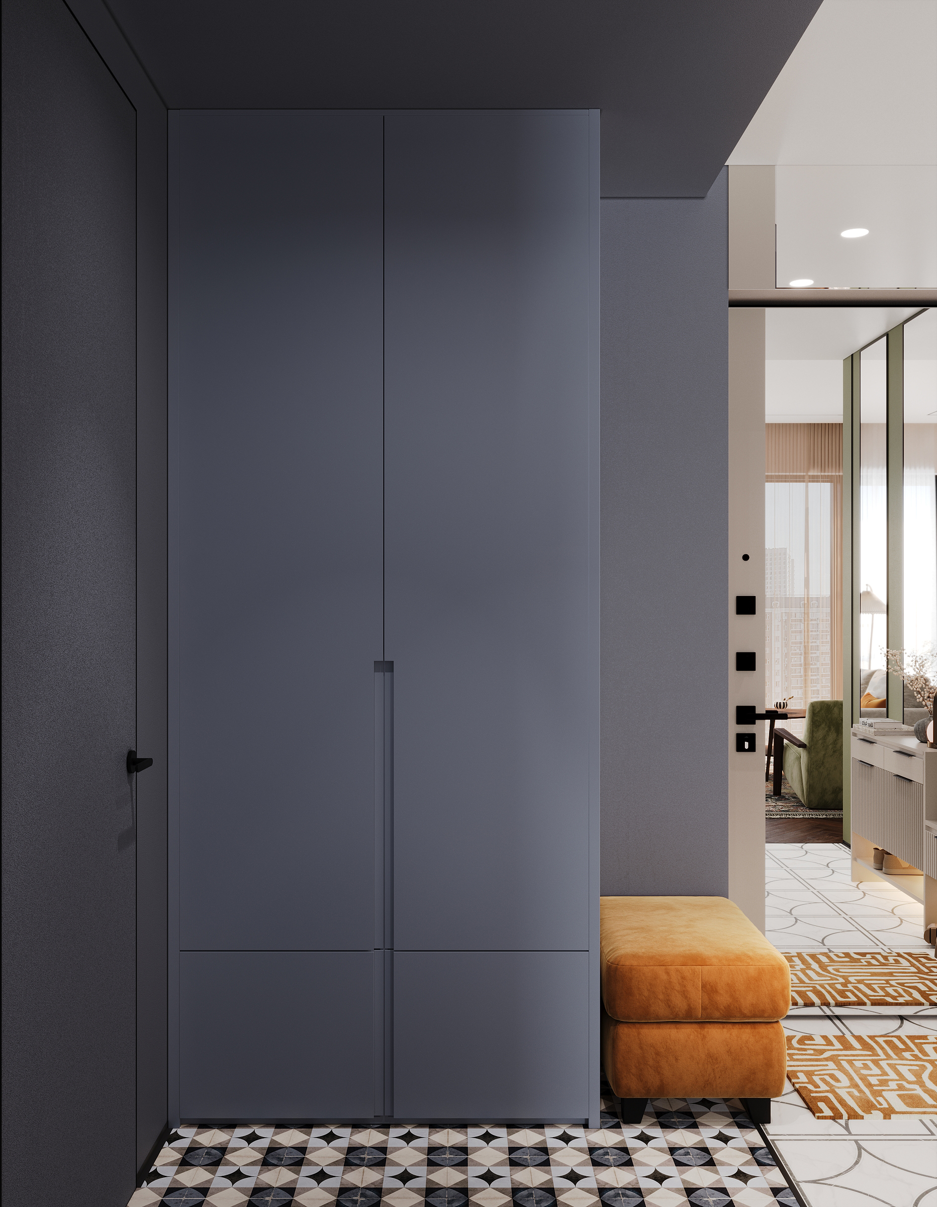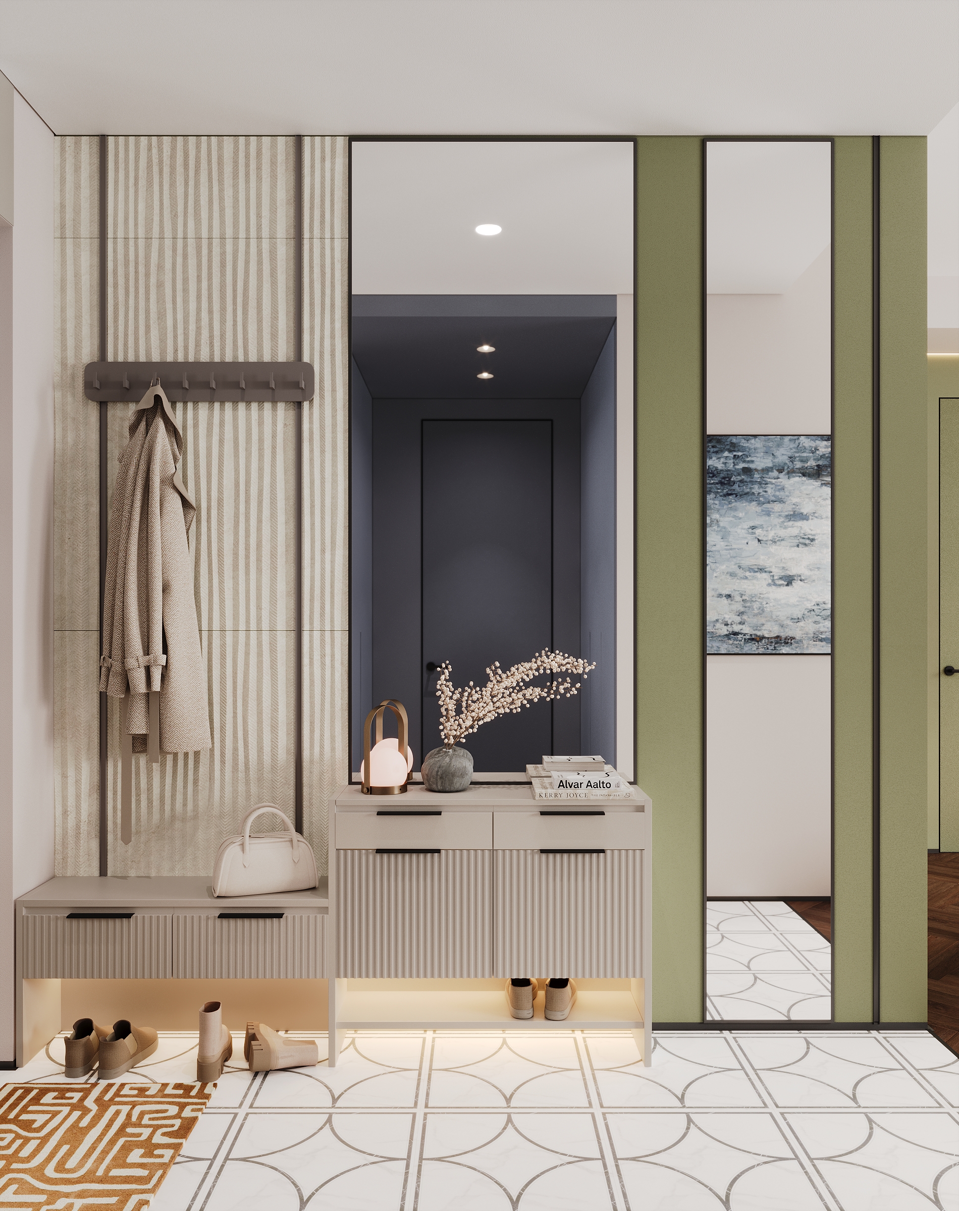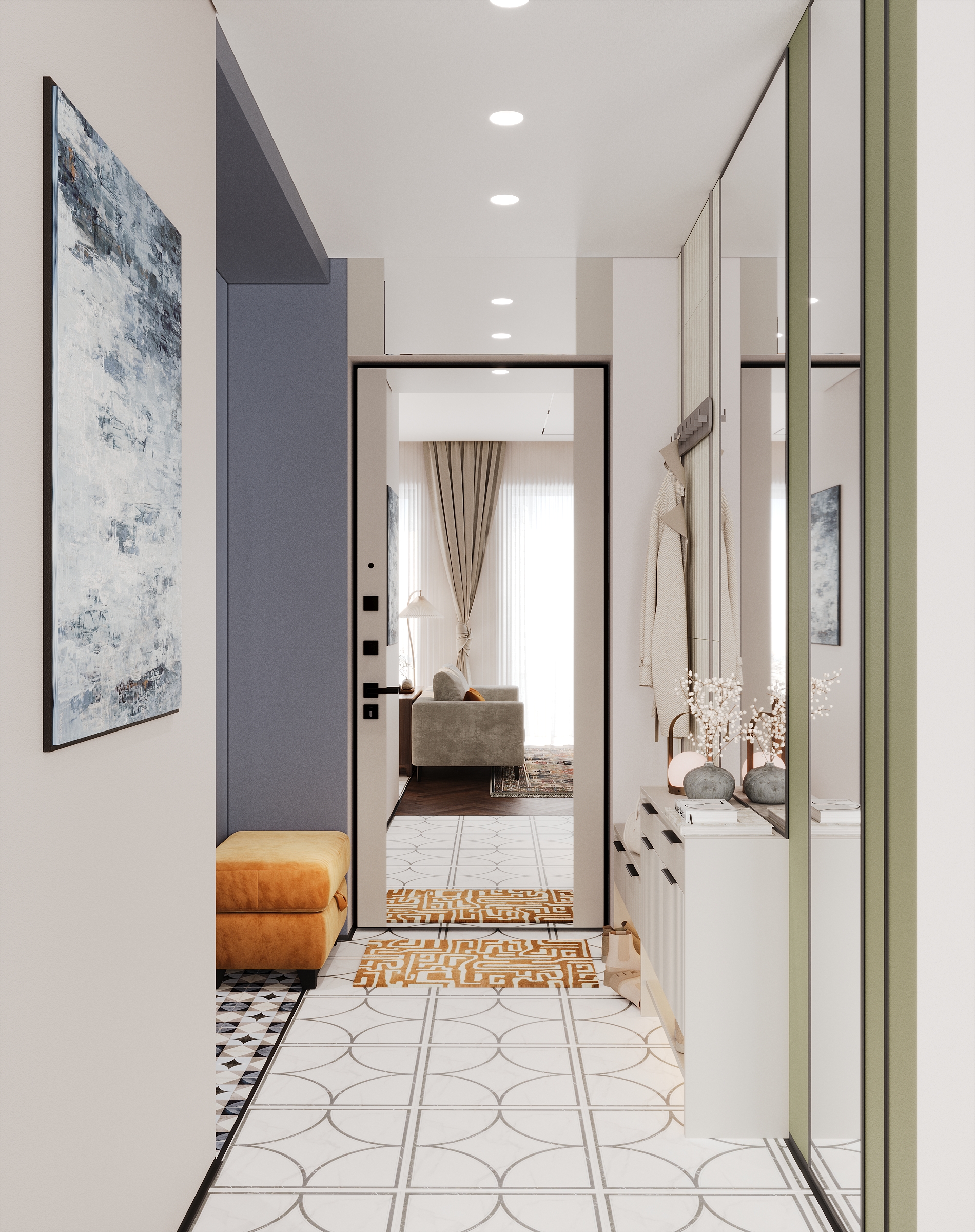 Прихожая в этом проекте сочетает функциональность и эстетику, создавая приятное первое впечатление от квартиры. Светлая, большое зеркало в полный рост и мягкая подсветка делают пространство визуально более просторным и удобным в использовании. На полу — плитка с графичным ритмом, добавляющая динамику и характер интерьеру. Система хранения с вместительными шкафами, зонально отделена пепельно-синим цветом и плиткой с орнаментом. Пространство выглядит современно, стильно и гармонично, при этом оставаясь максимально удобным для повседневной жизни.