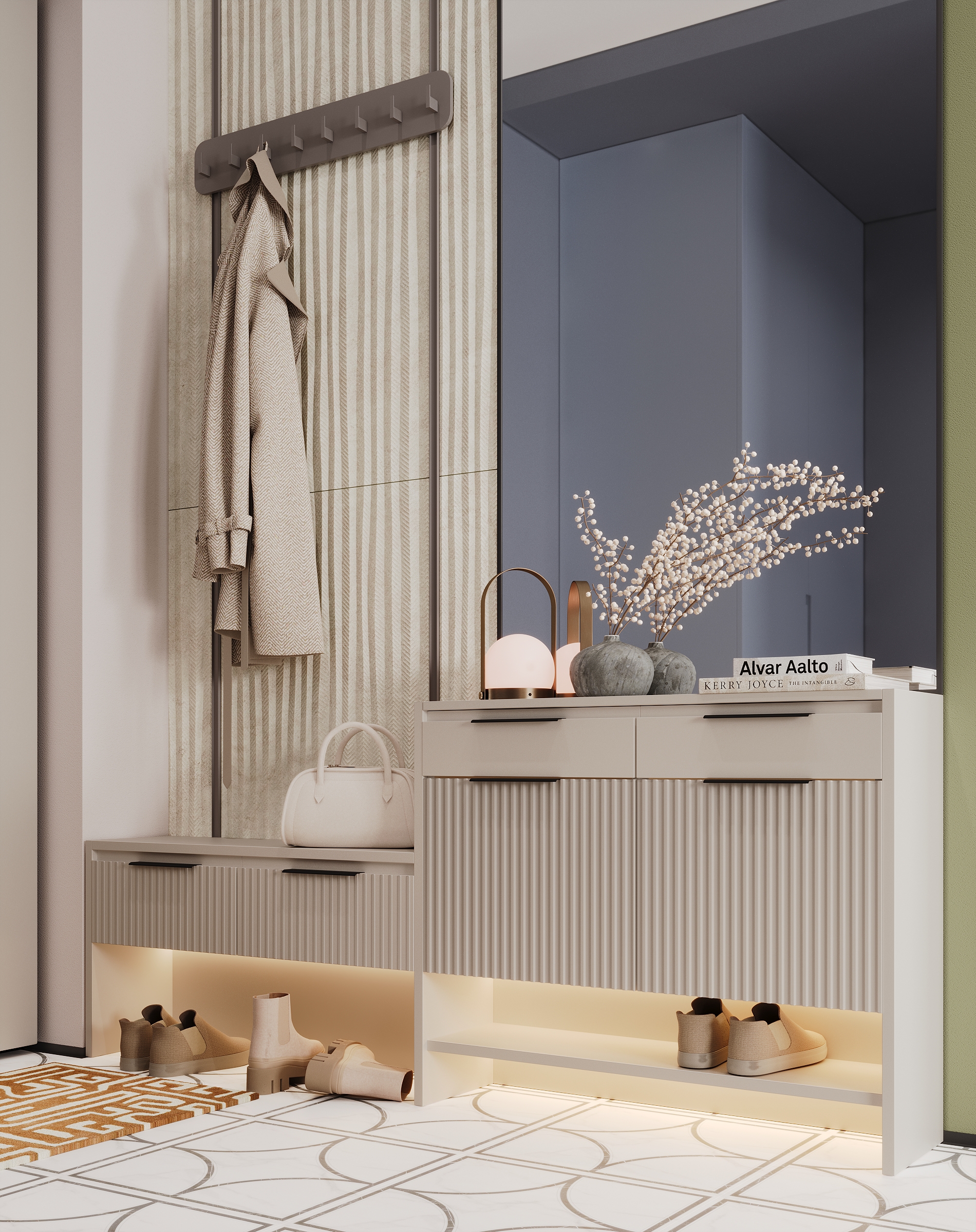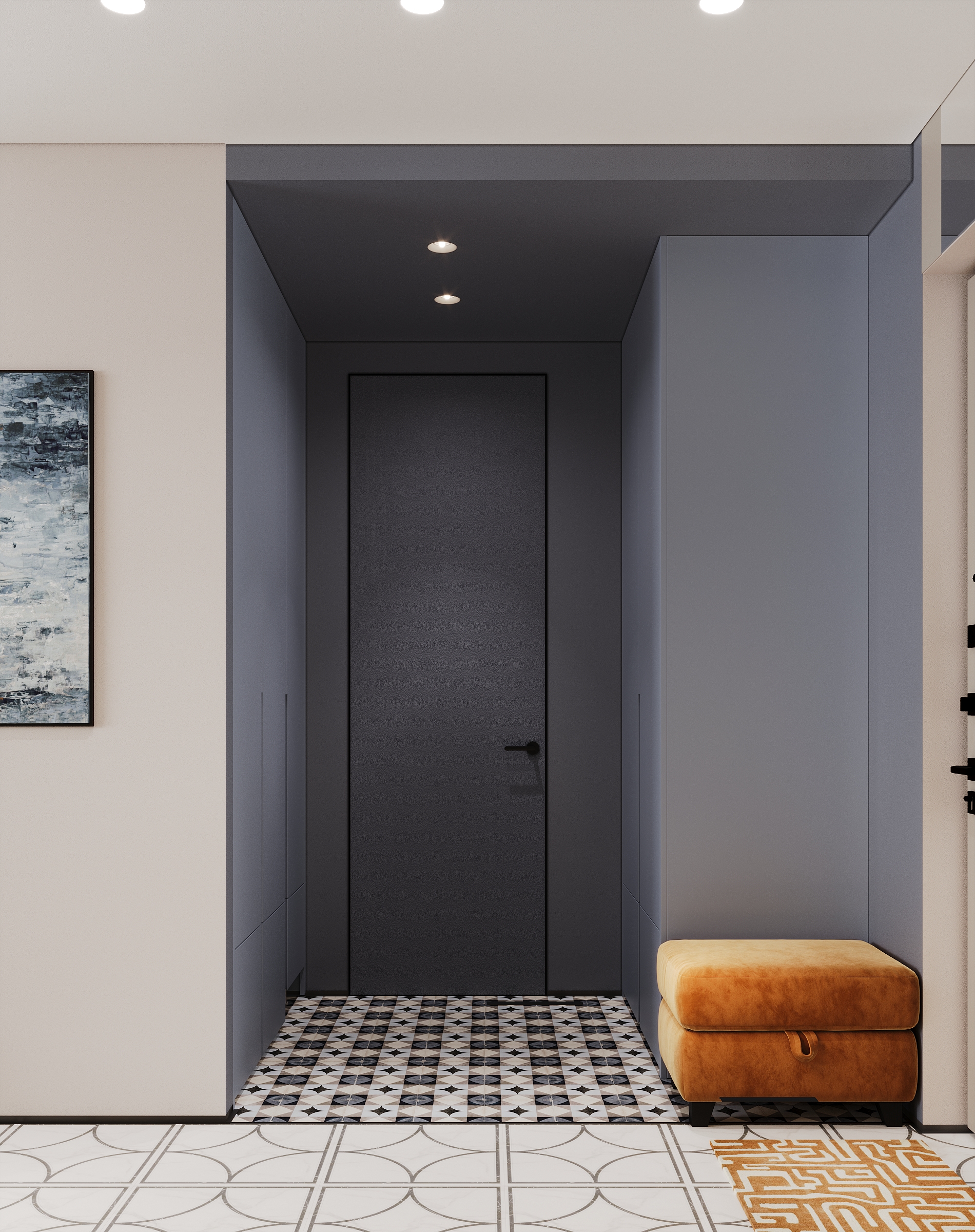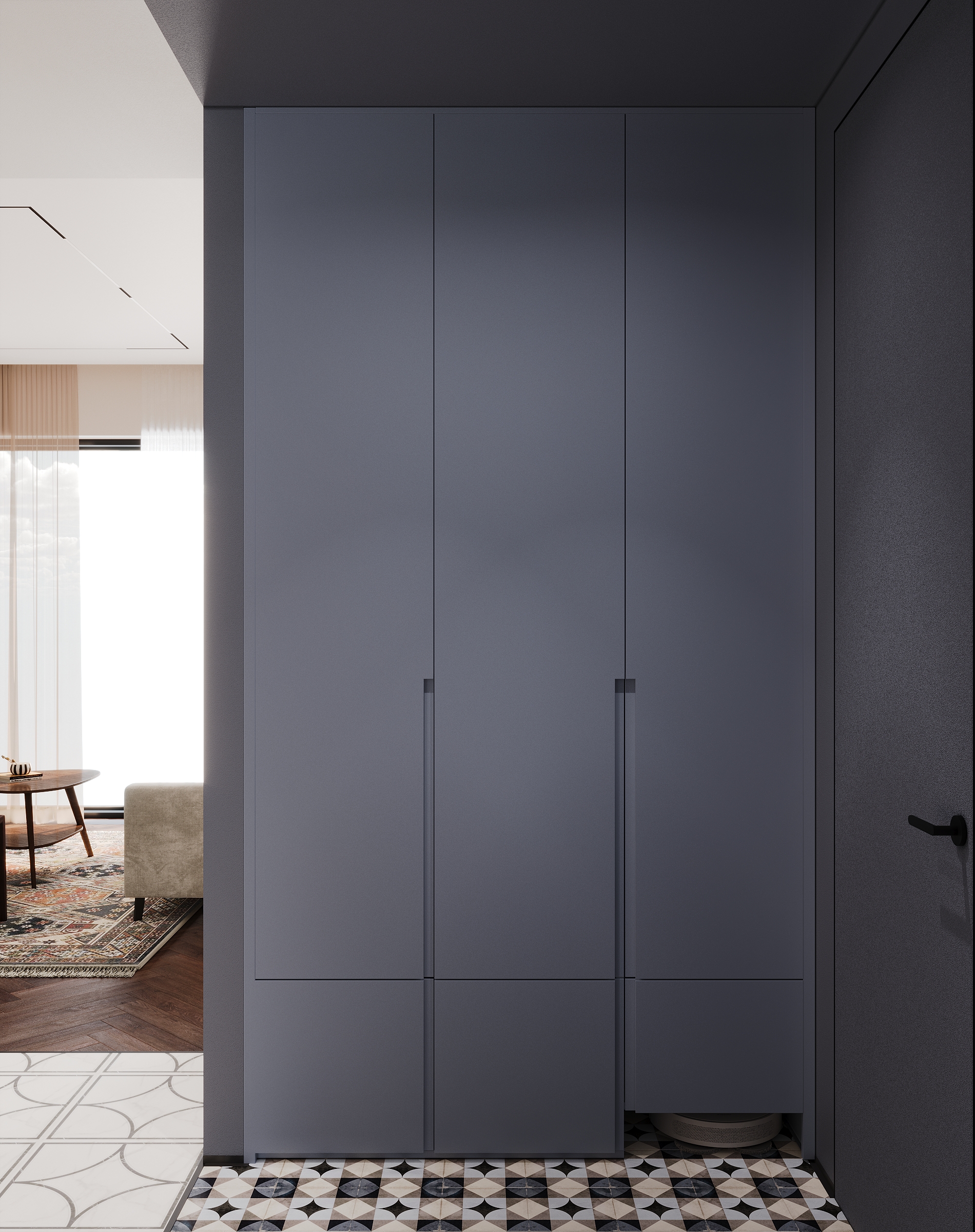 Прихожая в этом проекте сочетает функциональность и эстетику, создавая приятное первое впечатление от квартиры. Светлая, большое зеркало в полный рост и мягкая подсветка делают пространство визуально более просторным и удобным в использовании. На полу — плитка с графичным ритмом, добавляющая динамику и характер интерьеру. Система хранения с вместительными шкафами, зонально отделена пепельно-синим цветом и плиткой с орнаментом. Пространство выглядит современно, стильно и гармонично, при этом оставаясь максимально удобным для повседневной жизни.