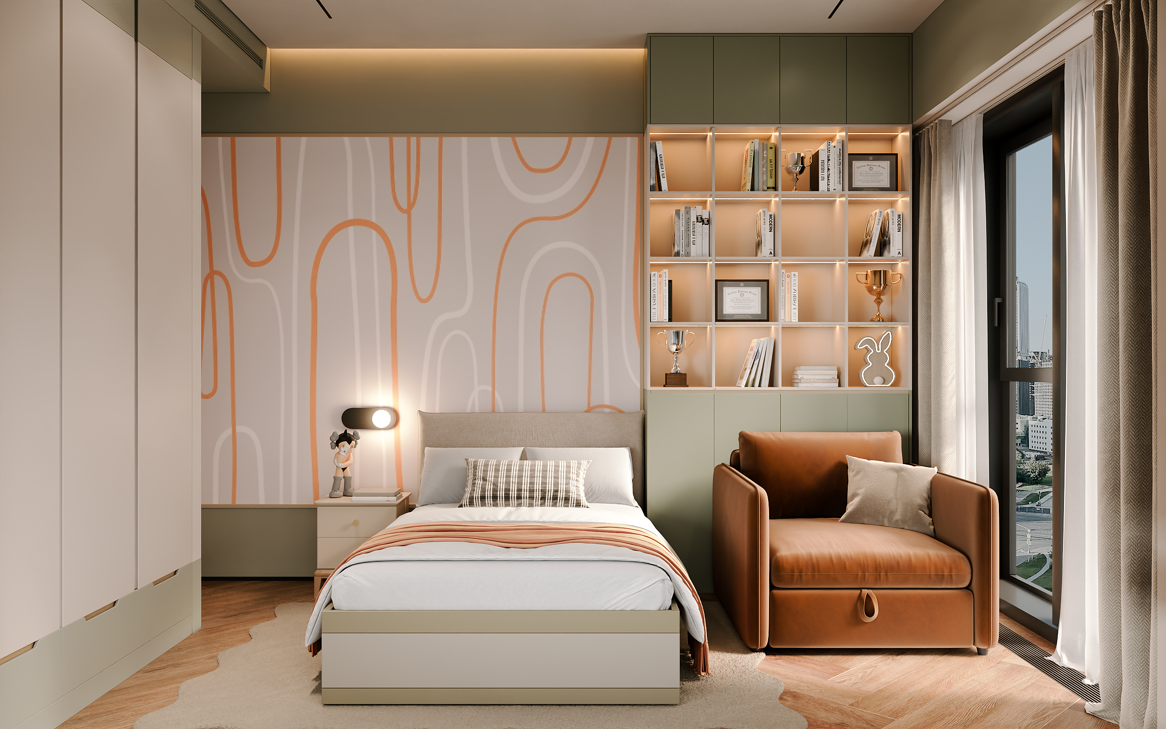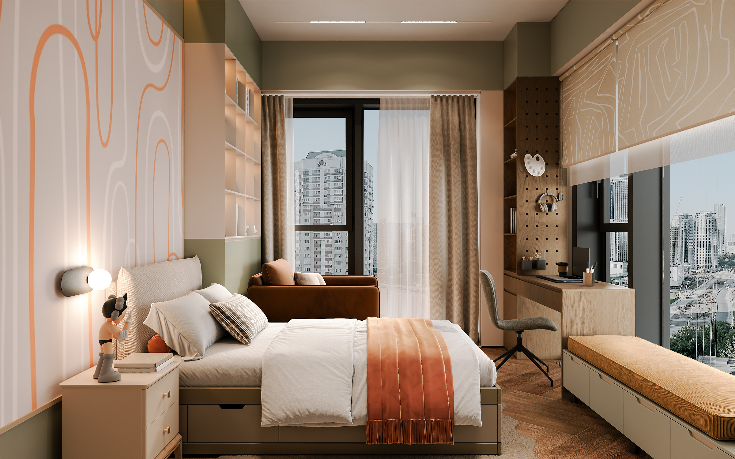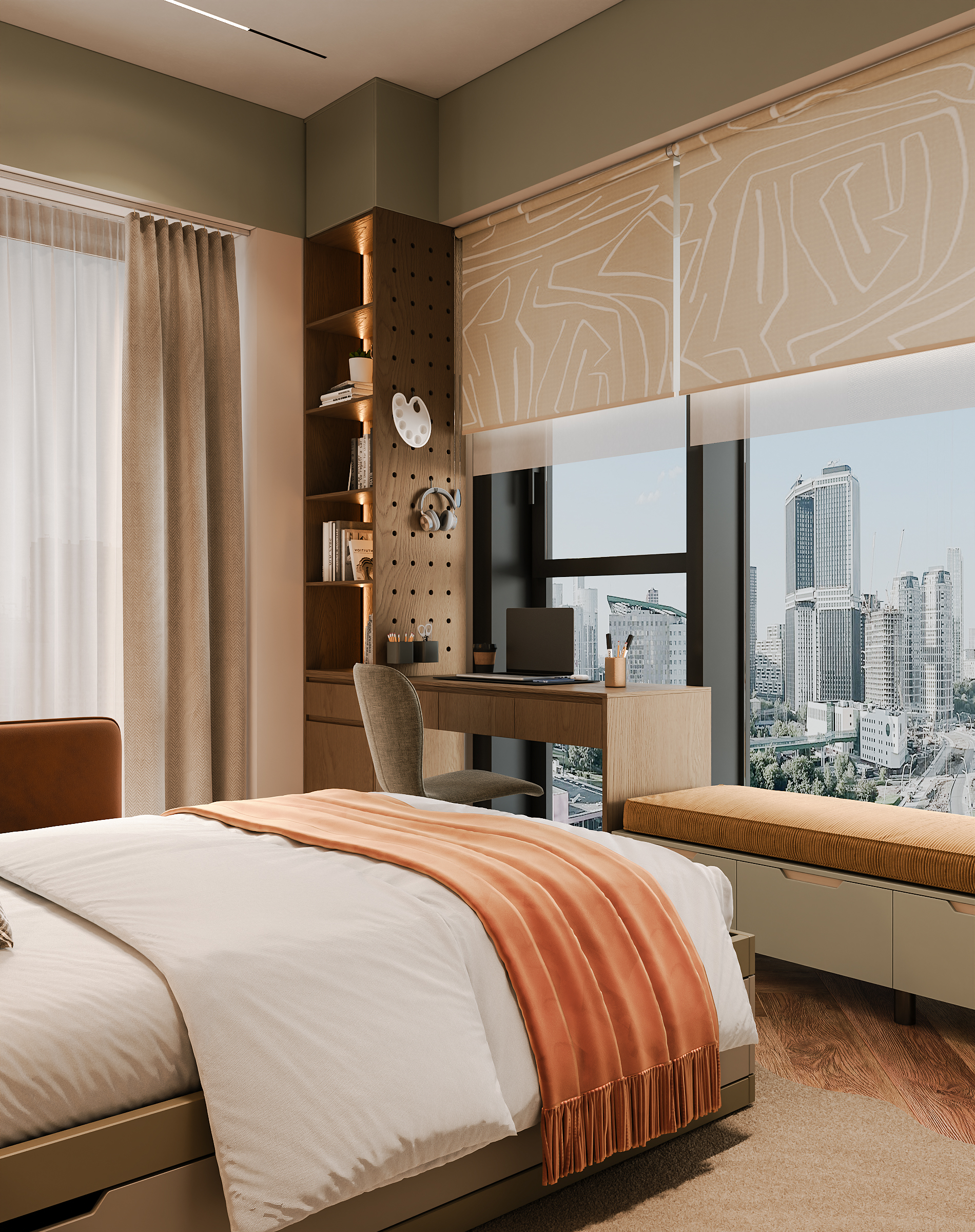 Гостевая комната оформлена в современном стиле с в мягких, приглушенных цветах и с добавлением ярких графичных деталей. Главный акцент создаёт декоративная стена с абстрактным рисунком в оранжевых и светло-серых линиях, которая задаёт динамику пространству. Функциональное наполнение продумано до мелочей: удобная кровать с местом для хранения, просторный рабочий стол у окна с естественным освещением, стеллажи и встроенные шкафы. Уютная зона отдыха с креслом и мягкой банкеткой у окна позволяет сочетать работу и отдых.