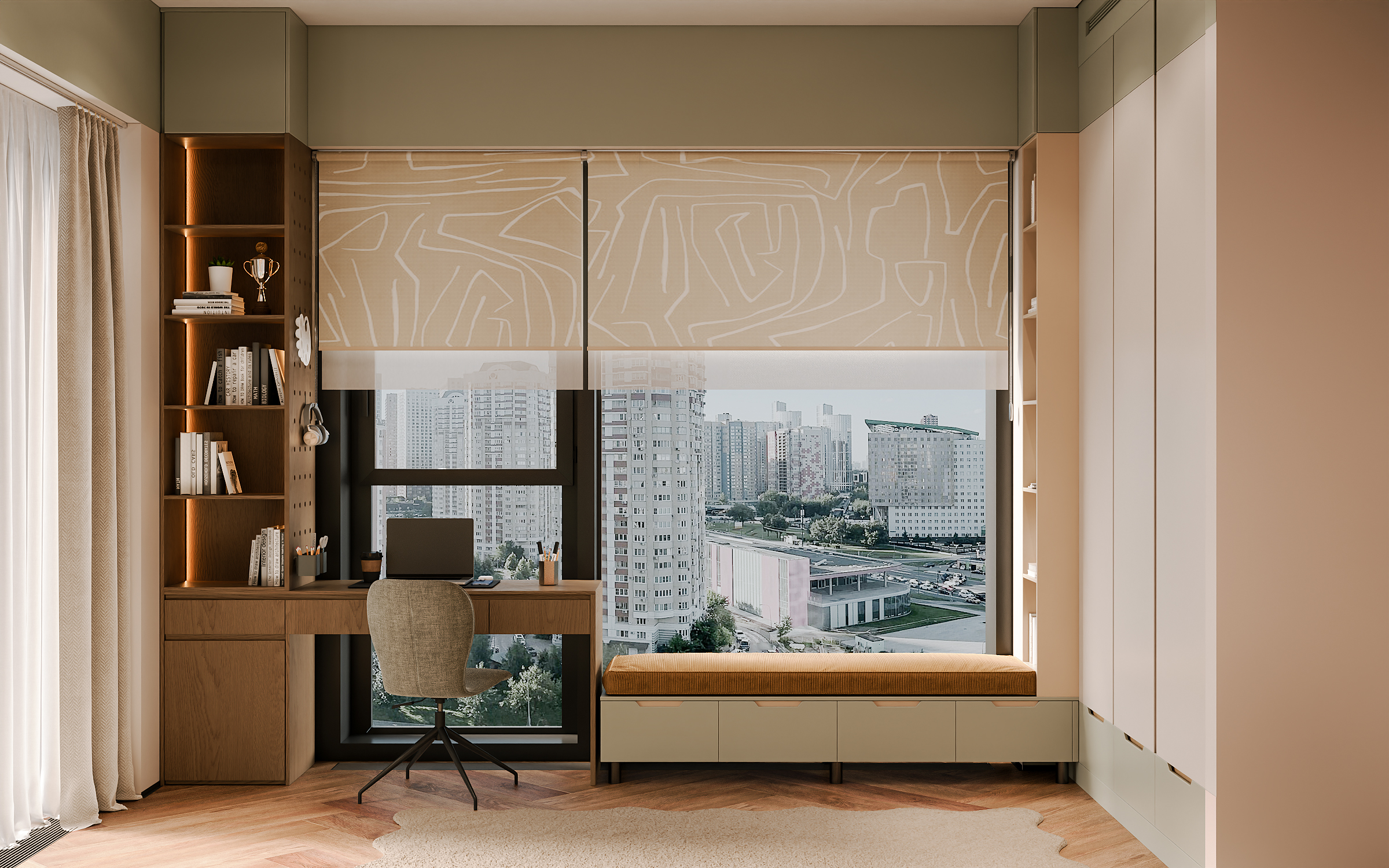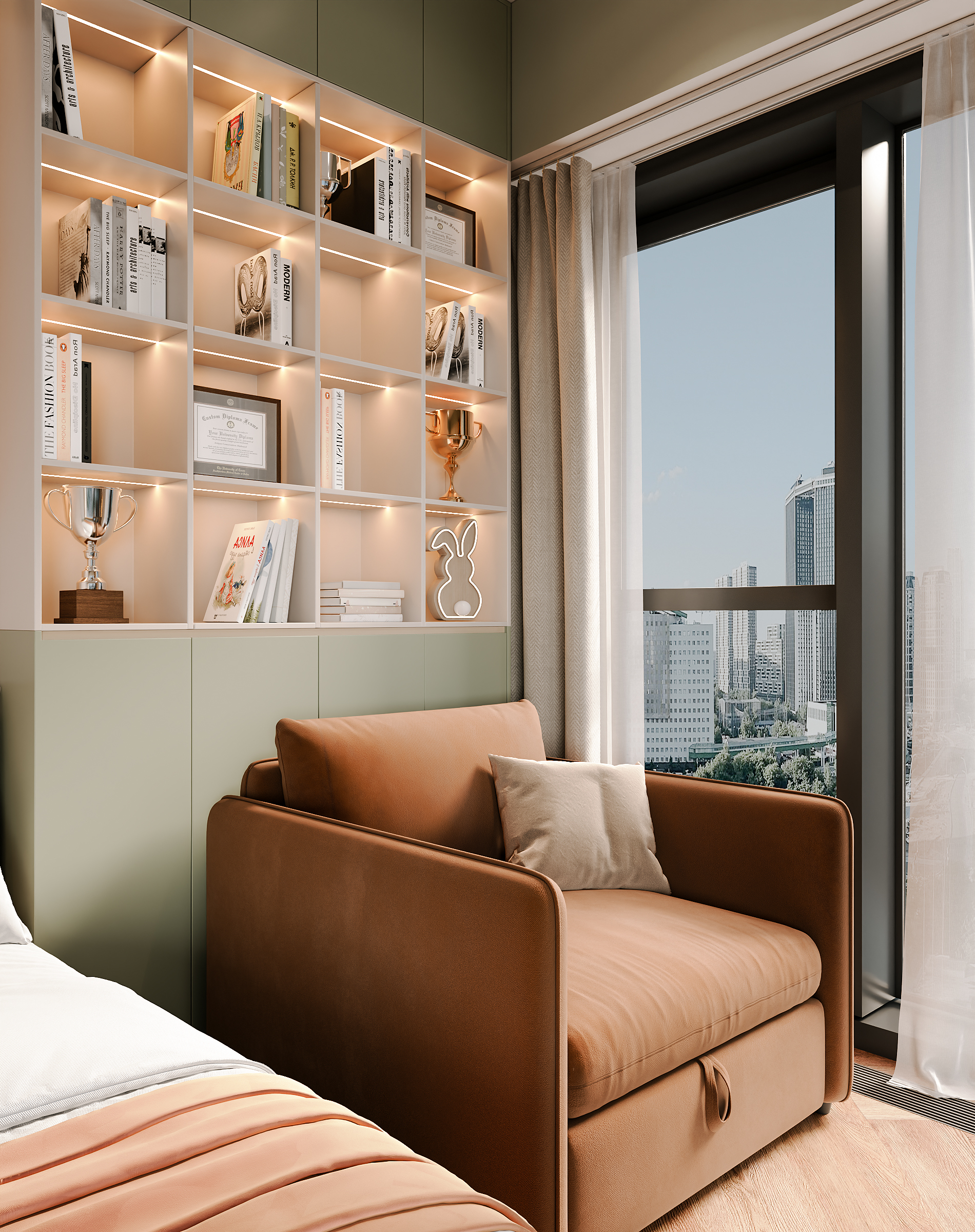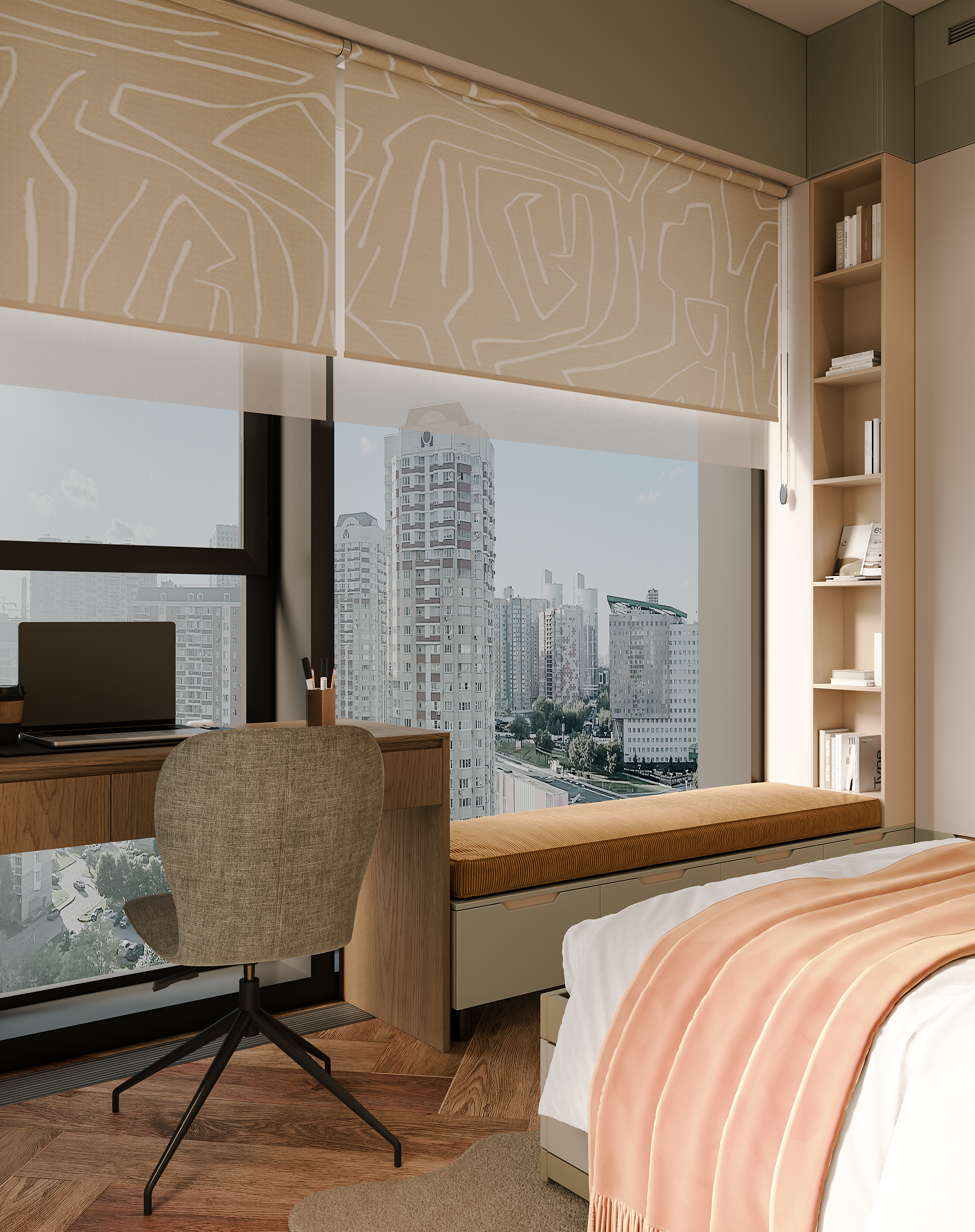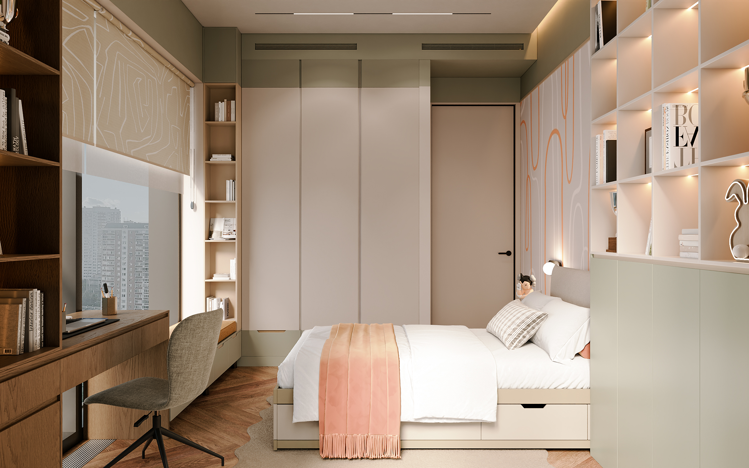 Гостевая комната оформлена в современном стиле с в мягких, приглушенных цветах и с добавлением ярких графичных деталей. Главный акцент создаёт декоративная стена с абстрактным рисунком в оранжевых и светло-серых линиях, которая задаёт динамику пространству. Функциональное наполнение продумано до мелочей: удобная кровать с местом для хранения, просторный рабочий стол у окна с естественным освещением, стеллажи и встроенные шкафы. Уютная зона отдыха с креслом и мягкой банкеткой у окна позволяет сочетать работу и отдых.
