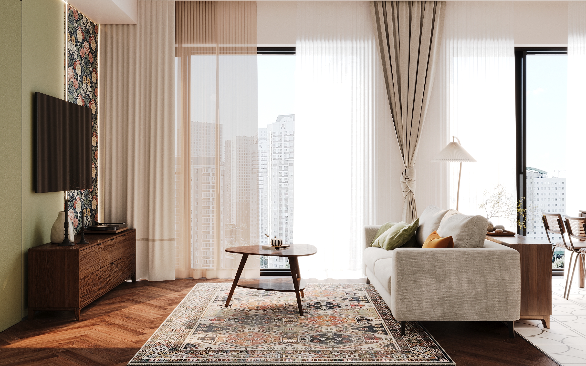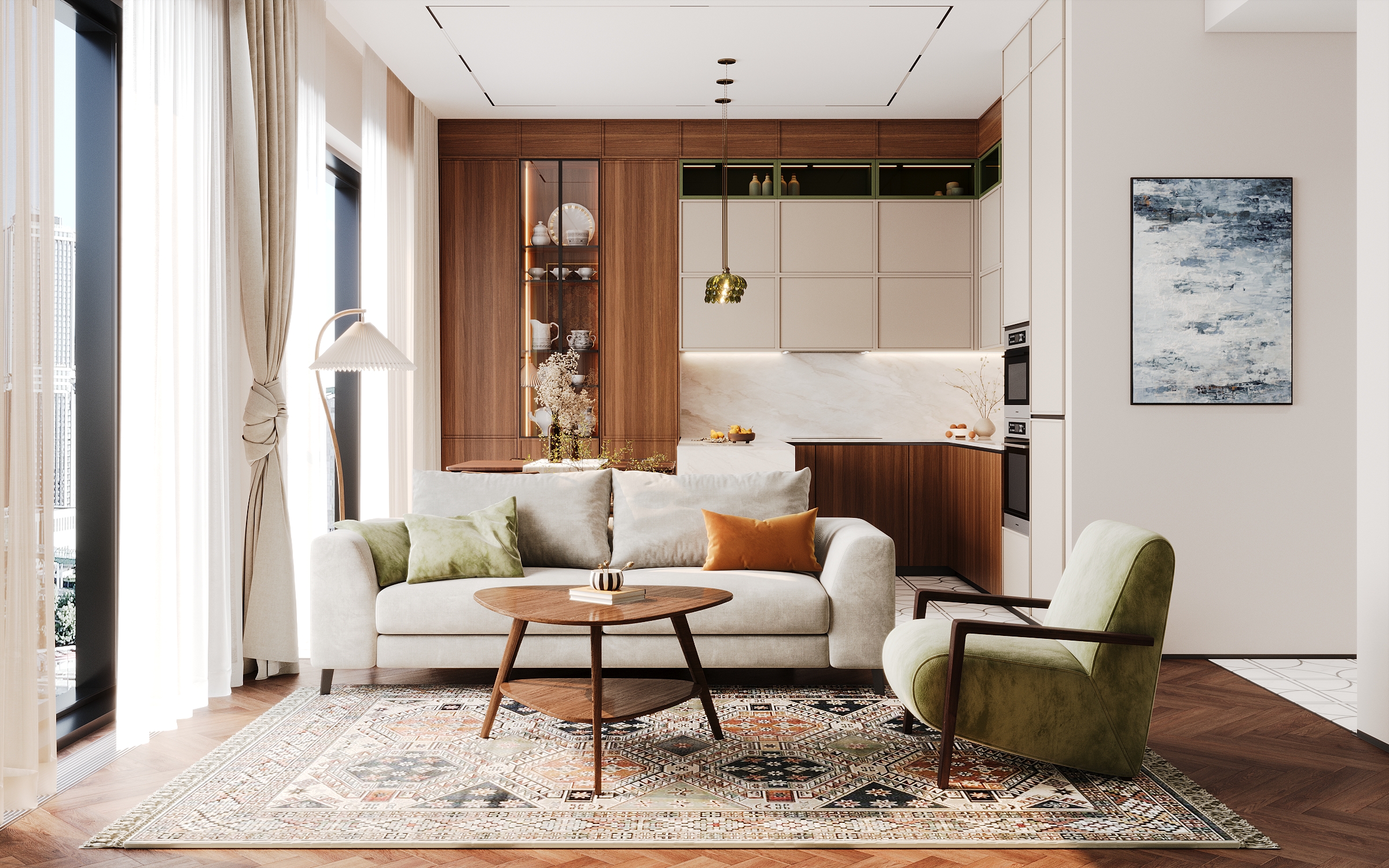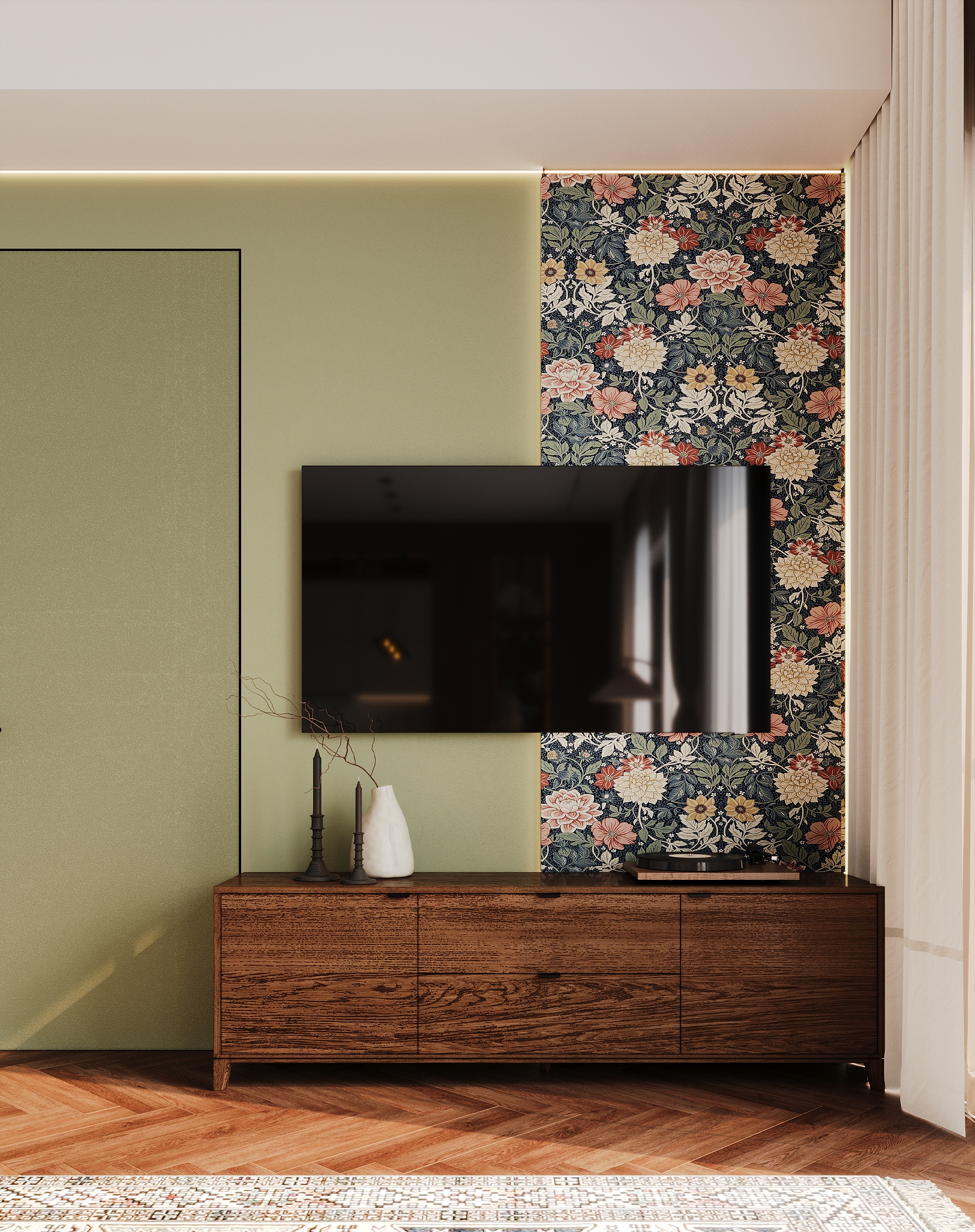Квартира в ЖК Level Мичуринский объединяет функциональность и выразительный дизайн, создавая цельное современное пространство. Проект выдержан в современном стиле с этническими и графичными акцентами, создающими гармонию уюта. Основные акценты сделаны на теплых оттенках дерева, сложных фактурах и насыщенных цветах — терракотовом, винным, оливковом и мягком бежевом.