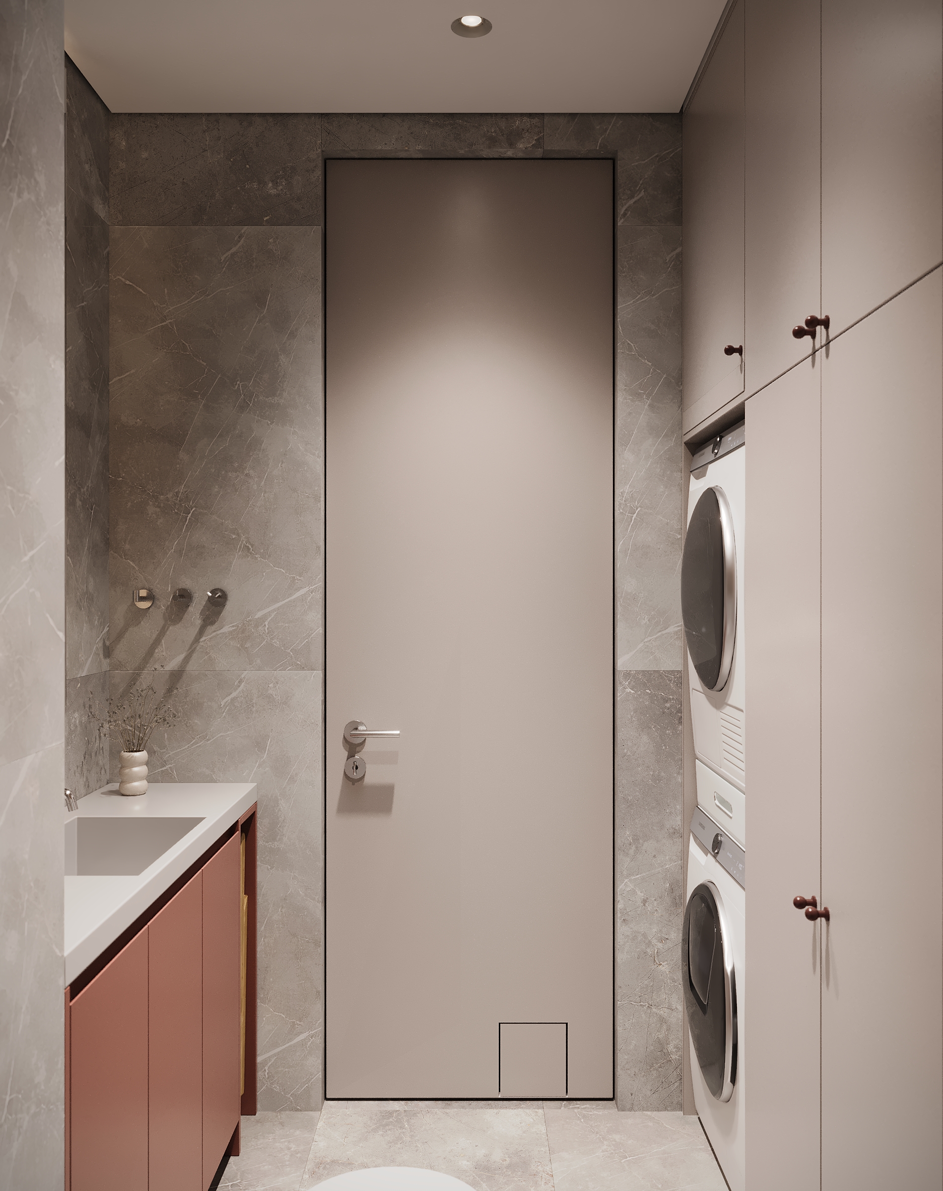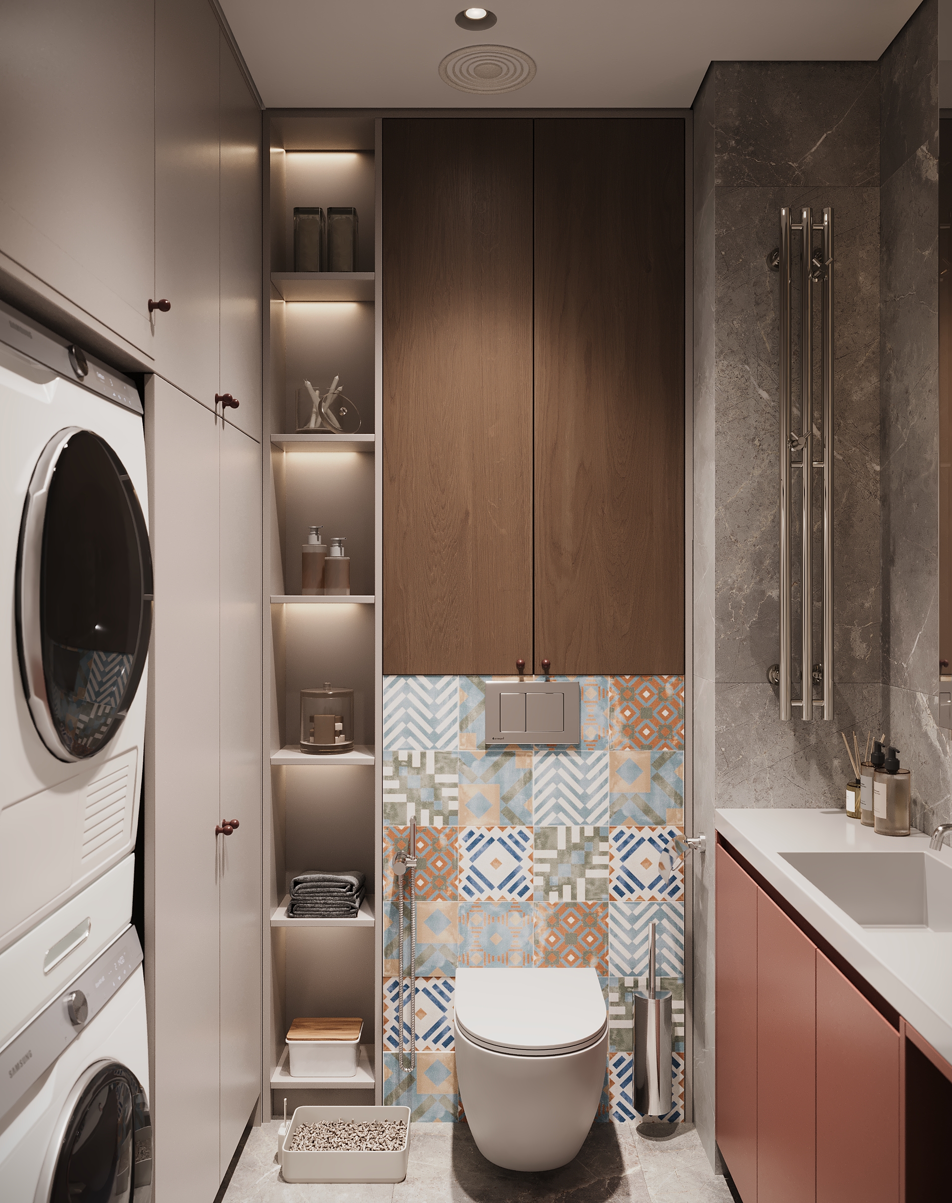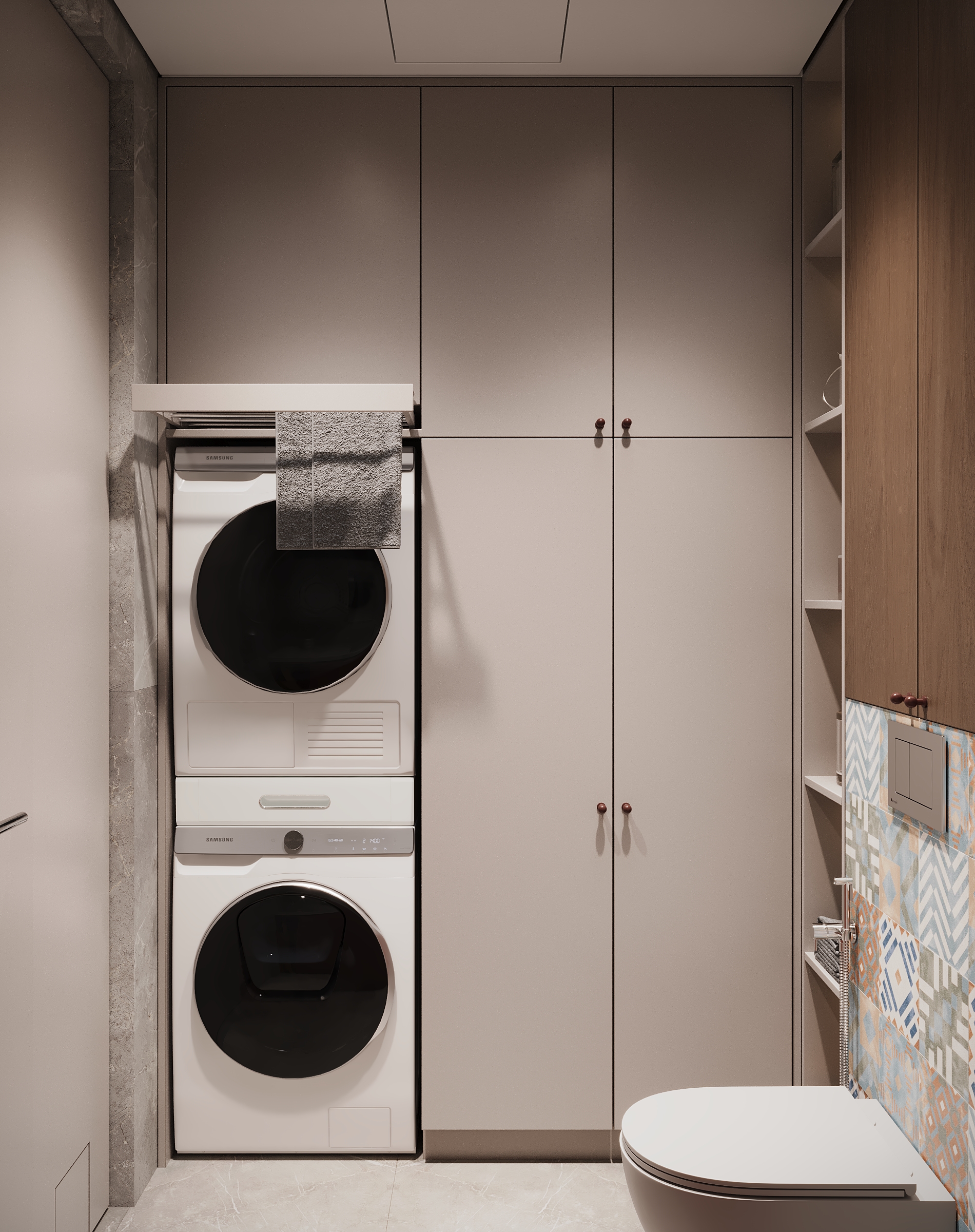 Пространство постирочной объединяет сразу несколько функций: здесь расположены стиральная и сушильная машины, встроенные системы хранения и удобные шкафы для белья и бытовой химии. Интерьер выдержан в спокойной палитре — серый кермогранит и теплое дерево дополнены акцентами терракотового цвета. Декоративная плитка с геометричным узором добавляет индивидуальности, а продуманное освещение и скрытые системы делают пространство комфортным для повседневного использования.