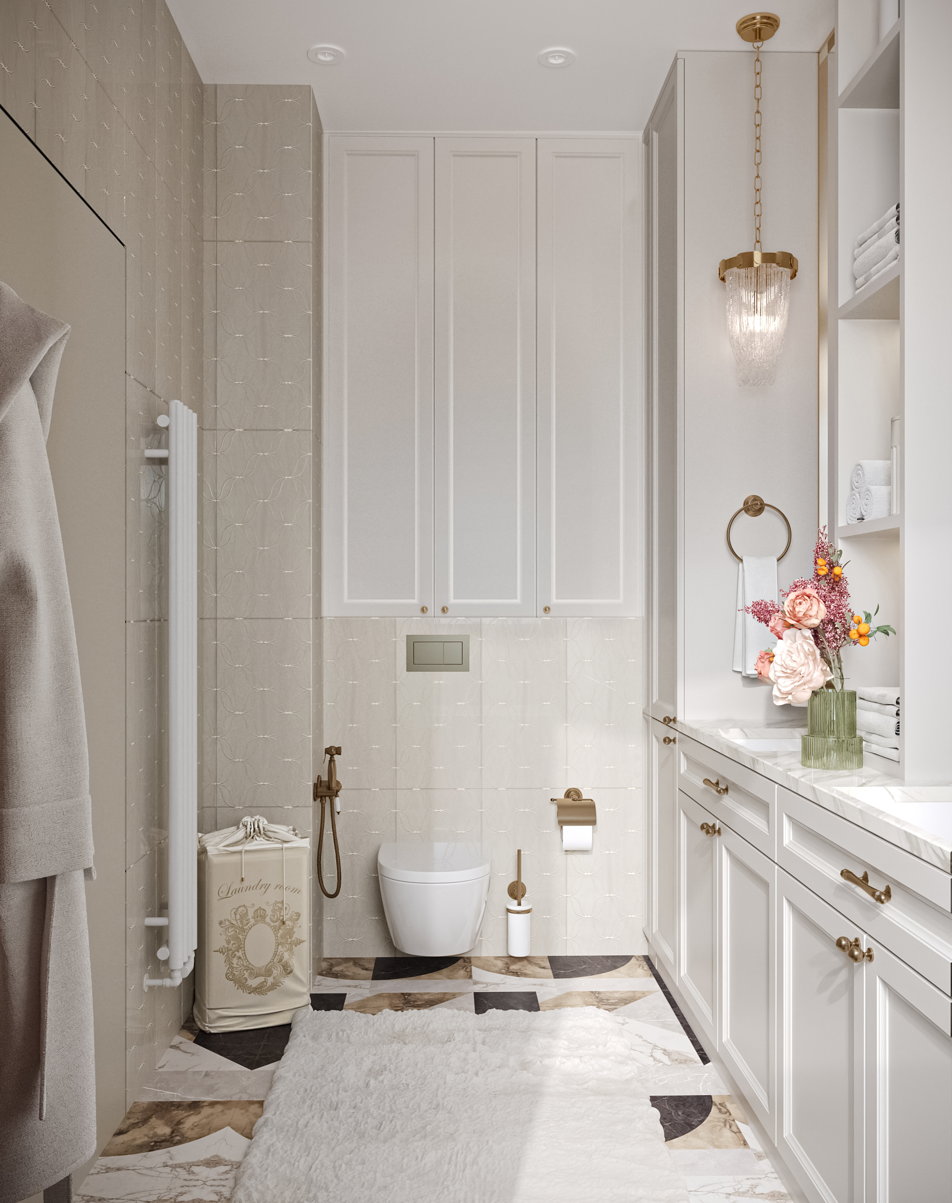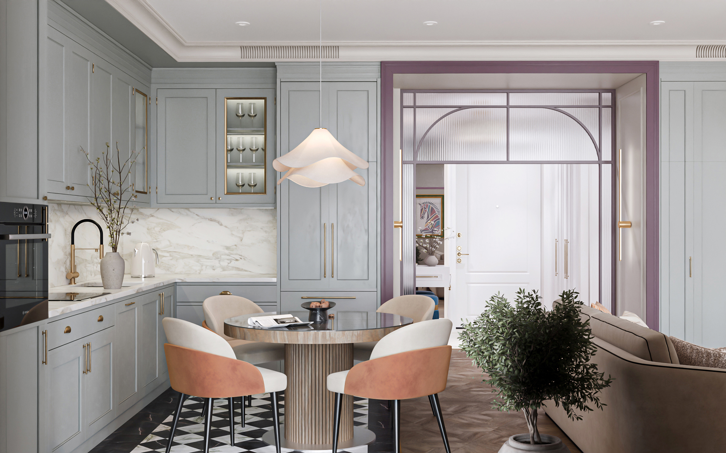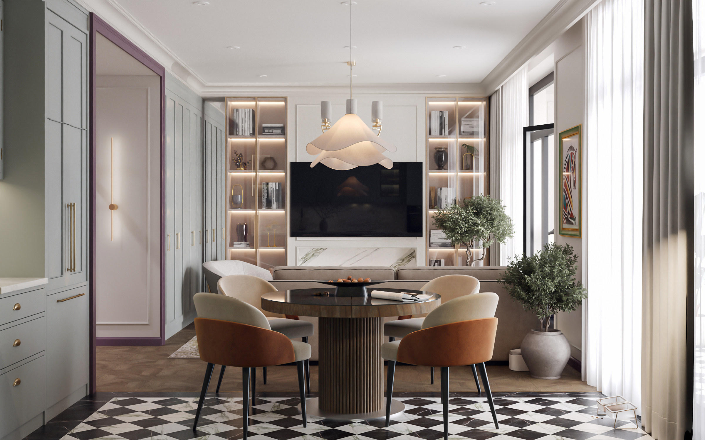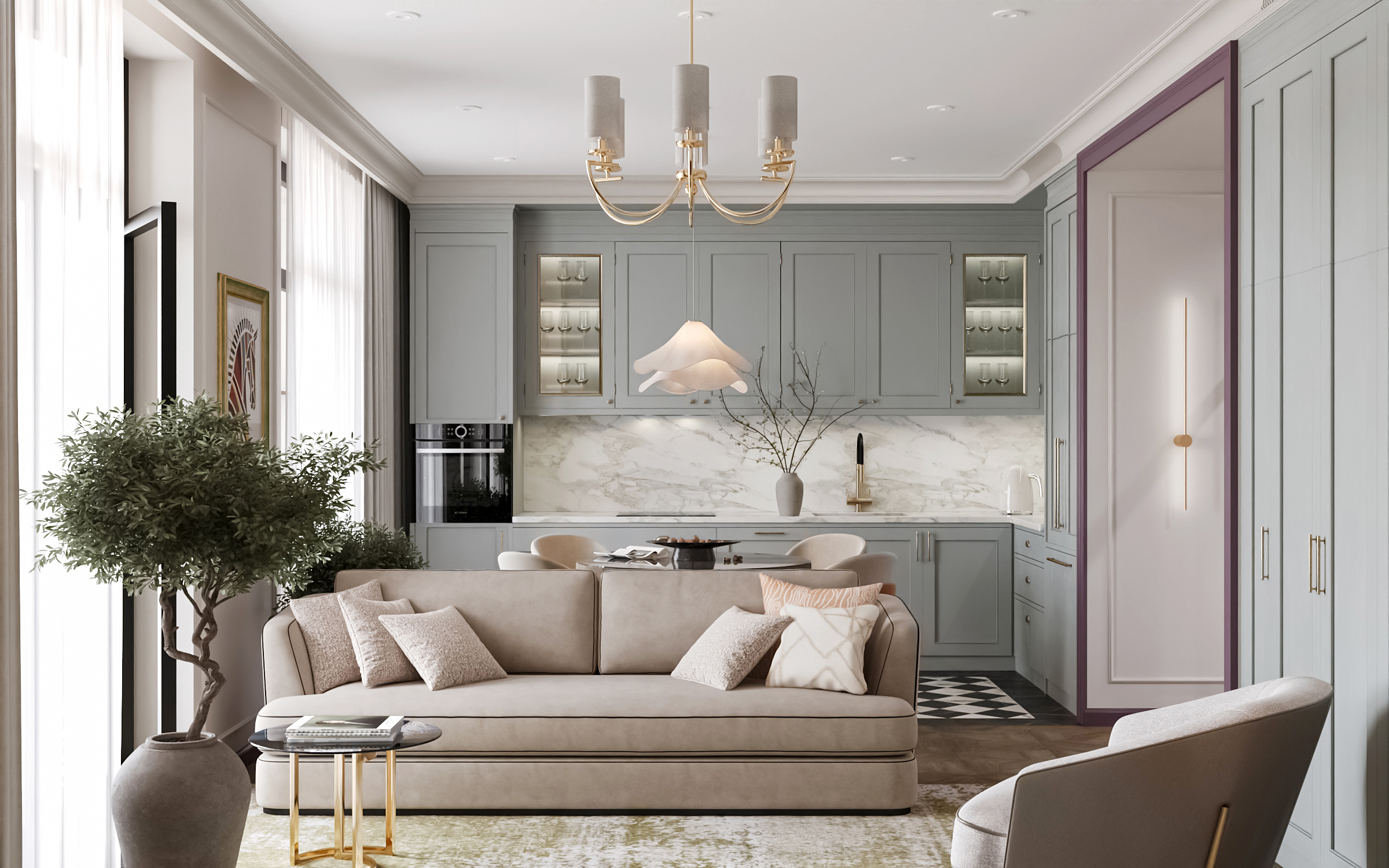 Гостиная с кухней и столовой стала сердцем квартиры — здесь можно собираться всей семьёй и принимать гостей. Гардеробные и постирочная позволяют поддерживать порядок, а продуманное зонирование делает квартиру не только эстетичной, но и по-настоящему удобной для динамичной семейной жизни. Это современное пространство, в котором комфорт сочетается с элегантностью, а свет и простор становятся главными акцентами интерьера.