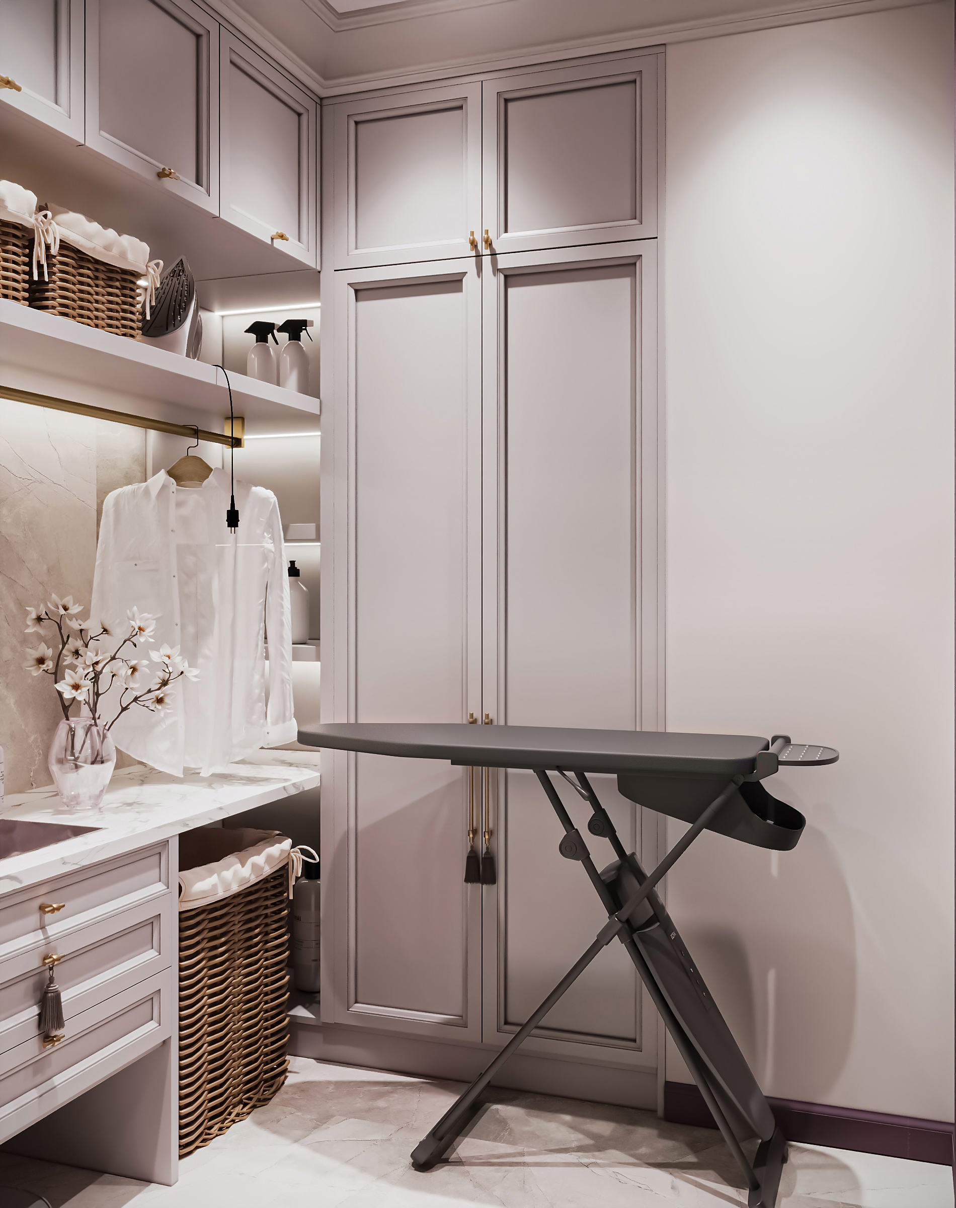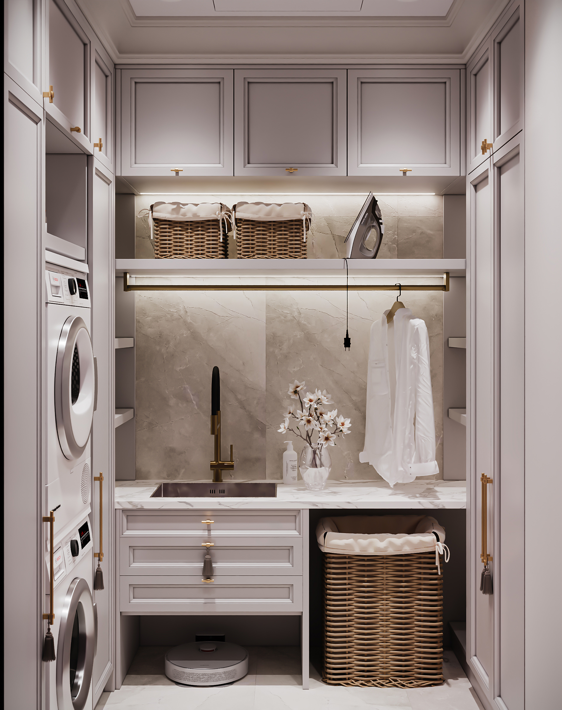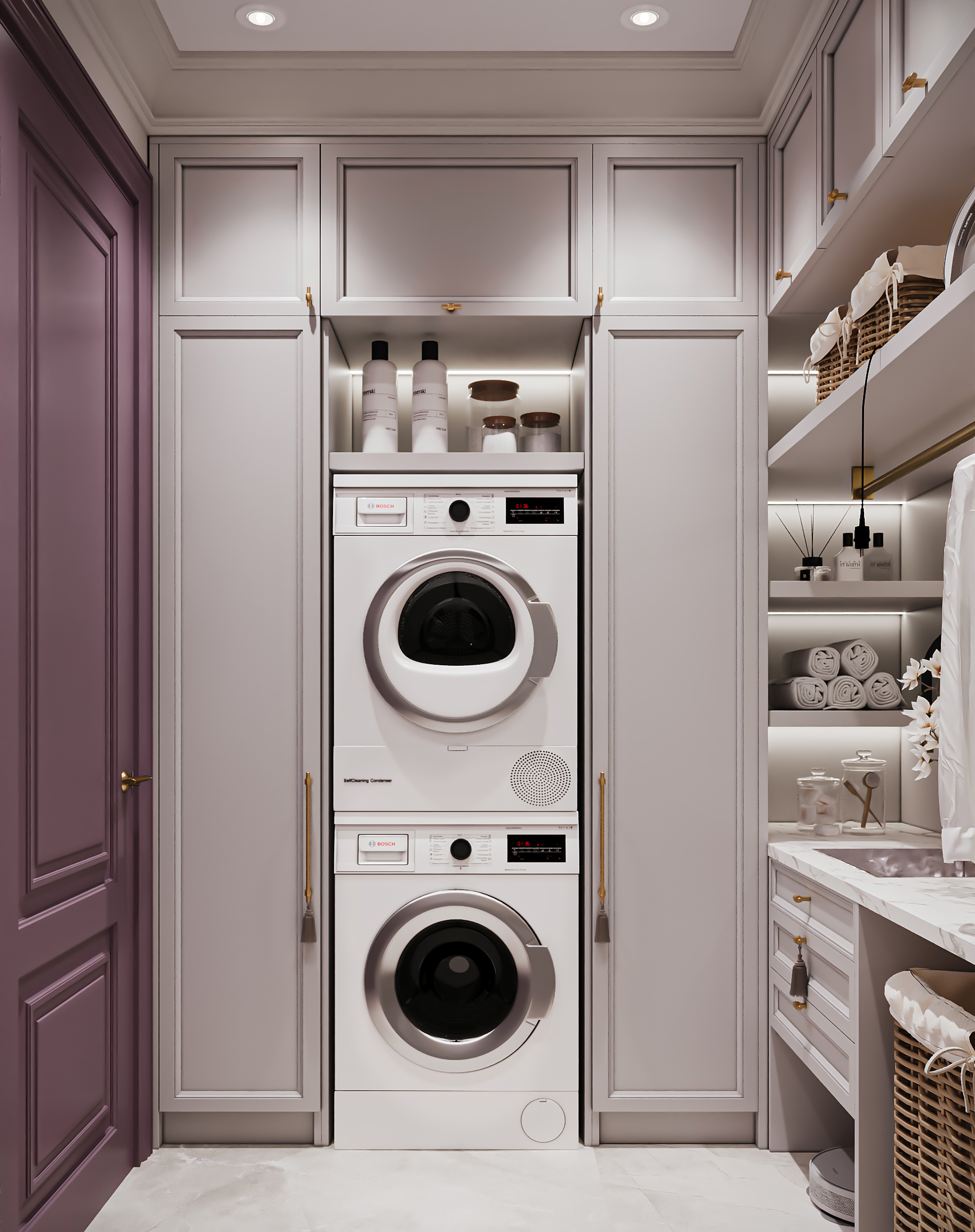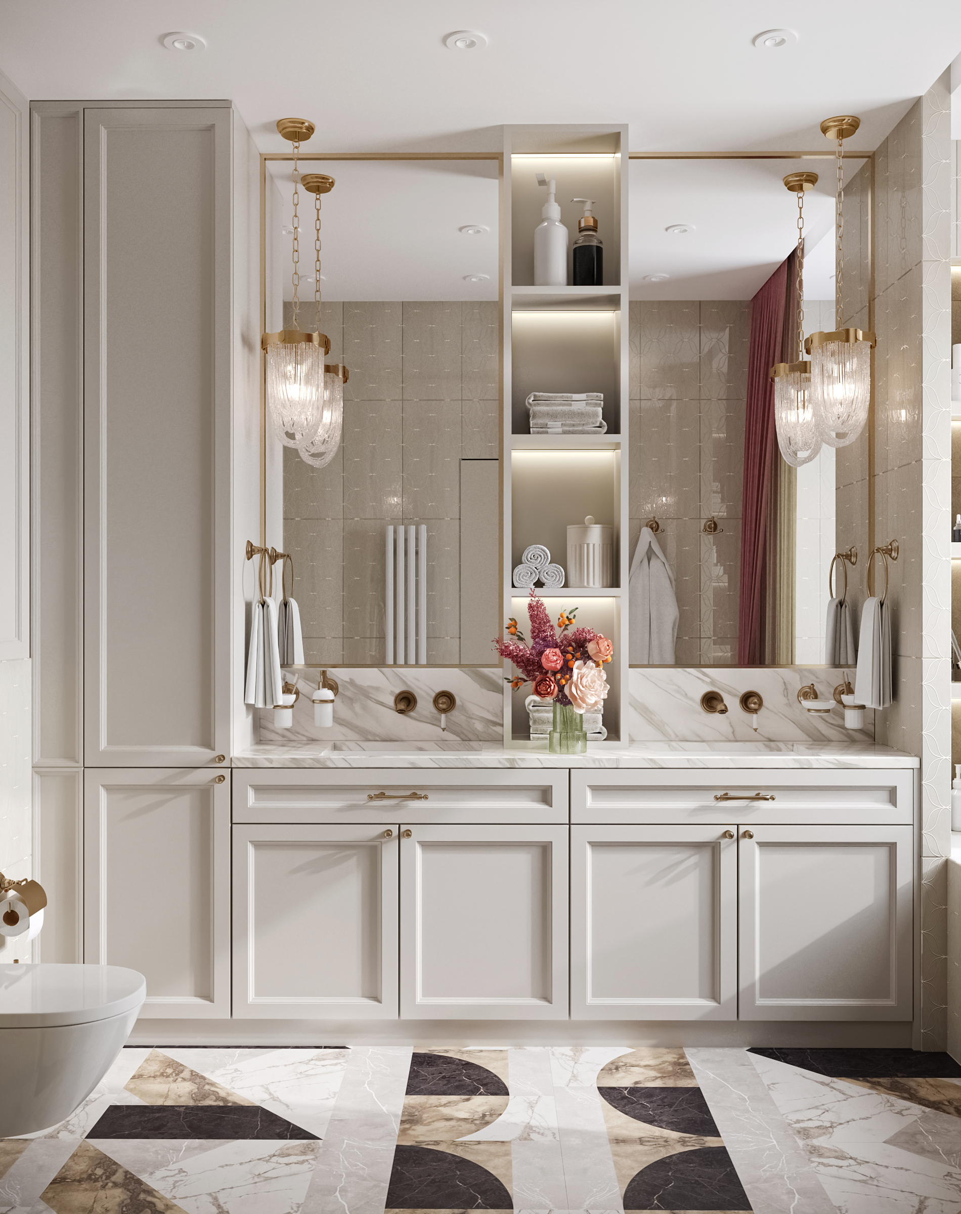 Гостиная с кухней и столовой стала сердцем квартиры — здесь можно собираться всей семьёй и принимать гостей. Гардеробные и постирочная позволяют поддерживать порядок, а продуманное зонирование делает квартиру не только эстетичной, но и по-настоящему удобной для динамичной семейной жизни. Это современное пространство, в котором комфорт сочетается с элегантностью, а свет и простор становятся главными акцентами интерьера.