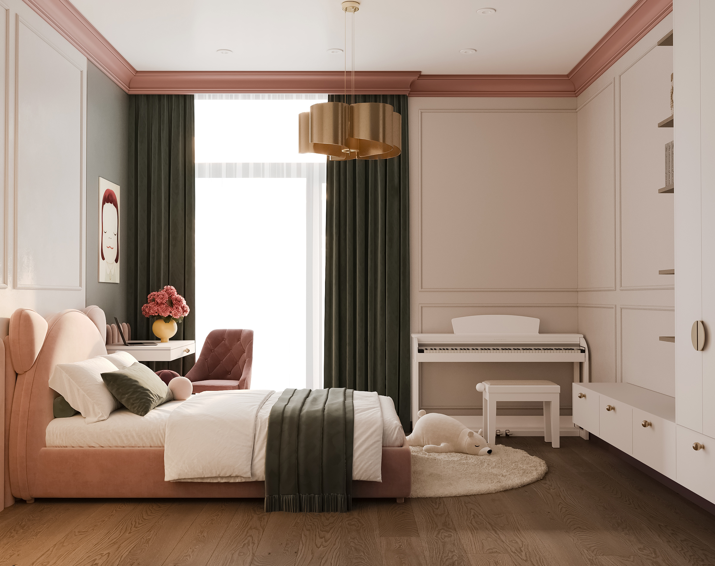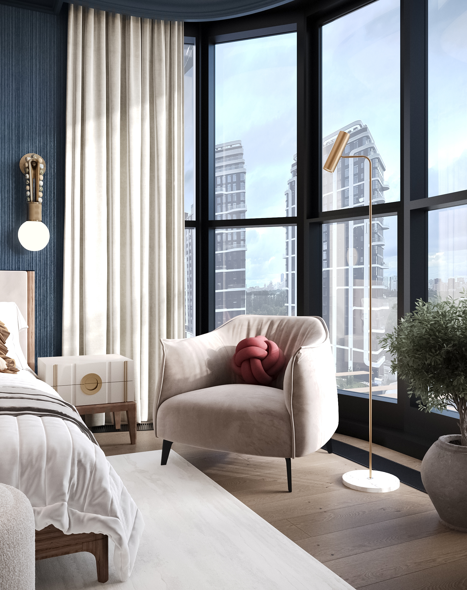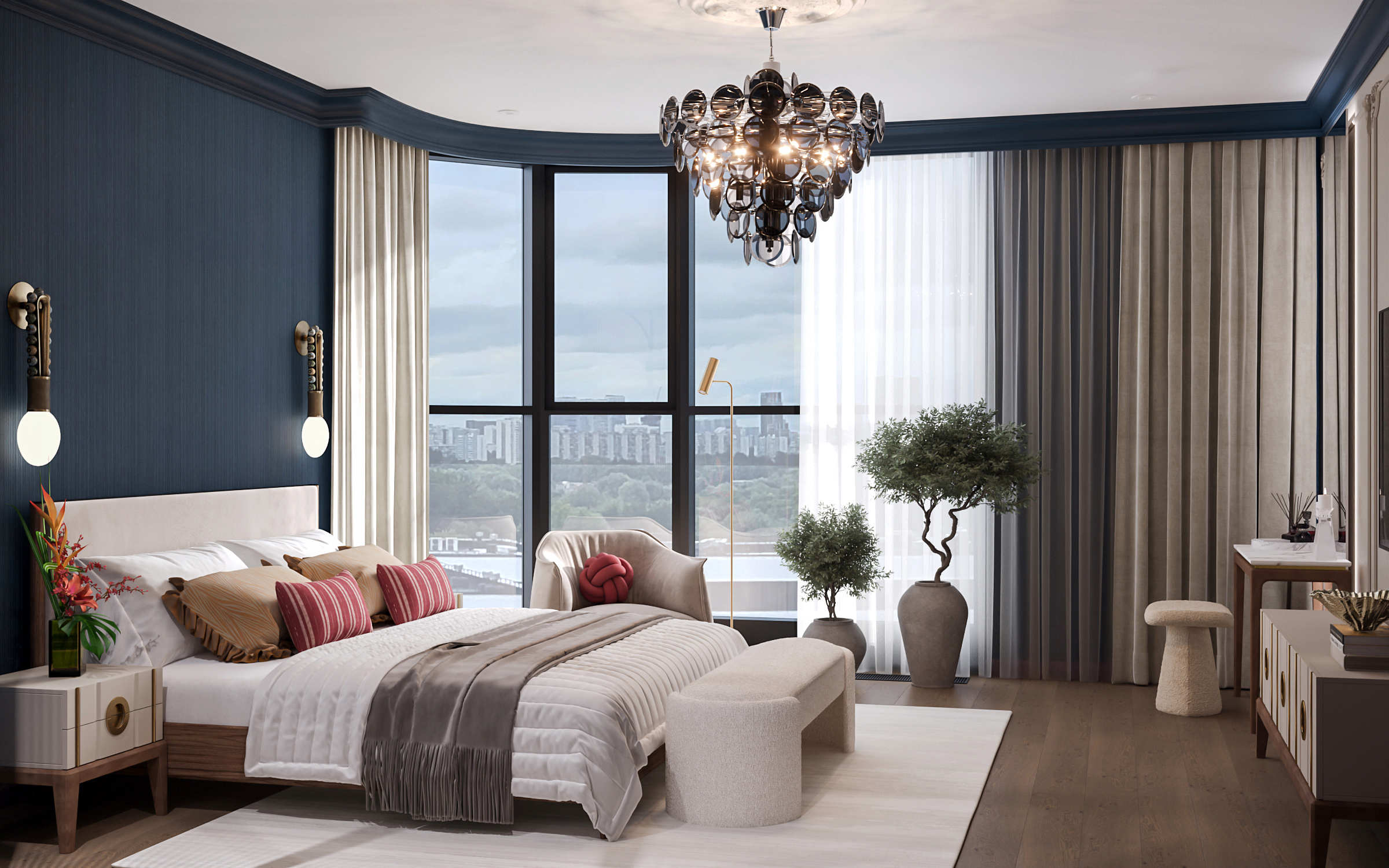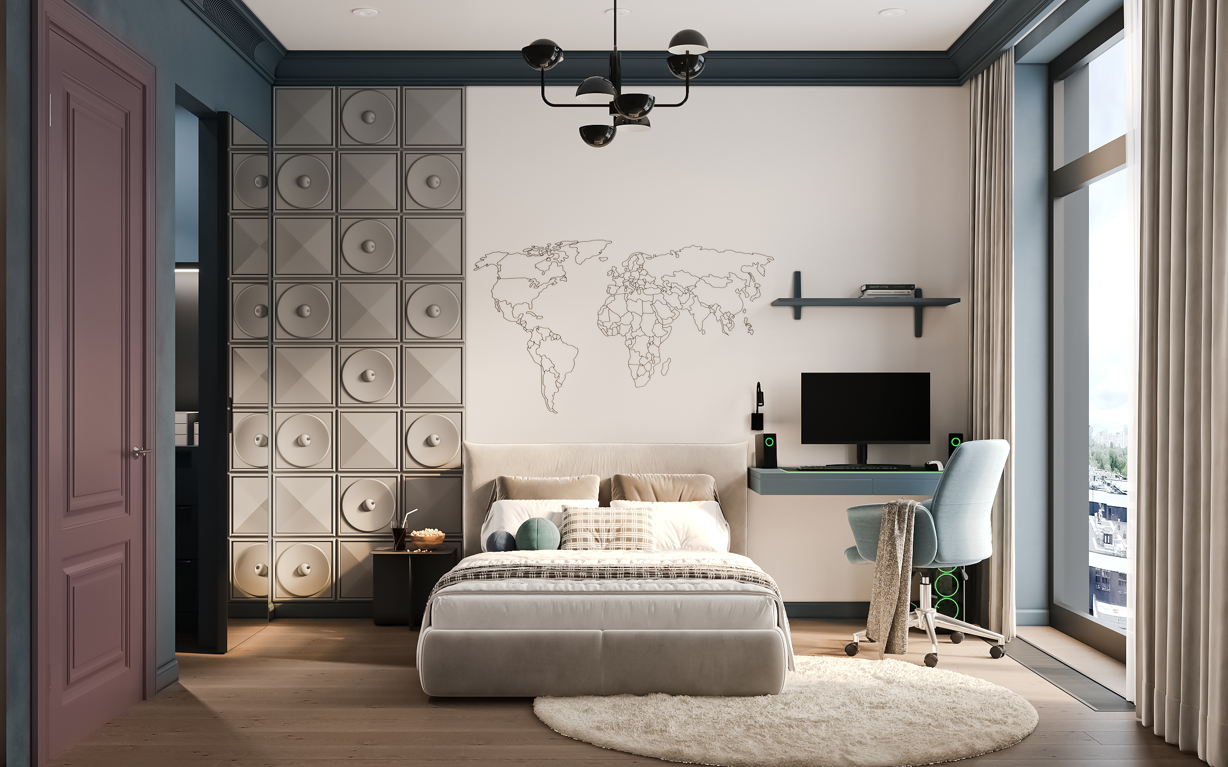 Эта просторная квартира в ЖК «Остров» создана для семьи: супруги и двое детей — мальчик и девочка. Планировка выстроена так, чтобы у каждого было своё пространство и одновременно сохранялось ощущение единого дома. Панорамные окна наполняют интерьер светом, подчеркивая воздушность и свежесть нового пространства. В мастер-спальне предусмотрена гардеробная и собственная ванная, а детские комнаты расположены так, чтобы быть рядом, но не мешать друг другу.