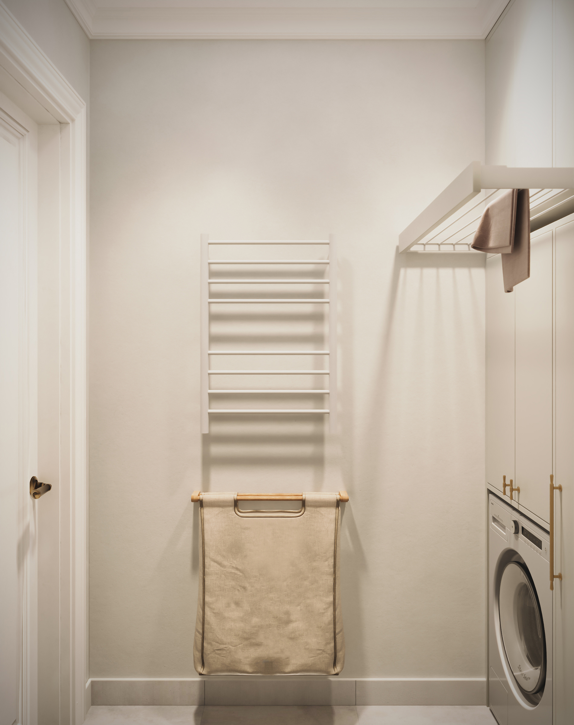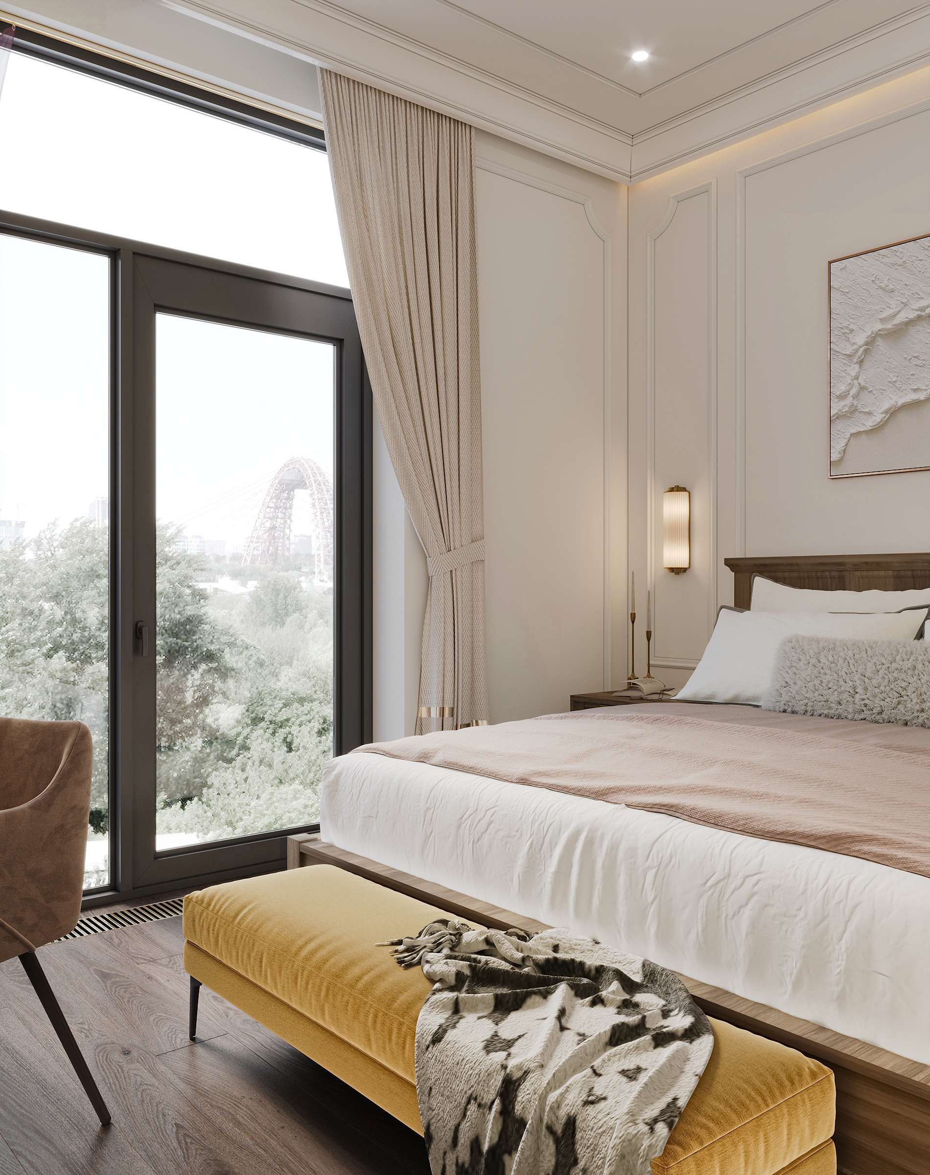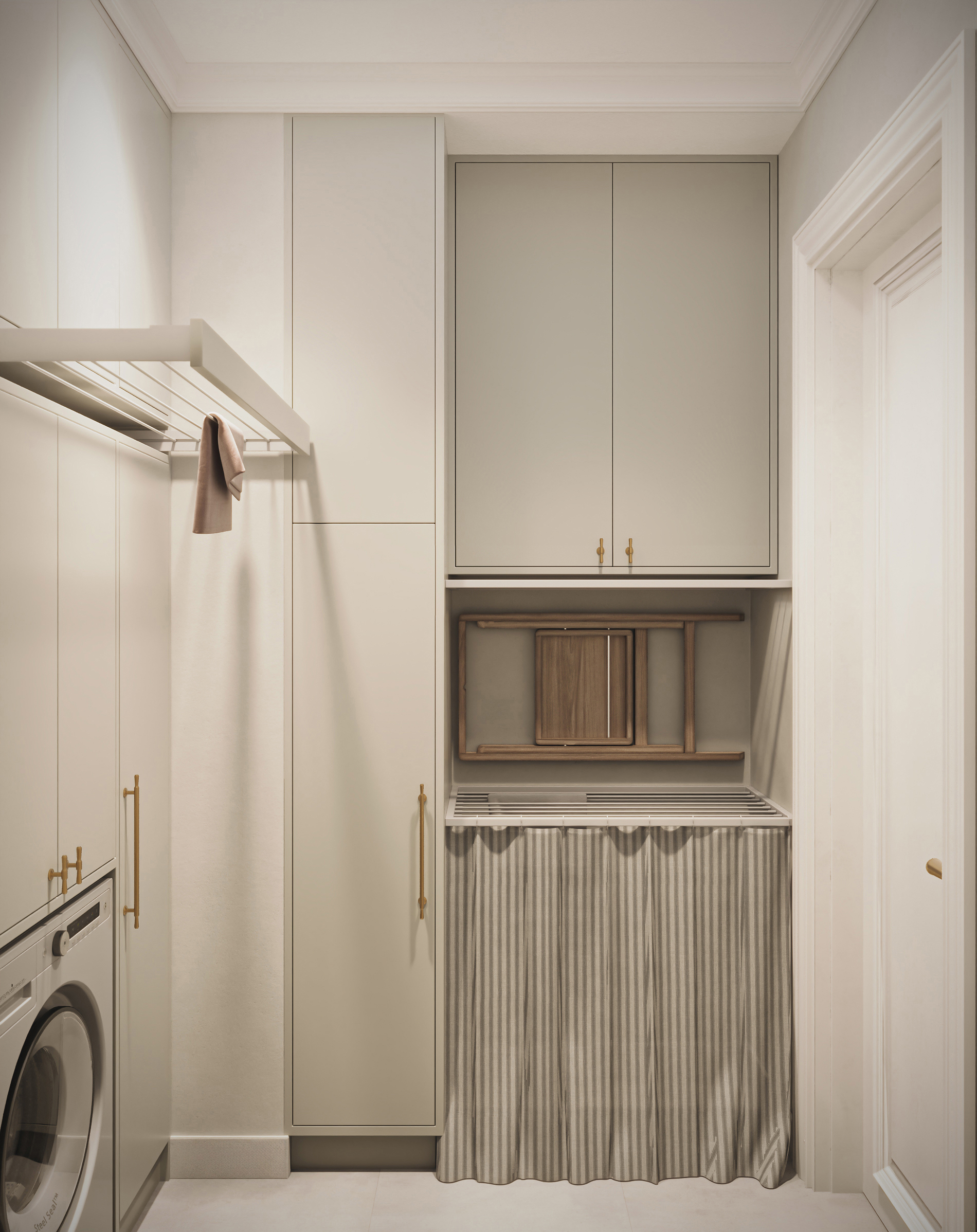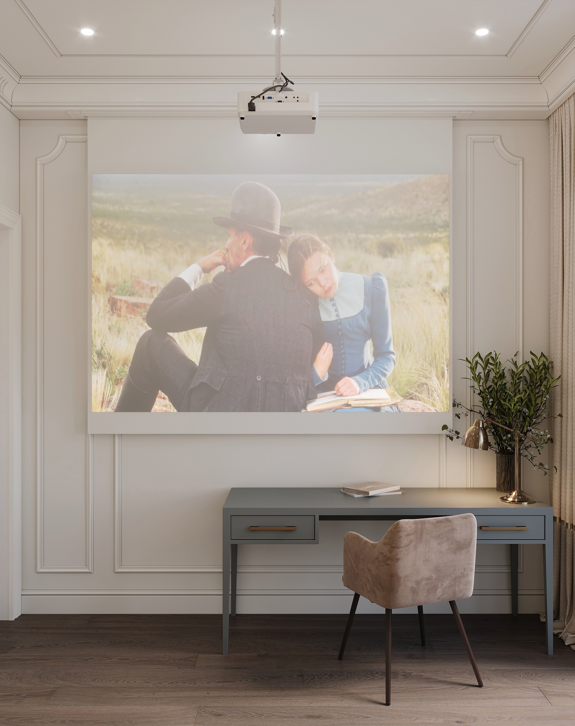 Основой проекта стало желание заказчиков соединить традиционную эстетику с необычными акцентами, отражающими их характер и образ жизни. Отсюда большое использование локального нейтрального оттенка айвори в сочетании с яркими деталями. Также в этом проекте вы не увидите ни одного телевизора, поскольку их место занимает встроенный проектор.