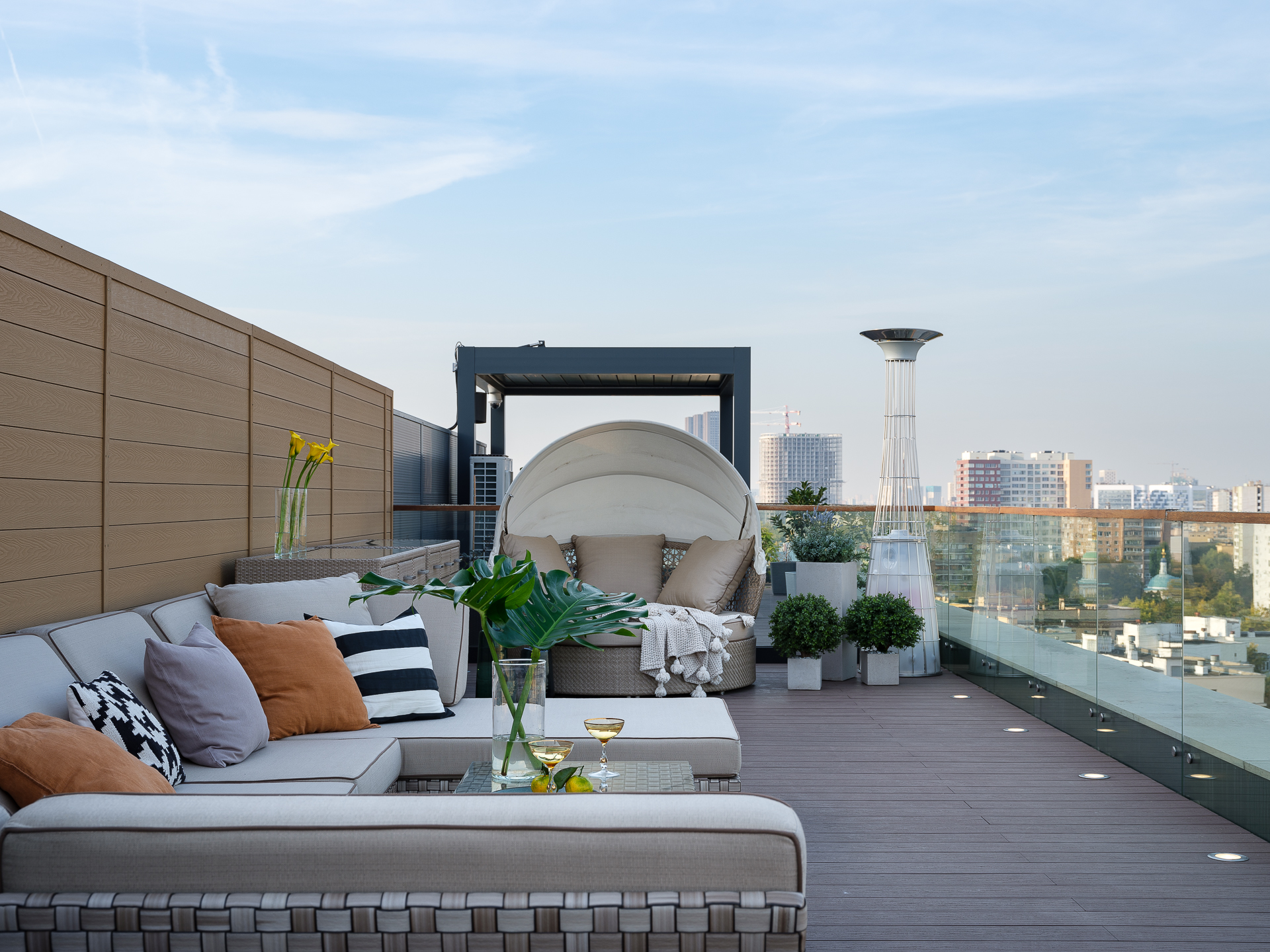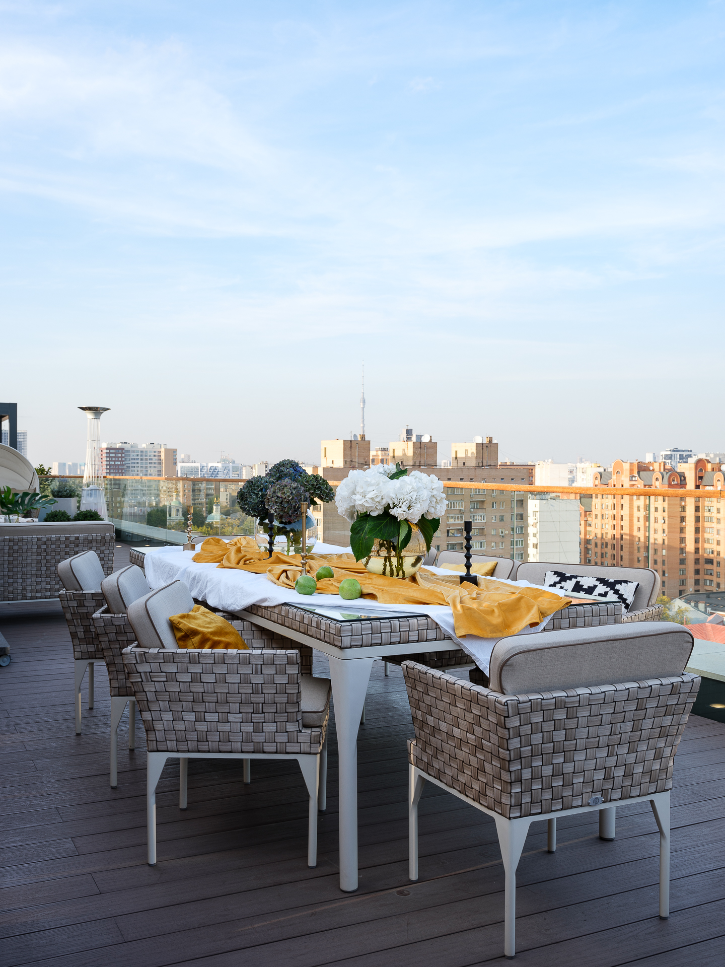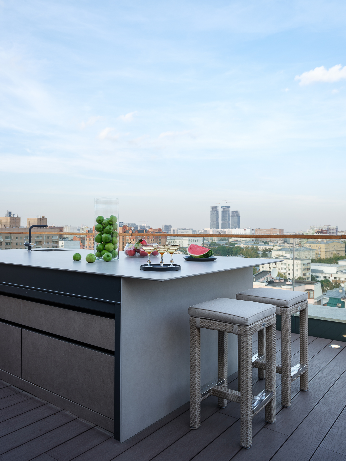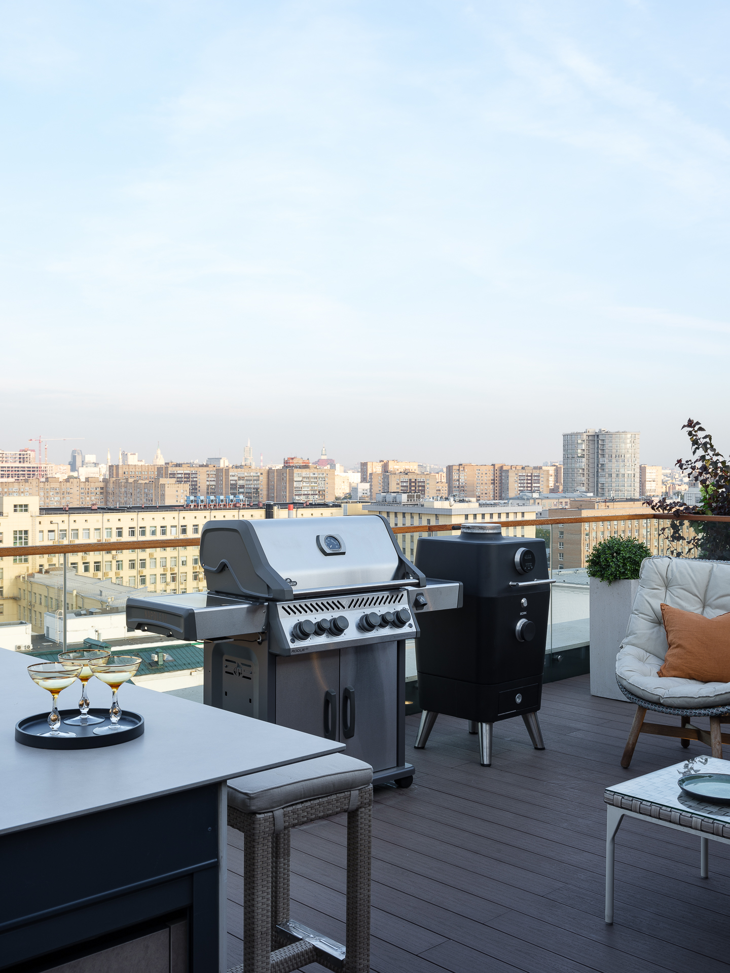 Просторная приватная терраса с видом на центр Москвы. В распоряжение хозяев квартиры отдан целый участок кровли. На нем разместились зона отдыха с диваном и отдельной чиллаут-зоной в виде закрытого плетеного кресла-"яйца". Основной приоритет отдан обеденной зоне под зонтом от солнца и барбекю с барной стойкой. Стойка появилась не случайно: в этом месте располагается некрасивый технический короб, который таким образом замаскирован от посторонних глаз. К острову даже удалось подвести воду. Вся мебель в нейтральных цветах подобрана у компании Outdoor Stylist, на полу - террасная доска.