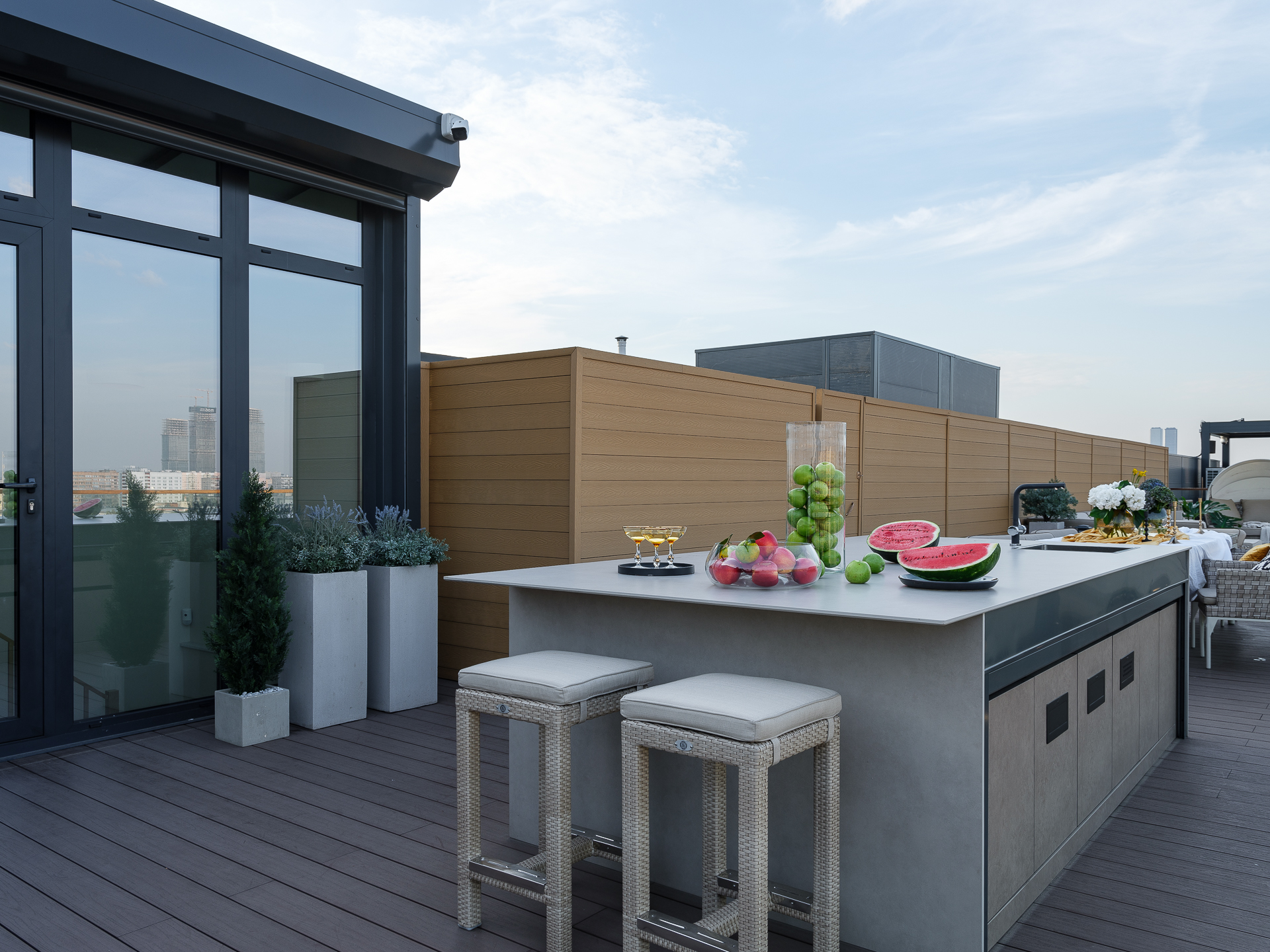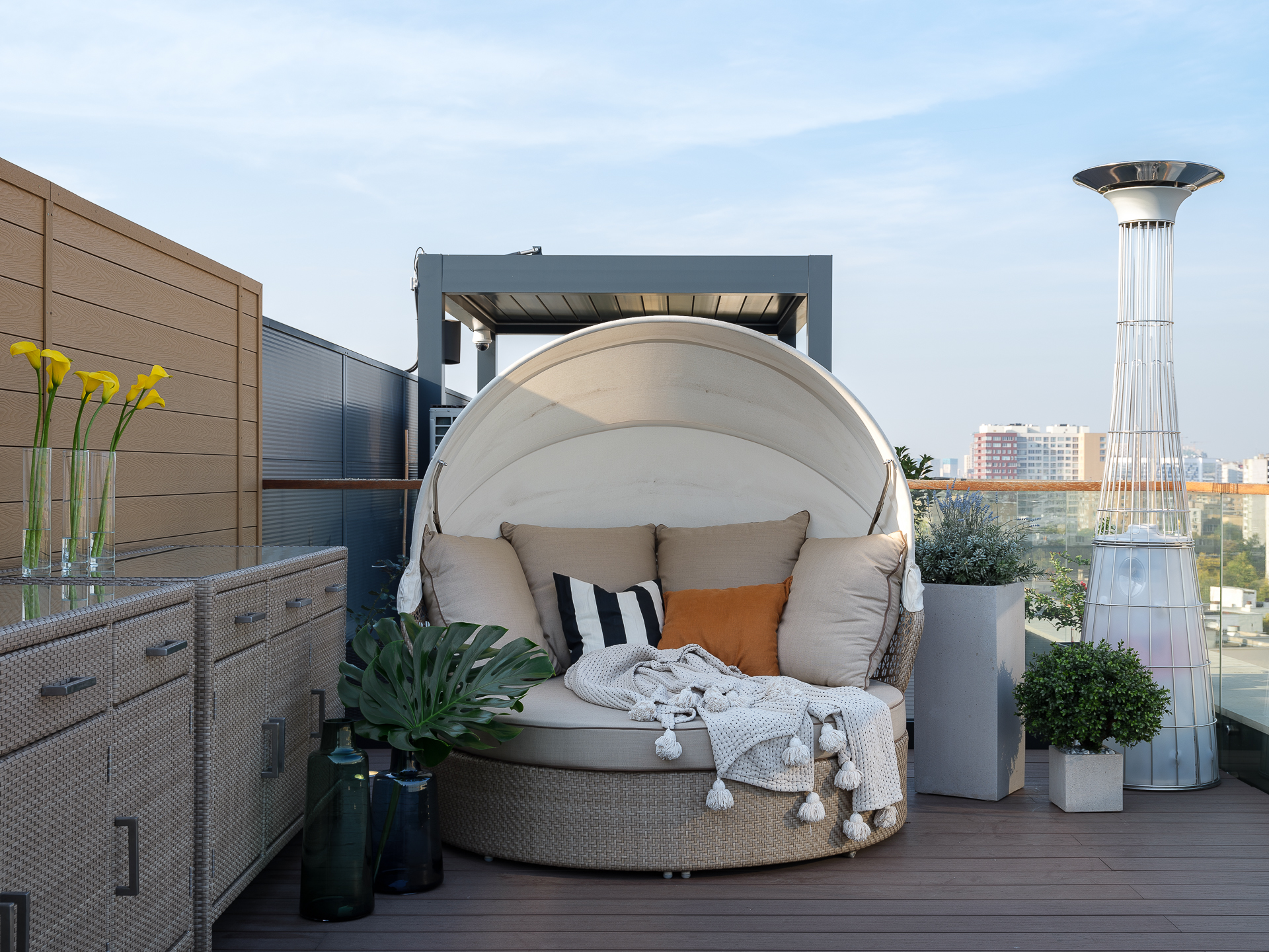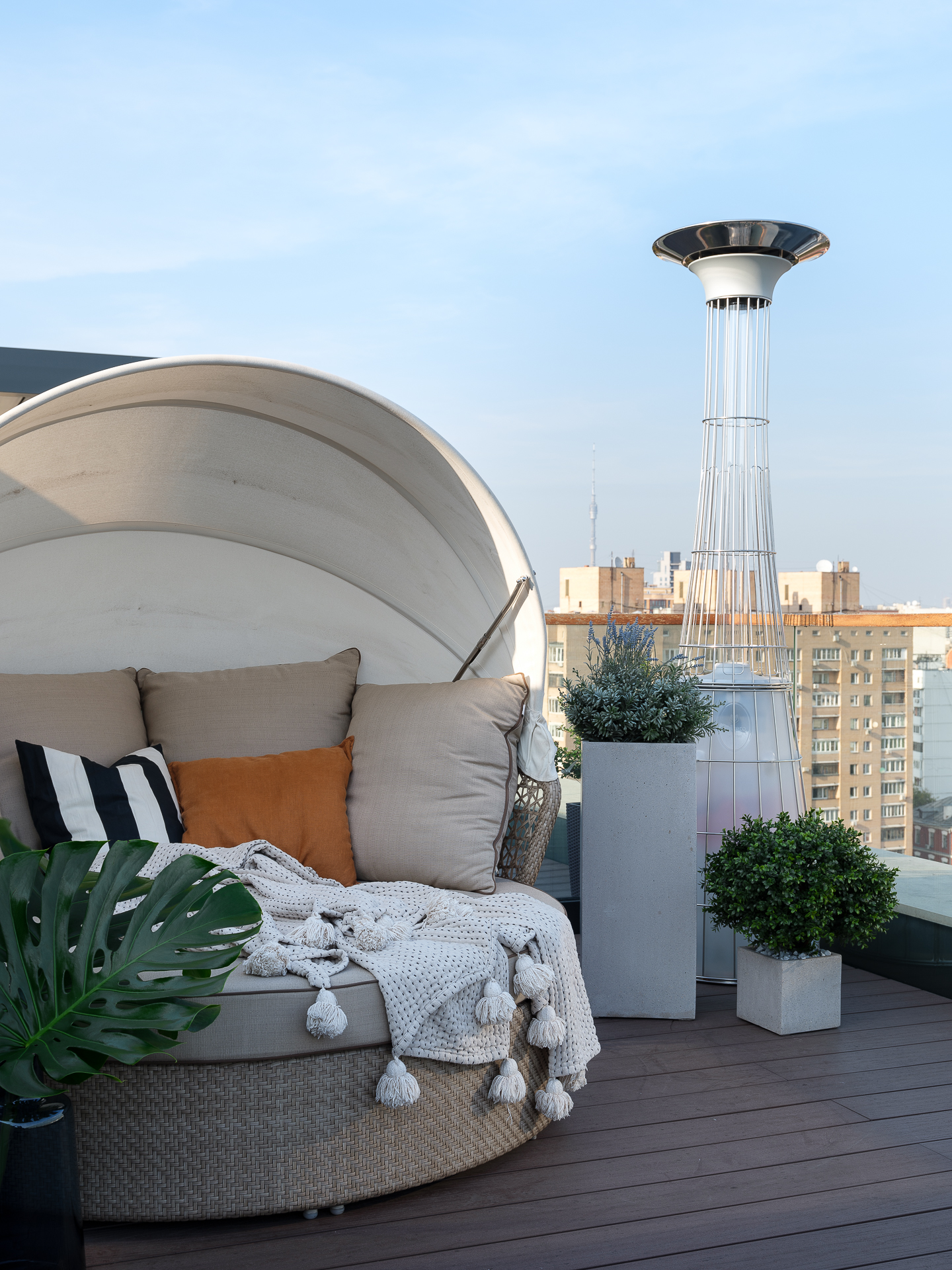 Просторная приватная терраса с видом на центр Москвы. В распоряжение хозяев квартиры отдан целый участок кровли. На нем разместились зона отдыха с диваном и отдельной чиллаут-зоной в виде закрытого плетеного кресла-"яйца". Основной приоритет отдан обеденной зоне под зонтом от солнца и барбекю с барной стойкой. Стойка появилась не случайно: в этом месте располагается некрасивый технический короб, который таким образом замаскирован от посторонних глаз. К острову даже удалось подвести воду. Вся мебель в нейтральных цветах подобрана у компании Outdoor Stylist, на полу - террасная доска.
