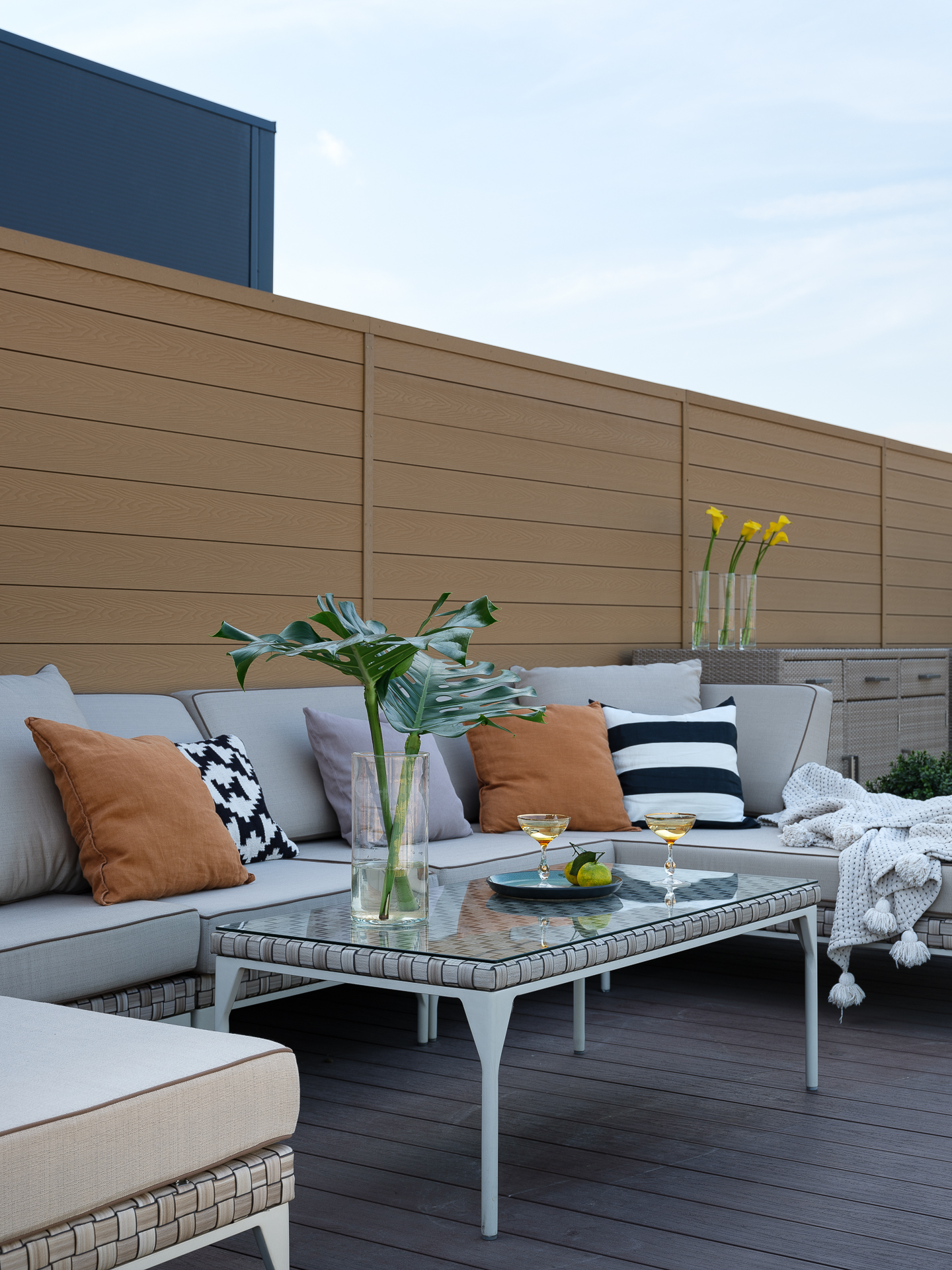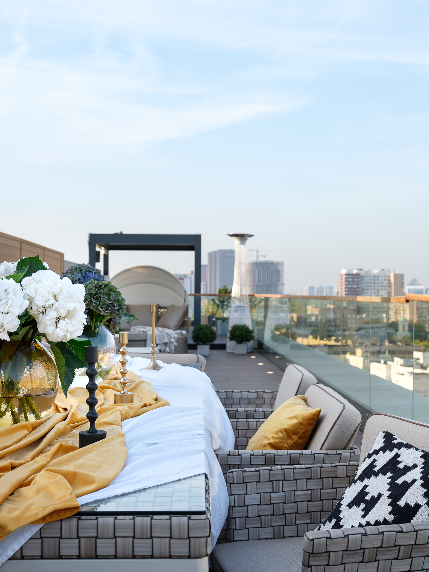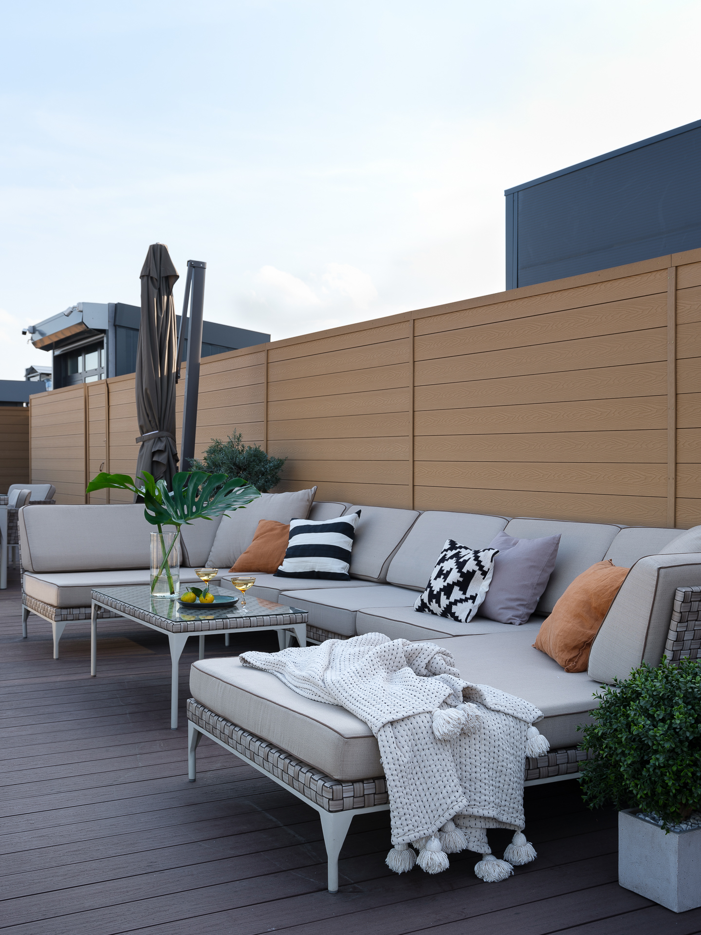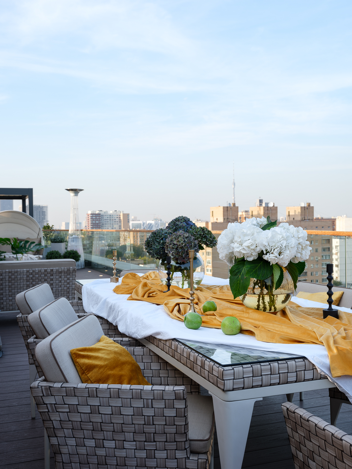 Просторная приватная терраса с видом на центр Москвы. В распоряжение хозяев квартиры отдан целый участок кровли. На нем разместились зона отдыха с диваном и отдельной чиллаут-зоной в виде закрытого плетеного кресла-"яйца". Основной приоритет отдан обеденной зоне под зонтом от солнца и барбекю с барной стойкой. Стойка появилась не случайно: в этом месте располагается некрасивый технический короб, который таким образом замаскирован от посторонних глаз. К острову даже удалось подвести воду. Вся мебель в нейтральных цветах подобрана у компании Outdoor Stylist, на полу - террасная доска.