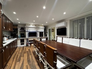 Также в помещении есть все для удобства: большая вместительная кухня для готовки, огромный стол из дуба с резным подстольем, стулья и скамья, чтобы разместить около 12 человек.