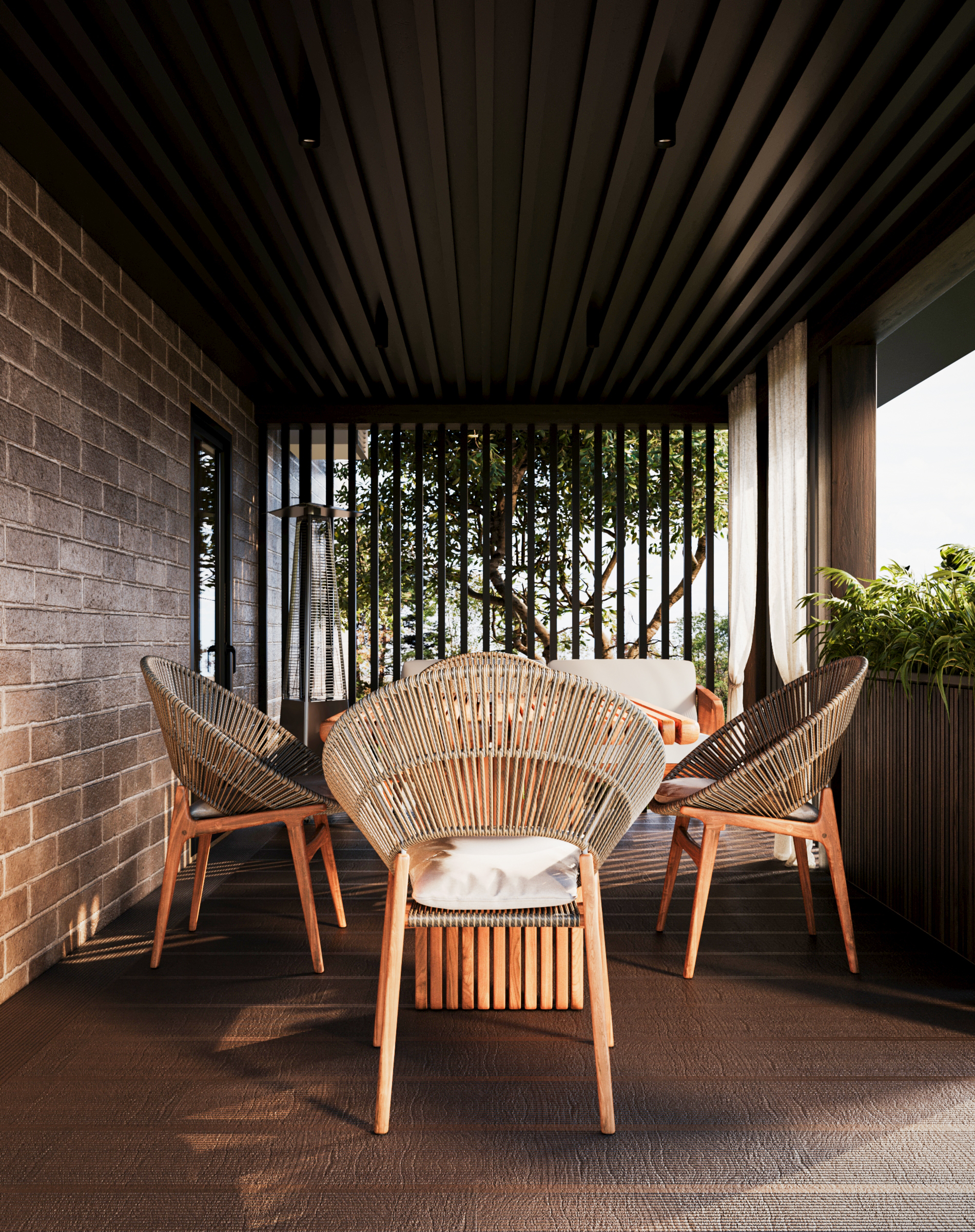 Совмещение элементов природы с современными акцентами в отделке, текстурах, шторах и меблировке создаёт гармоничную атмосферу для отдыха на террасе.