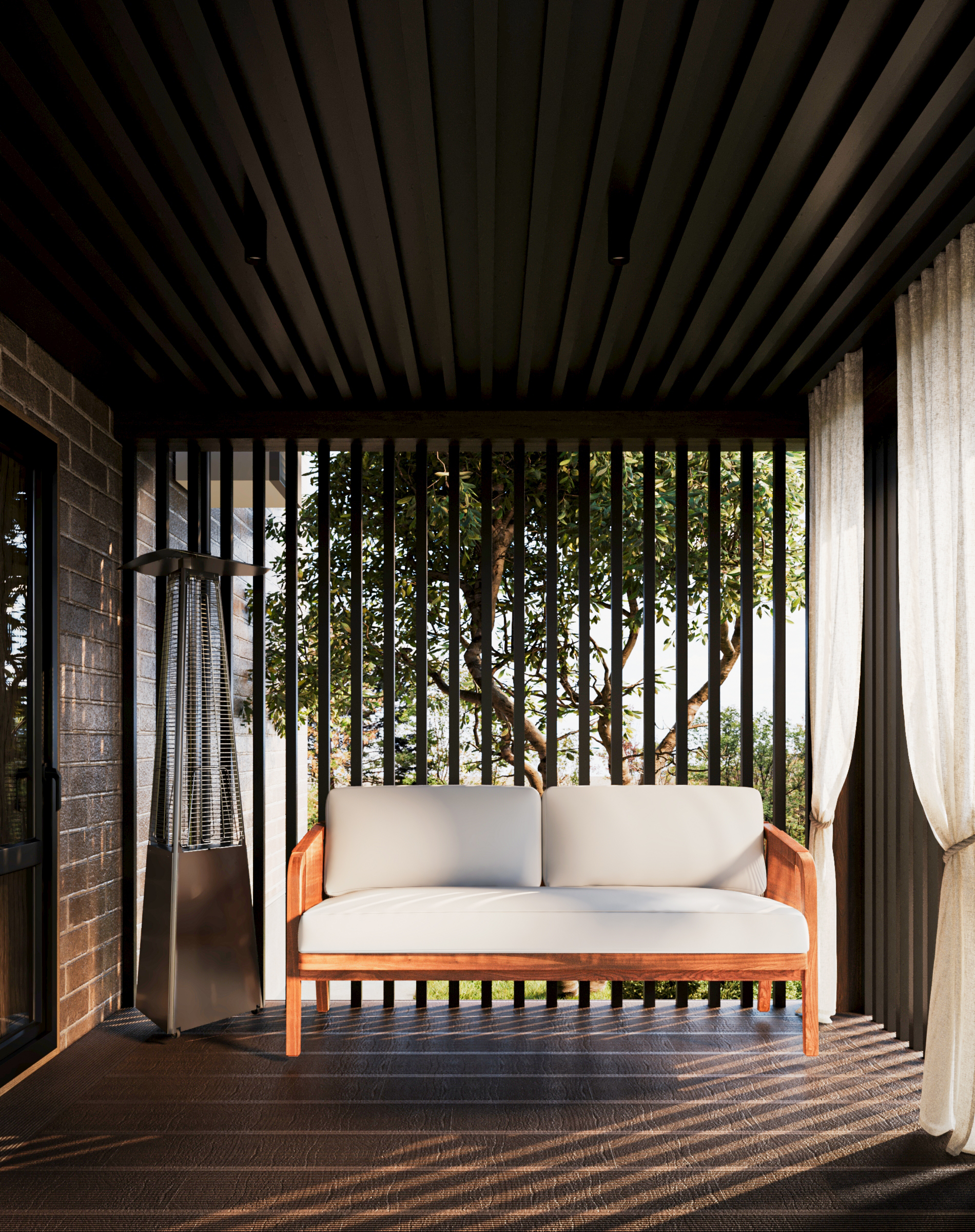 В глубине террасы расположен комфортный диван, окружённый зеленью и открытым пространством. Лёгкие шторы из натуральных тканей добавляют уюта и защищают от яркого солнца, сохраняя при этом визуальную лёгкость и воздух в пространстве. Деревянные вертикальные панели создают лёгкий визуальный барьер, не лишая террасу ощущения свободы и простора.
