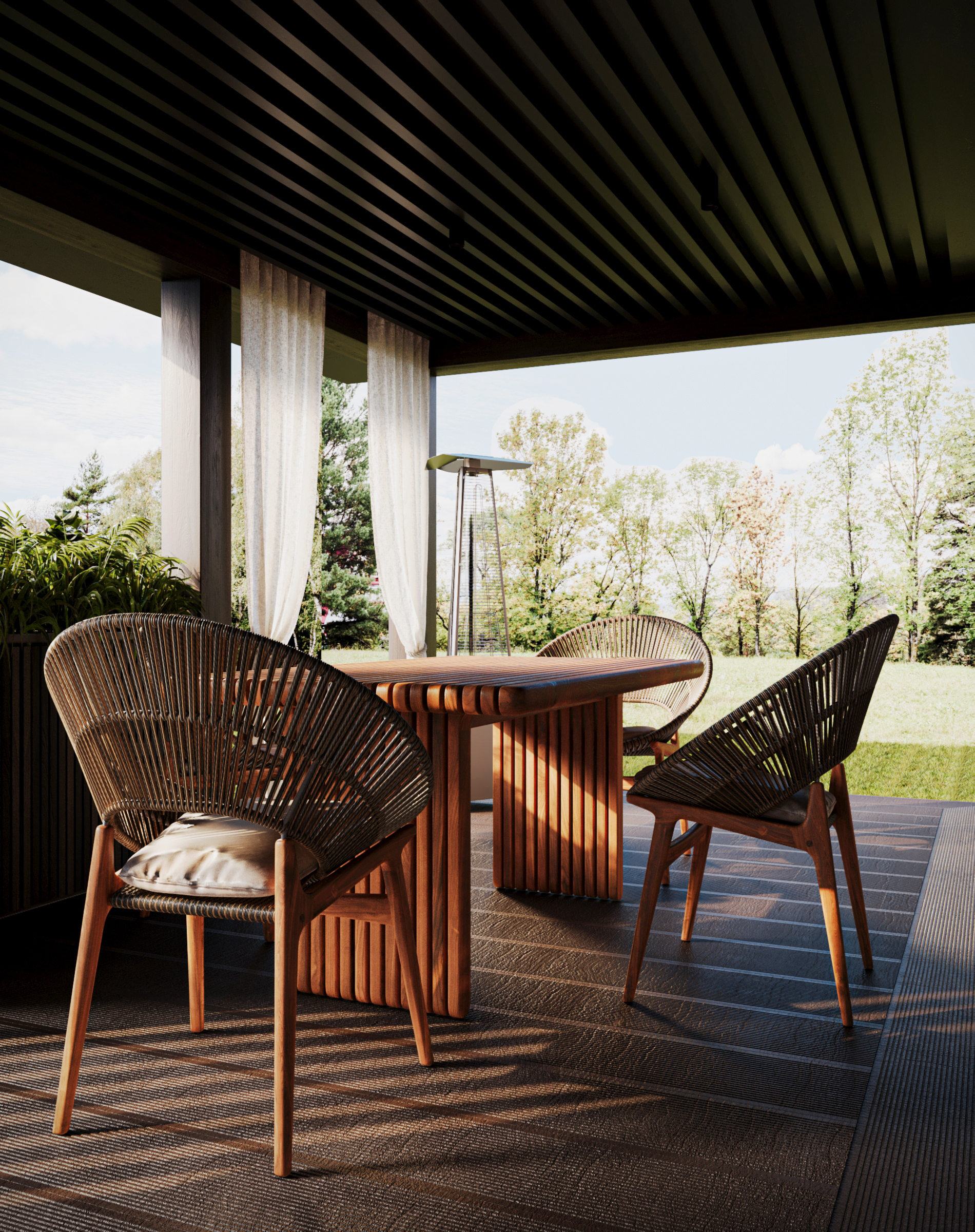 В центре террасы — обеденная зона с элегантными стульями и столом из дерева, идеально вписывающаяся в атмосферу уединённого уголка на свежем воздухе. Конструкция крыши и потолочные панели из дерева, выполненные в строгой геометрии, добавляют пространству стильную завершённость и уединённость.
