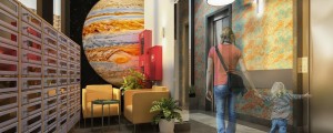 Поскольку ЖК называется "Парад Планет", основной темой стали планеты. Каждому подъезду присвоили индивидуальное космическое тело и решили интерьер в характерной цветовой гамме, сохранив при этом единый стиль и дизайнерские приемы. Планировочные решения у входных групп разные, но принципиально едино деление на тамбур, основную зону с лифтовым холлом и помещение для консьержа.